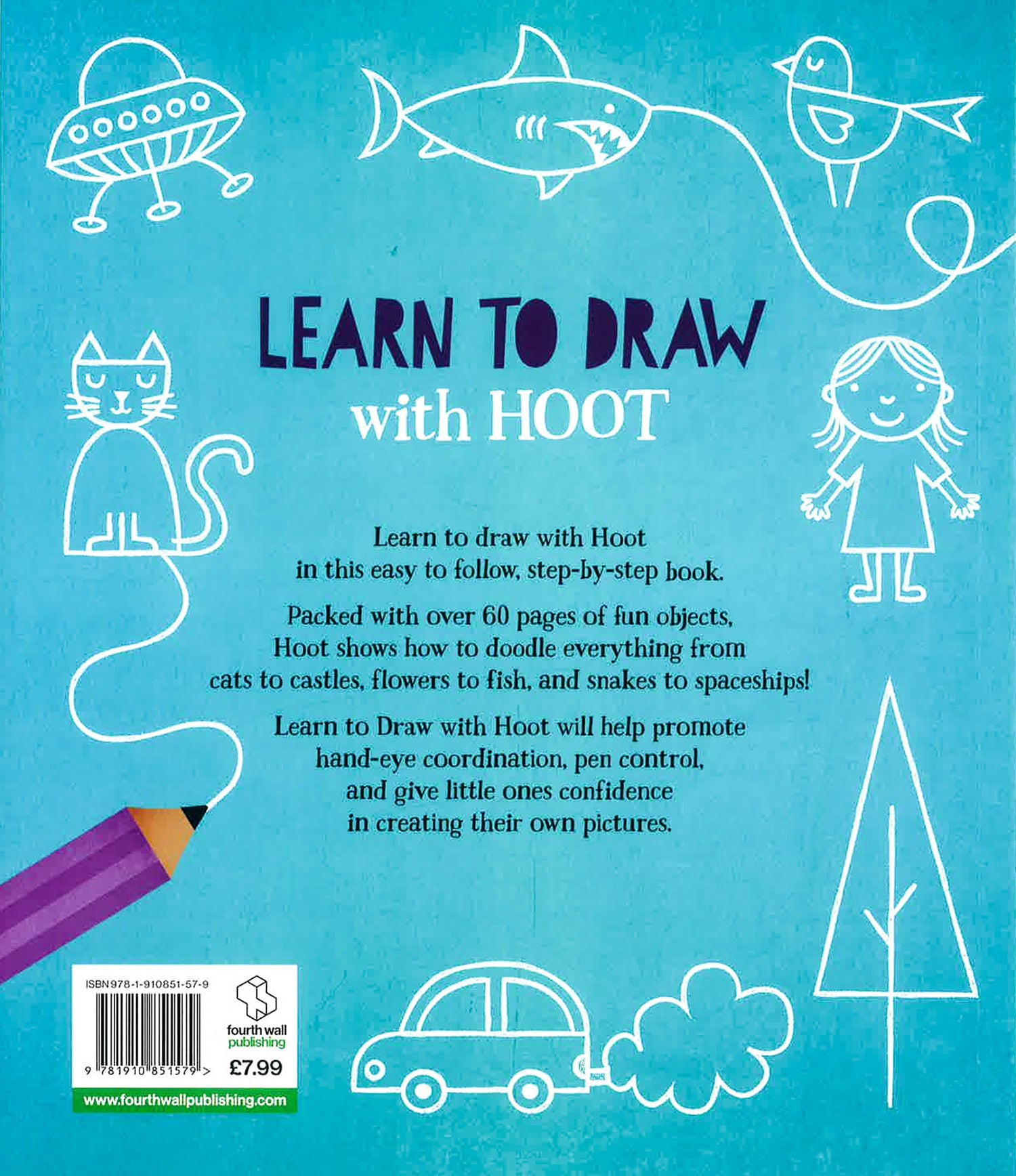 Learn To Draw With Hoot in this easy to follow, step by step books. Packed with over 60 pages of fun objects, Hoot shows how to doodle everything from cats to castles, flower to fish, and snakes to spaceships!. Learn to Draw with Hoot will help promote hand-eye coordination, pen control, and give little ones confidence in creating their own pictures.