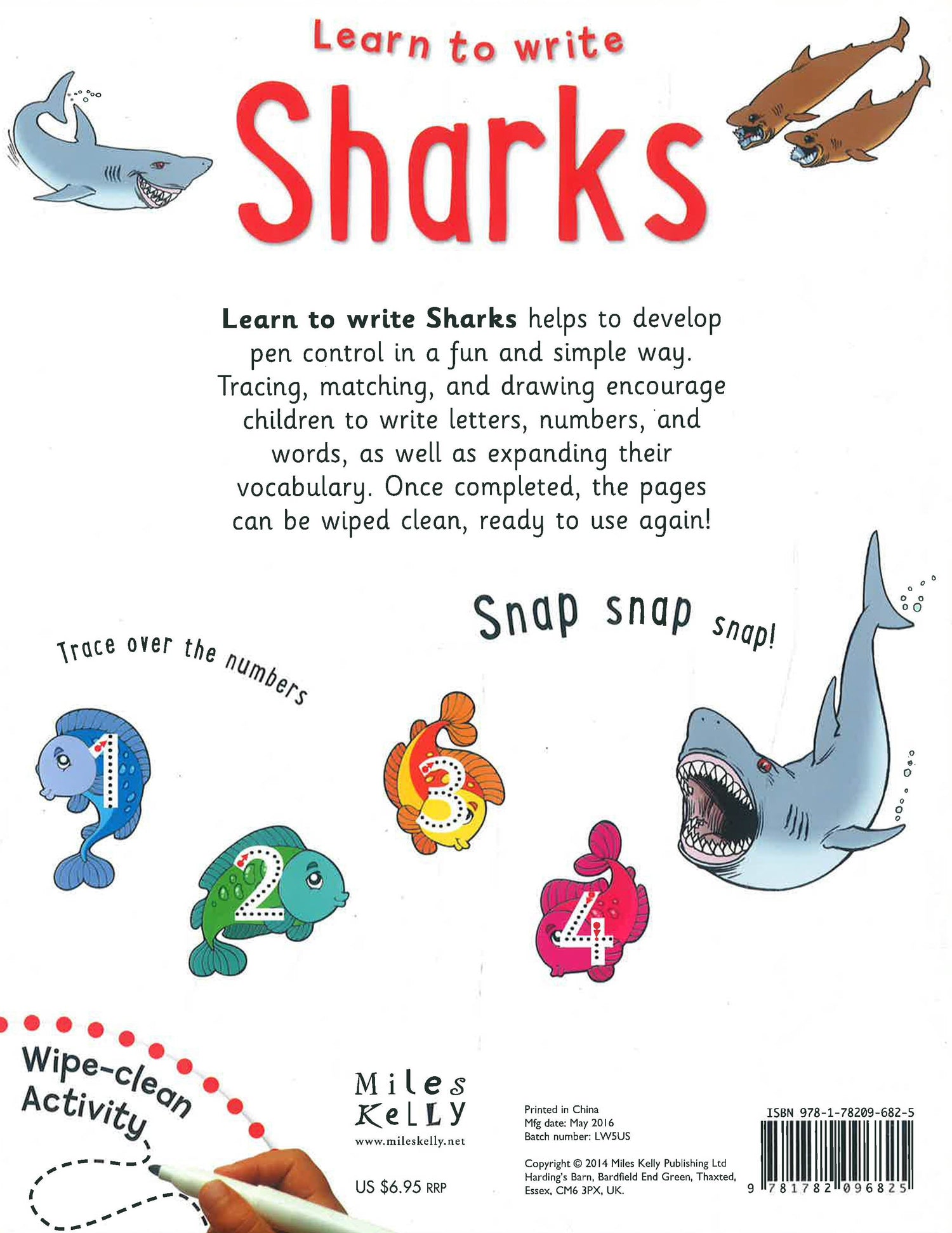 Learn to Write Sharks helps to develop pen control in a fun and simple way. Tracing, matching, and drawing encourage children to write letters, numbers, and words, as well as expanding their vocabulary. Once completed, the pages can be wiped clean, ready to use again!