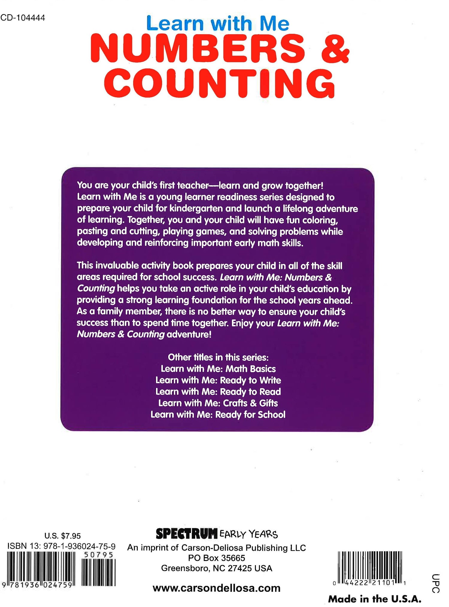 Take an active role in your child's education by providing a strong learning foundation for the school years ahead with Spectrum Learn with Me: Numbers & Counting. This invaluable activity book prepares children in all skill areas required for school success, and allows you to teach the math skills of number recognition, counting, and writing. It features 80 pages of activities with easy instructions, hints, and tips.