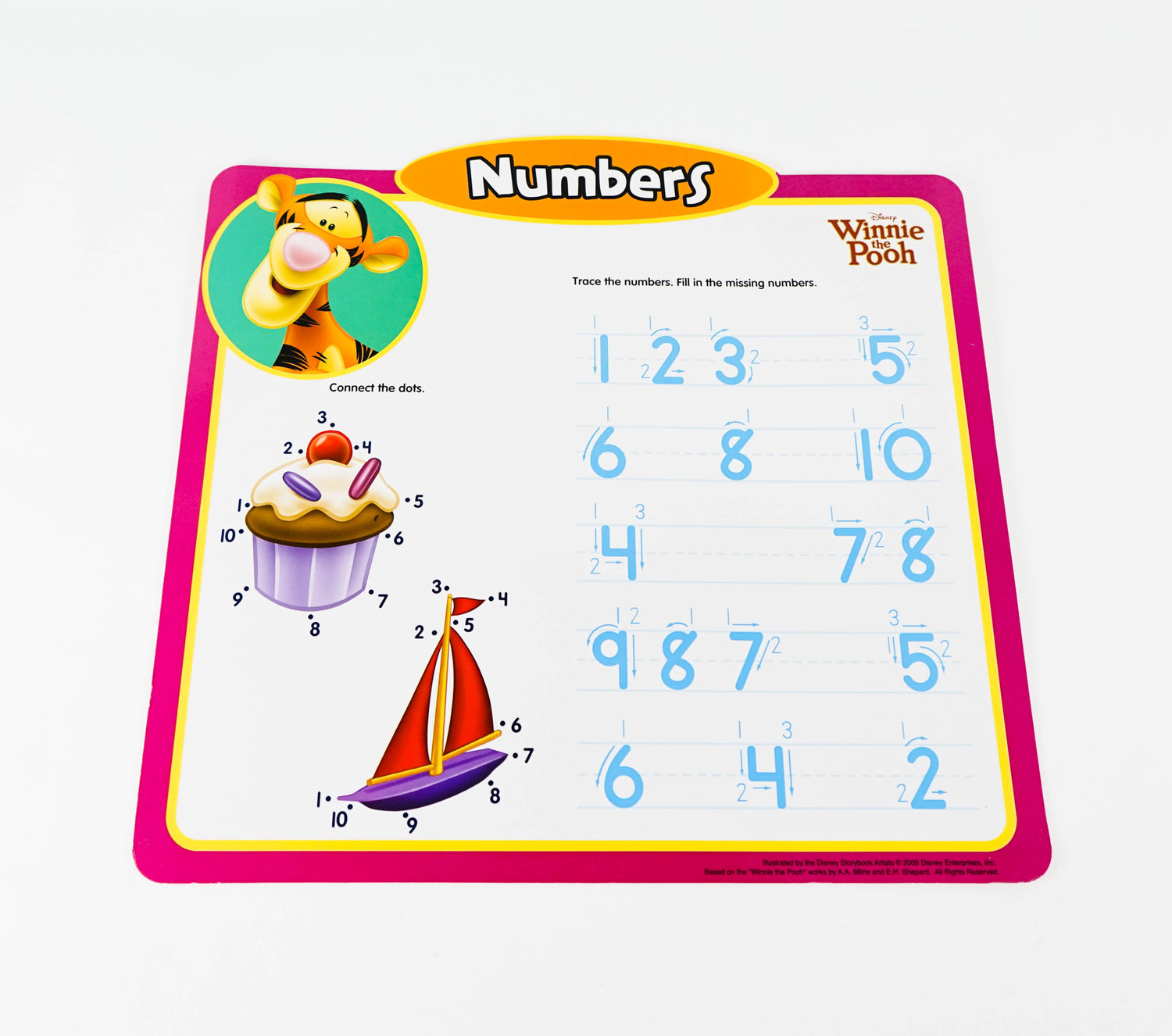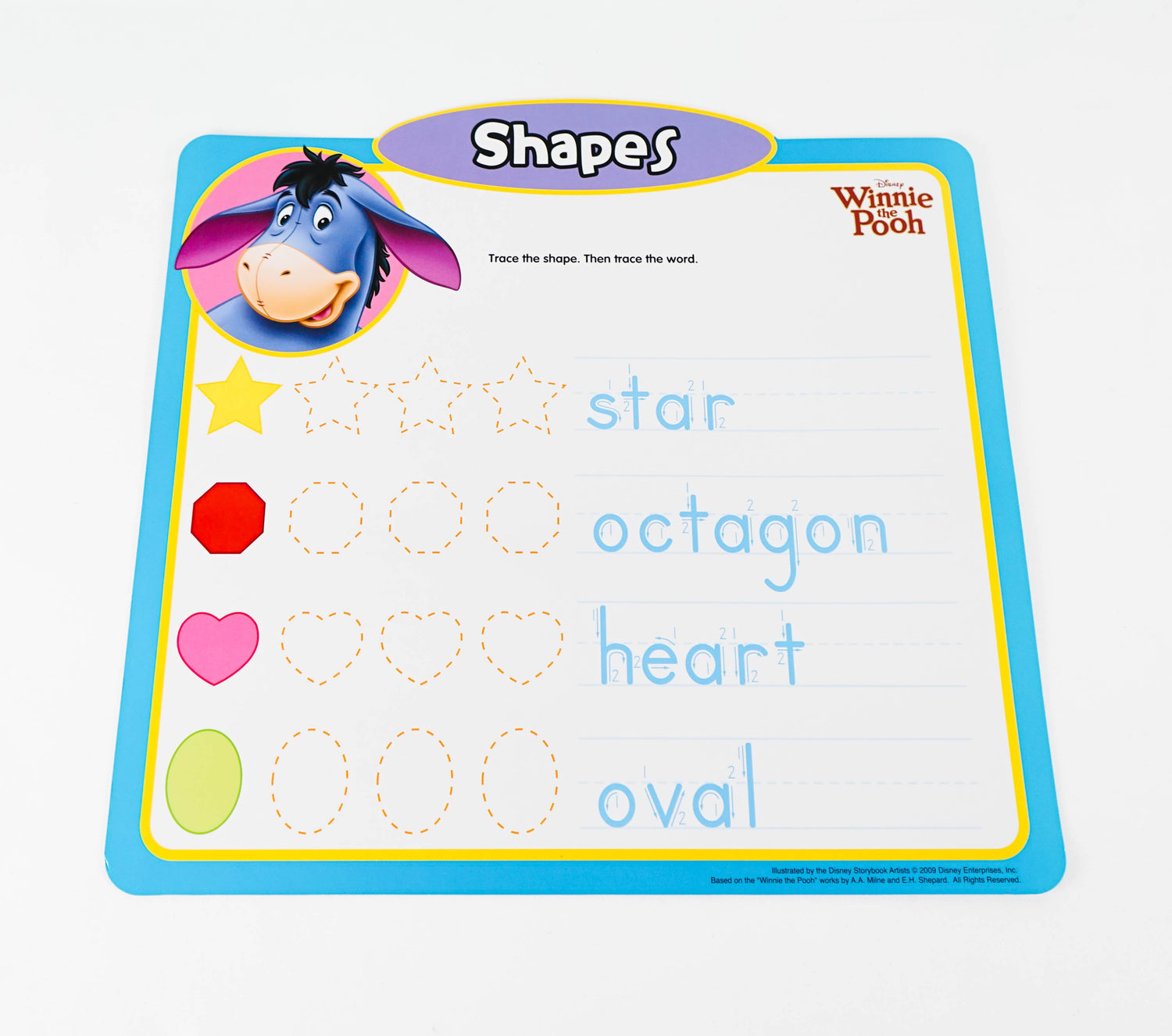 A package of three 2-sided learning mats: Alphabet; Numbers; Shapes. Practice, wipe clean, practice again!