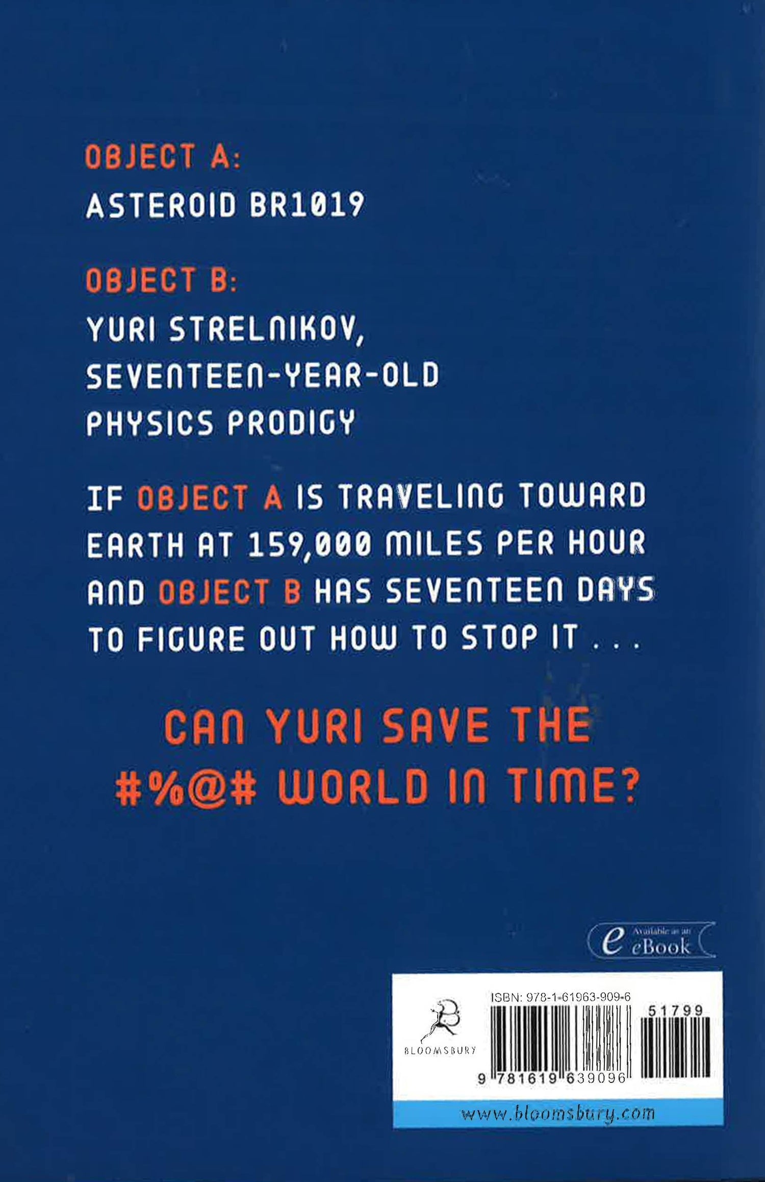 An asteroid is hurtling toward Earth. A big, bad one. Maybe not kill-all-the-dinosaurs bad, but at least kill-everyone-in-California-and-wipe-out-Japan-with-a-tsunami bad. Yuri, a physicist prodigy from Russia, has been recruited to aid NASA as they calculate a plan to avoid disaster.The good news is Yuri knows how to stop the asteroid--his research in antimatter will probably win him a Nobel prize if there's ever another Nobel prize awarded. But the trouble is, even though NASA asked for his help, no one there will listen to him. He's seventeen, and they've been studying physics longer than he's been alive.Then he meets (pretty, wild, unpredictable) Dovie, who lives like a normal teenager, oblivious to the impending doom. Being with her, on the adventures she plans when he's not at NASA, Yuri catches a glimpse of what it means to save the world and live a life worth saving.Prepare to laugh, cry, cringe, and have your mind burst open with the questions of the universe.