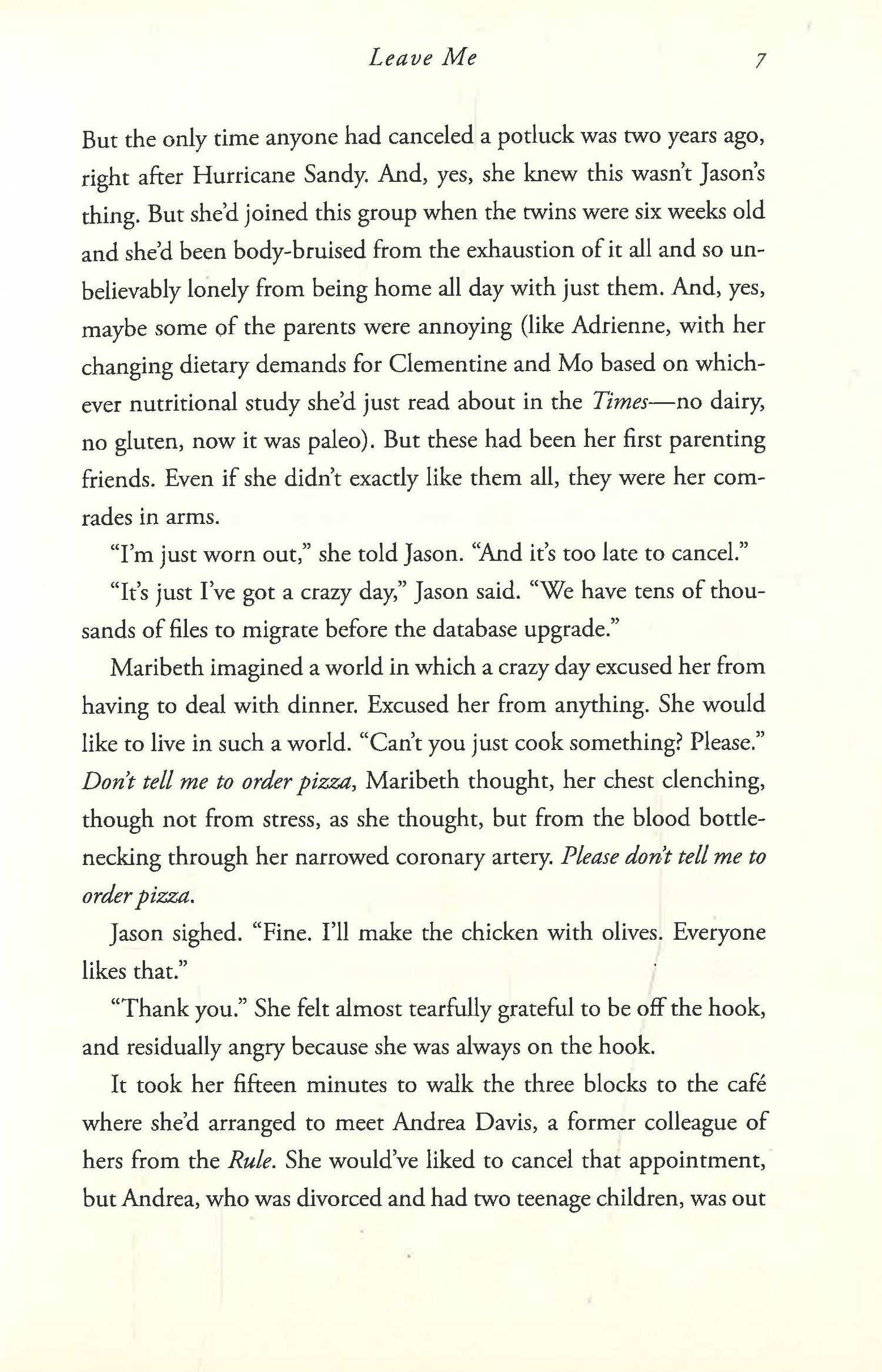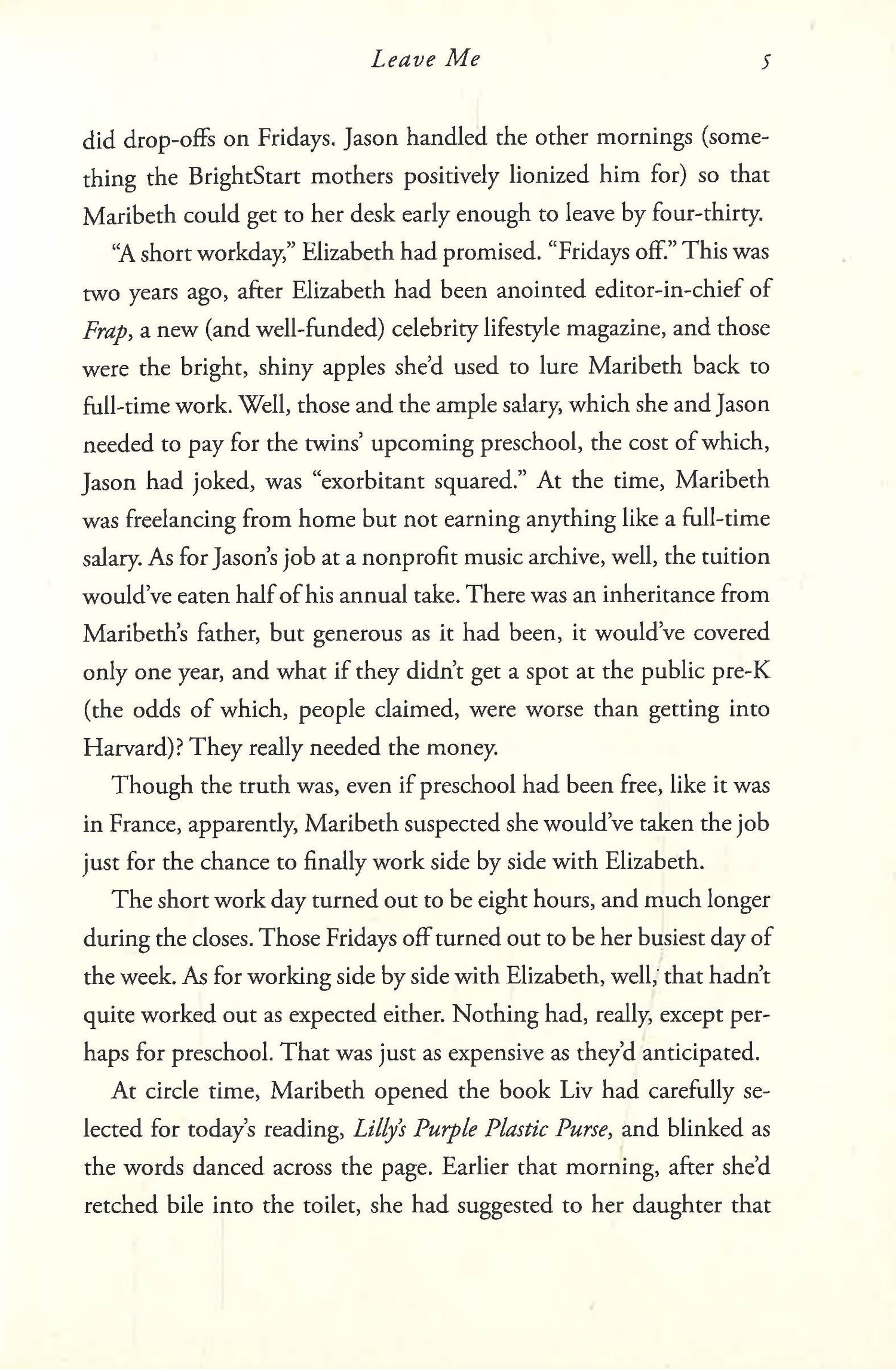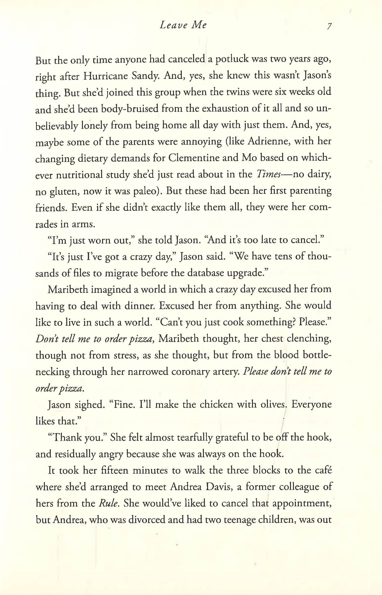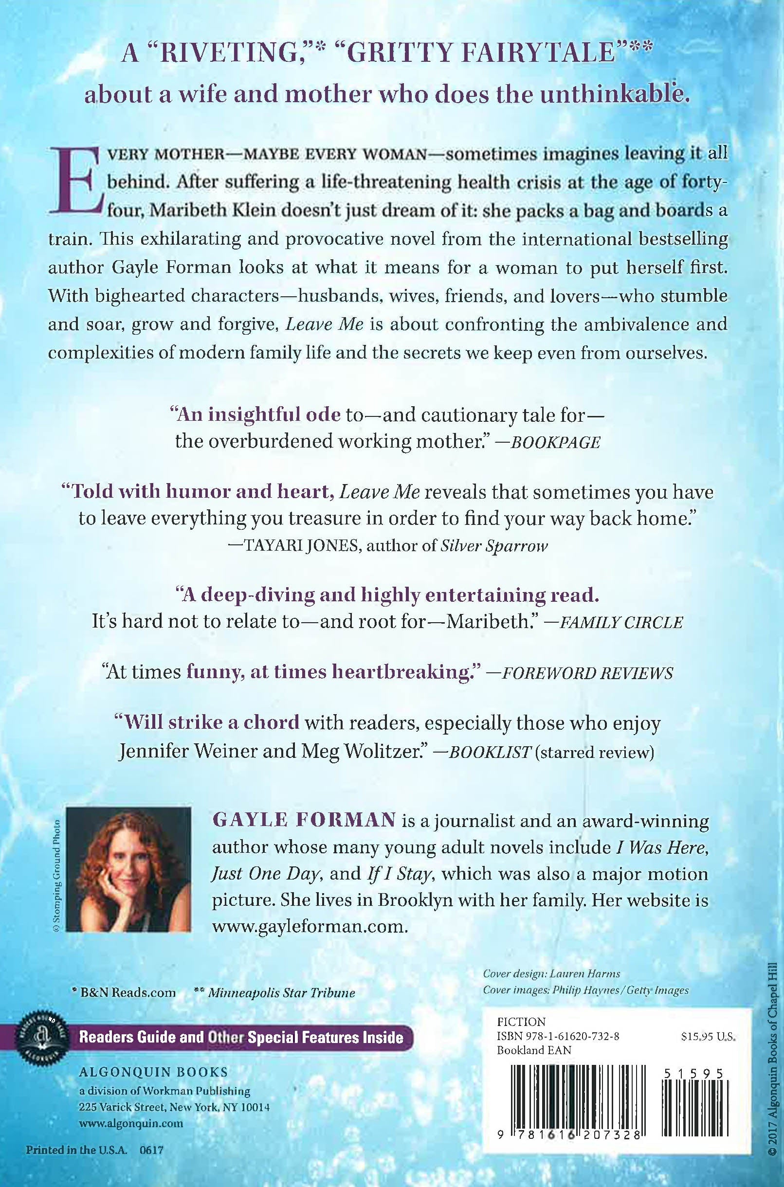 With bighearted characters--husbands, wives, friends, and lovers--who stumble and trip, grow and forgive, Leave Me is about facing the fears we're all running from. Gayle Forman is a dazzling observer of human nature. She has written an irresistible novel that confronts the ambivalence of modern motherhood head on and asks, what happens when a grown woman runs away from home?