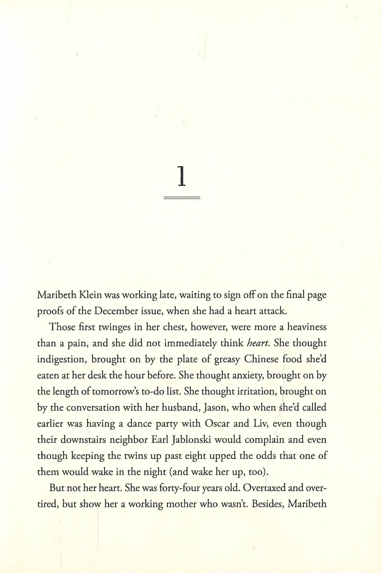 Every woman who has ever fantasized about driving past her exit on the highway instead of going home to make dinner, and every woman who has ever dreamed of boarding a train to a place where no one needs constant attention--meet Maribeth Klein. A harried working mother who's so busy taking care of her husband and twins, she doesn't even realize she's had a heart attack.