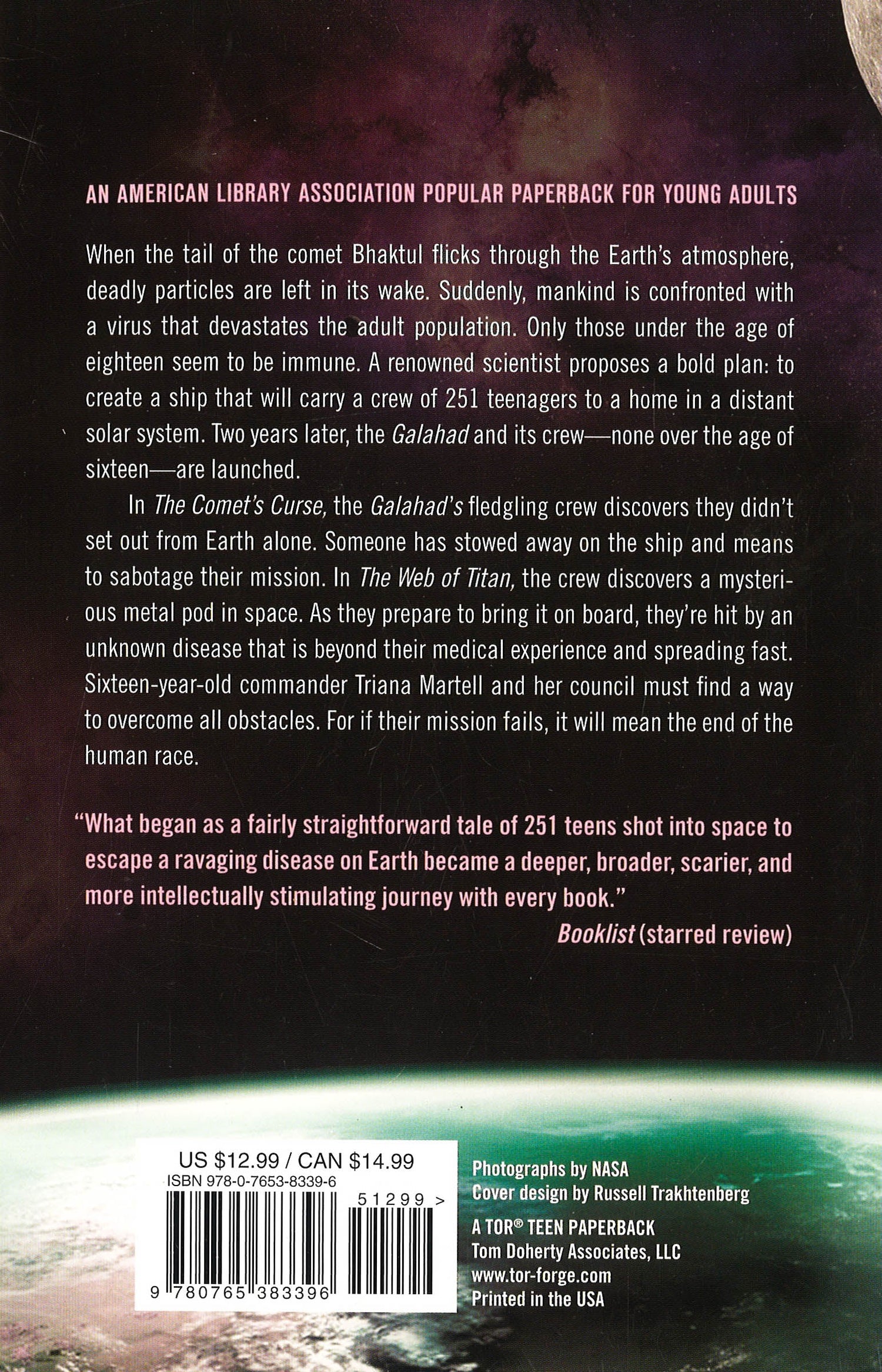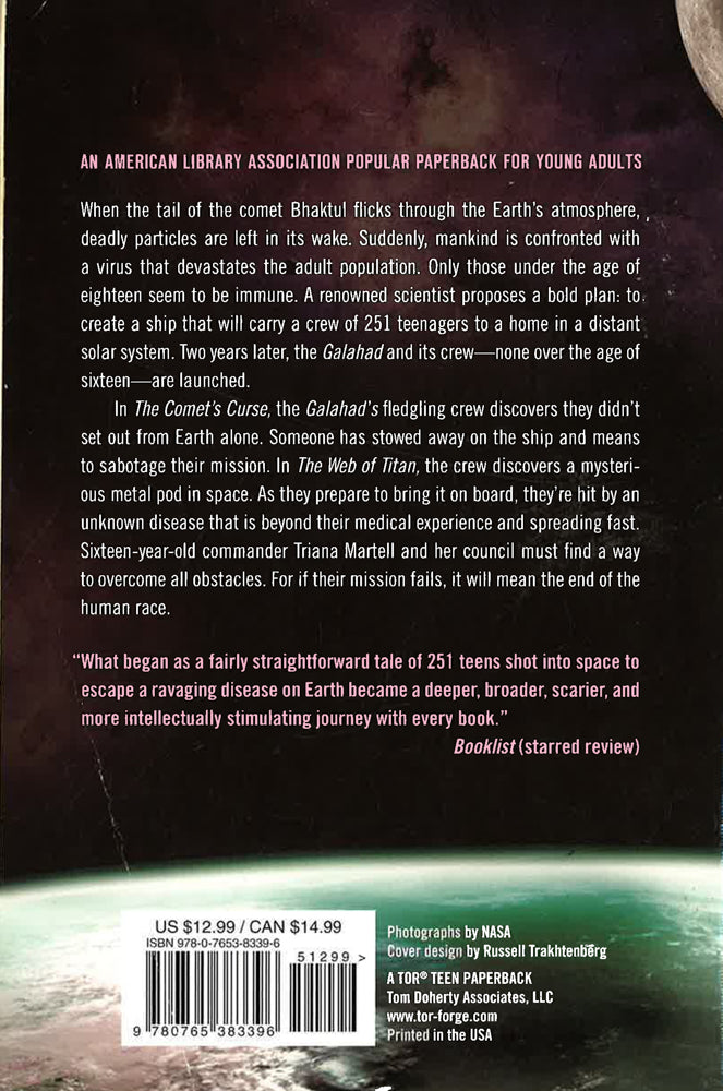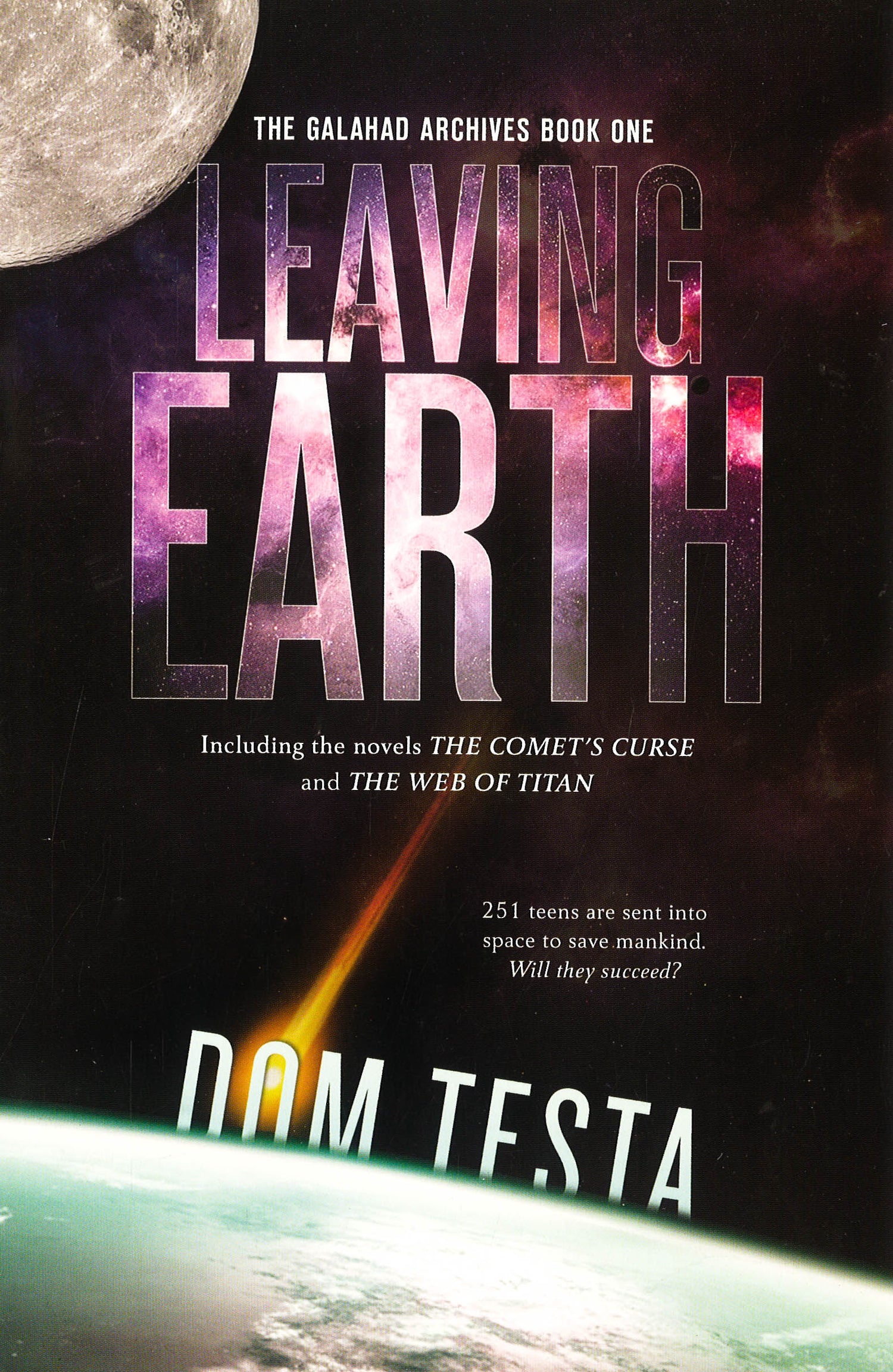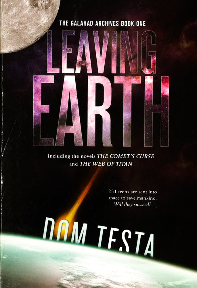 The Galahad Archives Book One: Leaving Earth is the first of three thrilling two-book omnibus editions in the Galahad Archives series for young adults by Dom Testa. When the tail of the comet Bhaktul flicks through the Earth's atmosphere, deadly particles are left in its wake. Suddenly, mankind is confronted with a virus that devastates the adult population. Only those under the age of eighteen seem to be immune. A renowned scientist proposes a bold plan: to create a ship that will carry a crew of 251 teenagers to a home in a distant solar system. Two years later, the Galahad and its crew--none over the age of sixteen--is launched. In The Comet's Curse the Galahad's fledgling crew discovers they didn't set out from Earth alone. Someone has stowed away on the ship and means to sabotage their mission. In The Web of Titan the crew discovers a mysterious metal pod in space. As they prepare to bring it on board they're hit by an unknown disease that is beyond their medical experience and spreading fast. Sixteen-year-old commander Triana Martell and her council must find a way to overcome all obstacles. For if their mission fails, it will mean the end of the human race. The Comet's Curse, the first book included in the omnibus, is an American Library Association Popular Paperback for Young Adults "What began as a fairly straightforward tale of 251 teens shot into space to escape a ravaging disease on Earth became a deeper, broader, scarier, and more intellectually stimulating journey with every book." --Booklist, starred review, on the Galahad Archives series