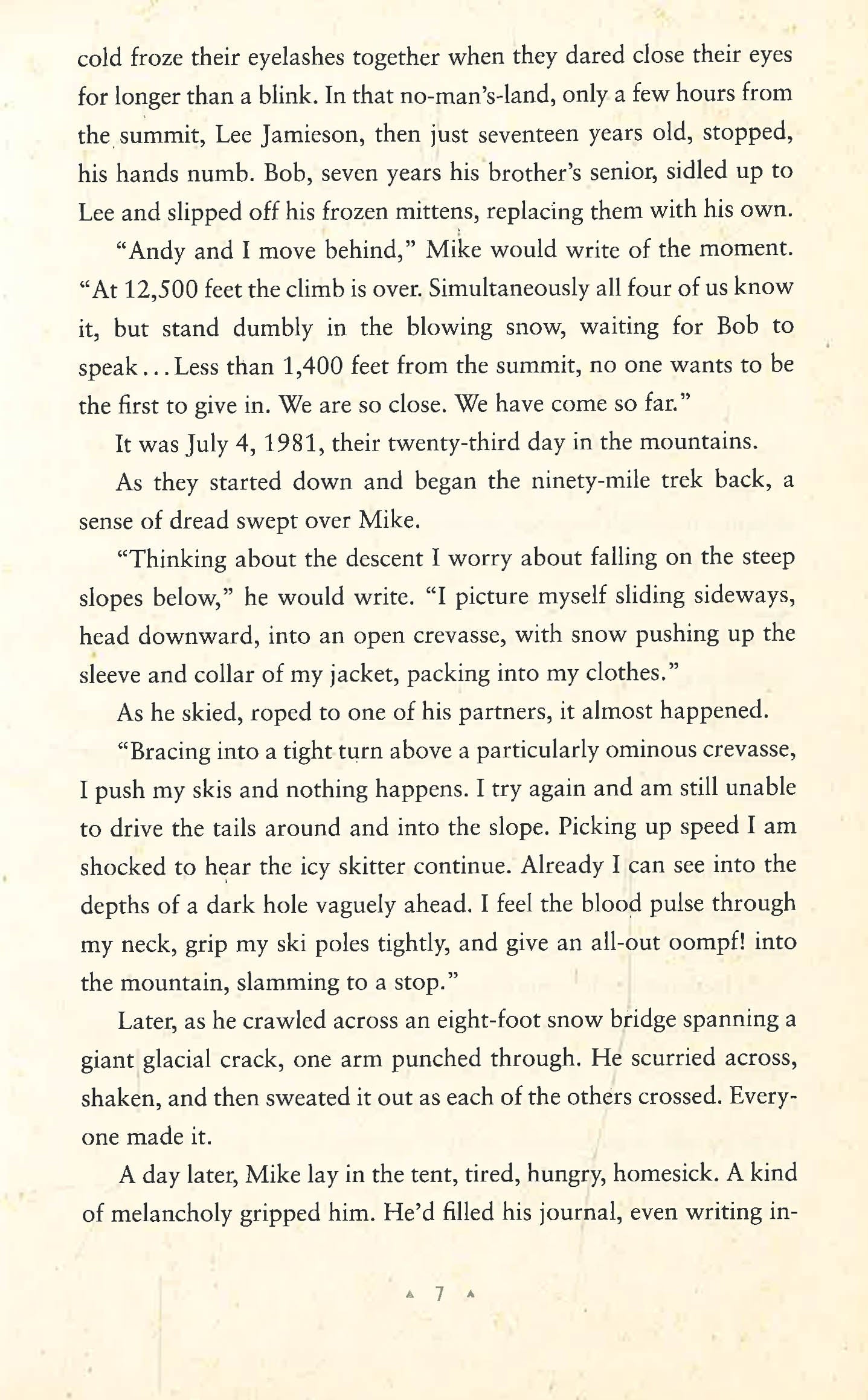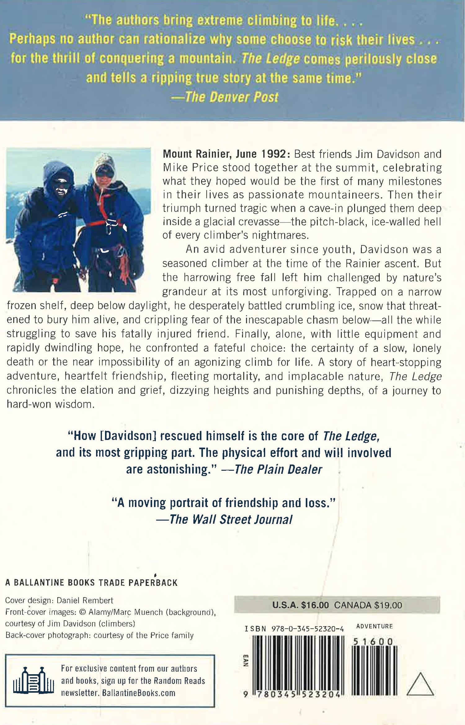 NEW YORK TIMES BESTSELLER - "The authors bring extreme climbing to life. . . . Perhaps no author can rationalize why some choose to risk their lives . . . for the thrill of conquering a mountain. The Ledge comes perilously close and tells a ripping true story at the same time."--The Denver Post In June 1992, best friends Jim Davidson and Mike Price stood atop Washington's Mount Rainier, celebrating what they hoped would be the first of many milestones in their lives as passionate mountaineers. Then their triumph turned tragic when a cave-in plunged them deep inside a glacial crevasse--the pitch-black, ice-walled hell of every climber's nightmares. An avid adventurer since youth, Davidson was a seasoned climber at the time of the Rainier ascent. But the harrowing free fall left him challenged by nature's grandeur at its most unforgiving. Trapped on a narrow frozen shelf, deep below daylight, he desperately battled crumbling ice, snow that threatened to bury him alive, and crippling fear of the inescapable chasm below--all the while struggling to save his fatally injured friend. Finally, alone, with little equipment and rapidly dwindling hope, he confronted a fateful choice: the certainty of a slow, lonely death or the near impossibility of an agonizing climb for life. A story of heart-stopping adventure, heartfelt friendship, fleeting mortality, and implacable nature, The Ledge chronicles the elation and grief, dizzying heights and punishing depths, of a journey to hard-won wisdom. "Plunges readers into a dark, icy chasm from which escape seems impossible. Then it reveals the strength it takes to look up, and to start climbing."--Jim Sheeler, winner of the Pulitzer Prize and author of the National Book Award finalist Final Salute