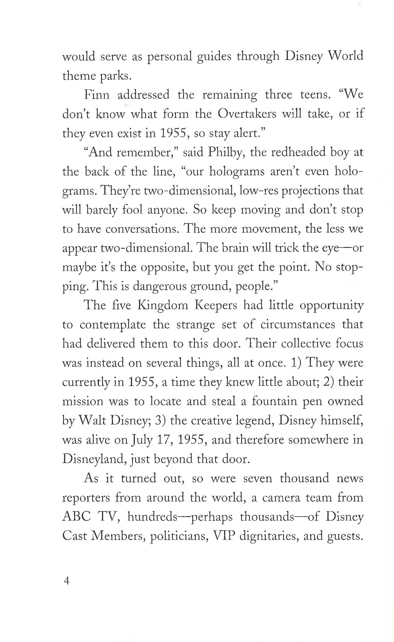 Disneyland, Opening Day, 1955.When five present-day teenagers known as the Kingdom Keepers find themselves thrown into a past that would make anyone envious, things don't exactly work out the way they'd hoped. Finn, Charlene, Maybeck, Willa, and Philby open a door into a place and a time when the legend of the Disney parks is just starting. They are there, in 1955, to retrieve Walt Disney's infamous pen that once saved the parks as we know them. But like all things Disney, nothing is as it seems.The early days of the Tower of Terror, the origin of the Overtakers (Disney villains), and the real power of magic unfold in an unexpected series of events that propel both the Keepers and Disney itself into a darkness no one saw coming. Along the way, the Keepers visit Walt Disney's hilltop home, Disneyland's opening day and reception, and find themselves separated from friends sixty years away. The three Fairlies, young women in Disney's School of Imagineering, girls with astonishing powers of their own, have unmasked a long-buried secret that threatens the lives of their friends as well as everything Walt Disney worked for.