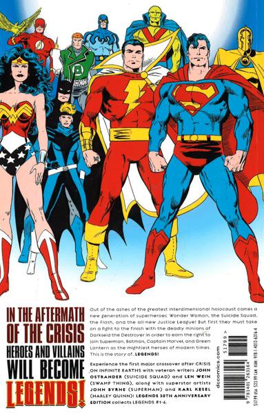 In the wake of CRISIS ON INFINITE EARTHS, the heroes of the DC Universe must find a new purpose and direction in the battle for justice! Superman, Batman, Wonder Woman, The Flash, Green Lantern, and more have dedicated their lives to protecting the innocent and defending justice. But when G. Gordon Godfrey arrives and acts on behalf of Darkseid to create a hate campaign that outlaws super-heroic activities, the world's greatest find themselves fighting the very people they swore to protect! Collects the 6-issue 1986 miniseries LEGENDS, featuring art by John Byrne, legenary illustrator of The Uncanny X-Men and writer/artist of MAN OF STEEL.