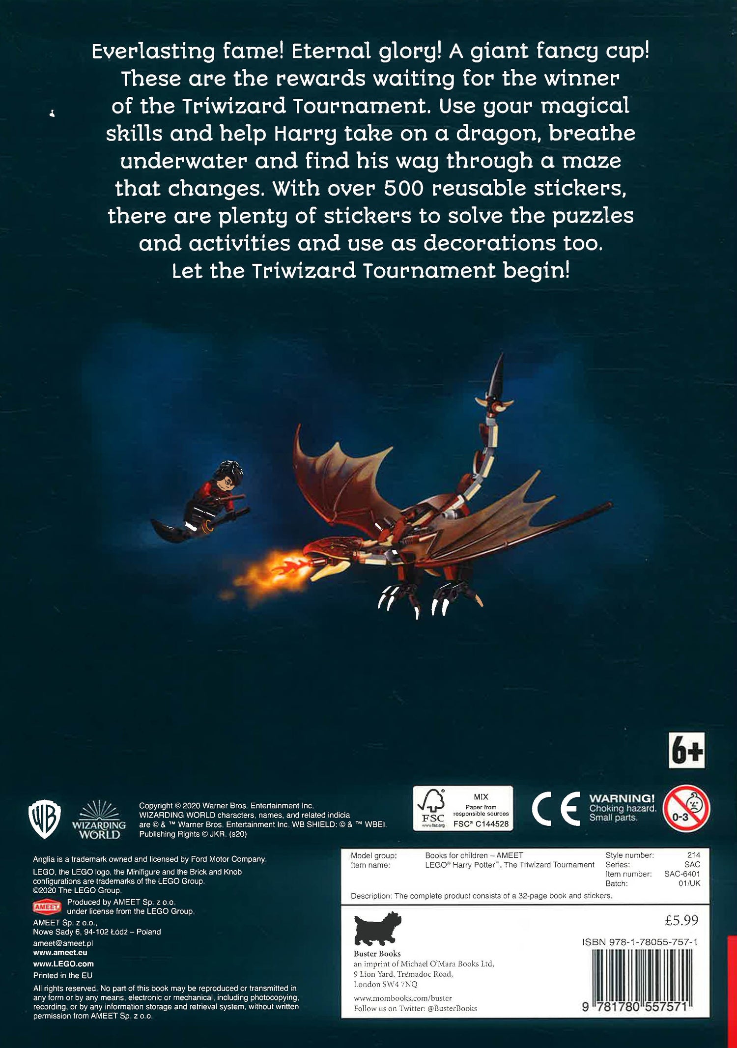 Everlasting fame! Eternal glory! A giant fancy cup! These are the rewards that await the winner of the Triwizard Tournament. Use your magical skills and help Harry take on a dragon, breathe underwater and find his way through a shape-shifting maze. Contains over 500 fantastic reusable stickers – enough for readers to solve the puzzles and use as decoration. Let the Triwizard Tournament begin!