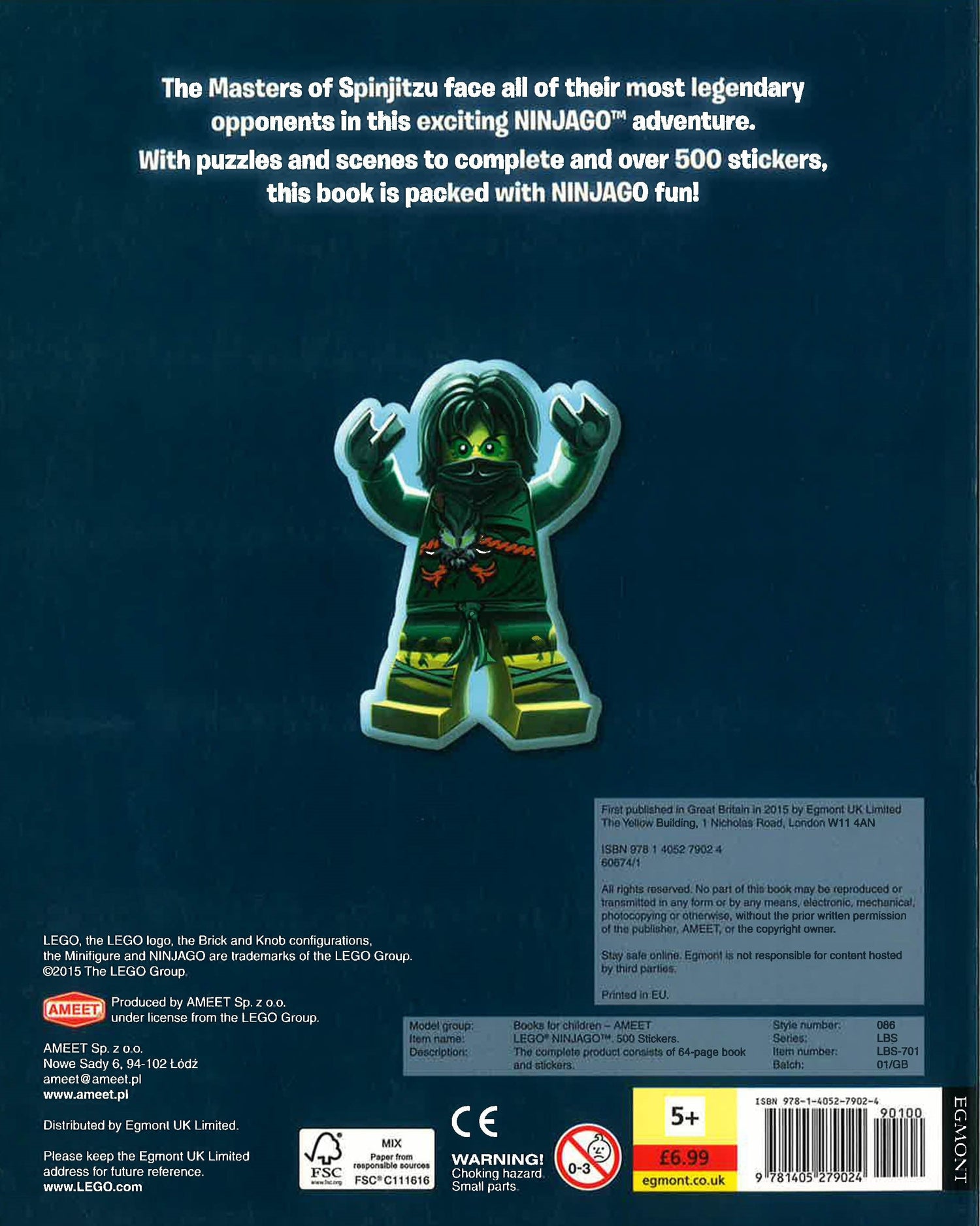 Get ready for an amazing adventure! This new book from the Lego Ninjago series is packed full of exciting activities and over 500 stickers! The loss of Zane in the final battle with the Overlord has fractured the ninja team. But when a mysterious invitation to Master Chen's Tournament of Elements arrives, everything is thrown into question... Young masters of Spinjitzu will love the Lego Ninjago activity books packed with activities, stickers, and awesome facts about their favourite Ninja. There are hours of fun to be had for kids aged 5 and up. Do you own all the LEGO (R) Ninjago titles? LEGO (R) Ninjago: 500 Stickers LEGO (R) Ninjago: Ready, Steady, Stick! (Sticker Activity Book) LEGO (R) Ninjago: The Hour of Ghosts (Activity Book with Minifigure) LEGO (R) Ninjago: Spot the Samurai-Droid (A Search-And-Find Book) LEGO (R) Ninjago: Tournament of Elements (Activity Book with Minifigure)