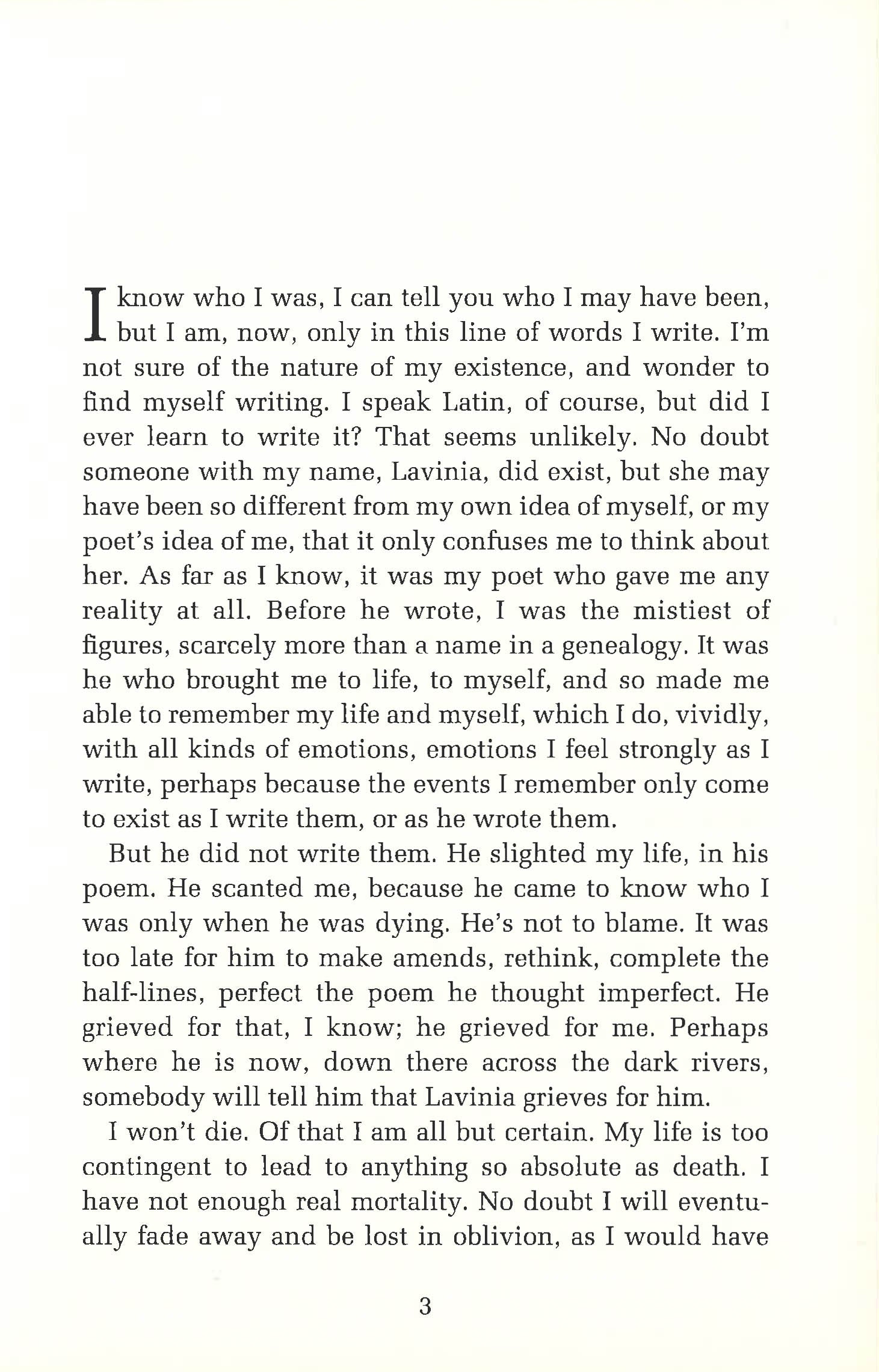 Lavinia is the daughter of the King of Latium, a victorious warrior who loves peace; she is her father's closest companion. Now of an age to wed, Lavinia's mother favours her own kinsman, King Turnus of Rutulia, handsome, heroic, everything a young girl should want. Instead, Lavinia dreams of mighty Aeneas, a man she has heard of only from a ghost of a poet, who comes to her in the gods' holy place and tells her of her future, and Aeneas' past...