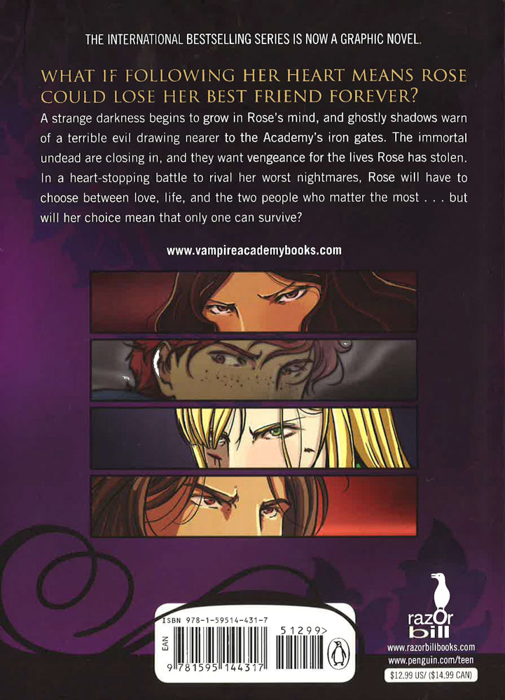 The third book in the series of New York Times best-selling adaptations of Richelle Mead’s Vampire Academy . It's springtime at St. Vladimir's Academy, and Rose is close to graduation, but since making her first Strigoi kills, things haven't felt quite right. She's having dark thoughts, behaving erratically, and worst of all ...might be seeing ghosts. Consumed by her forbidden love with her tutor Dimitri and protecting her best friend, the Moroi princess Lissa, Rose is in no state to see the deadly threat that will change her entire world - and make her choose between the two people she loves most.