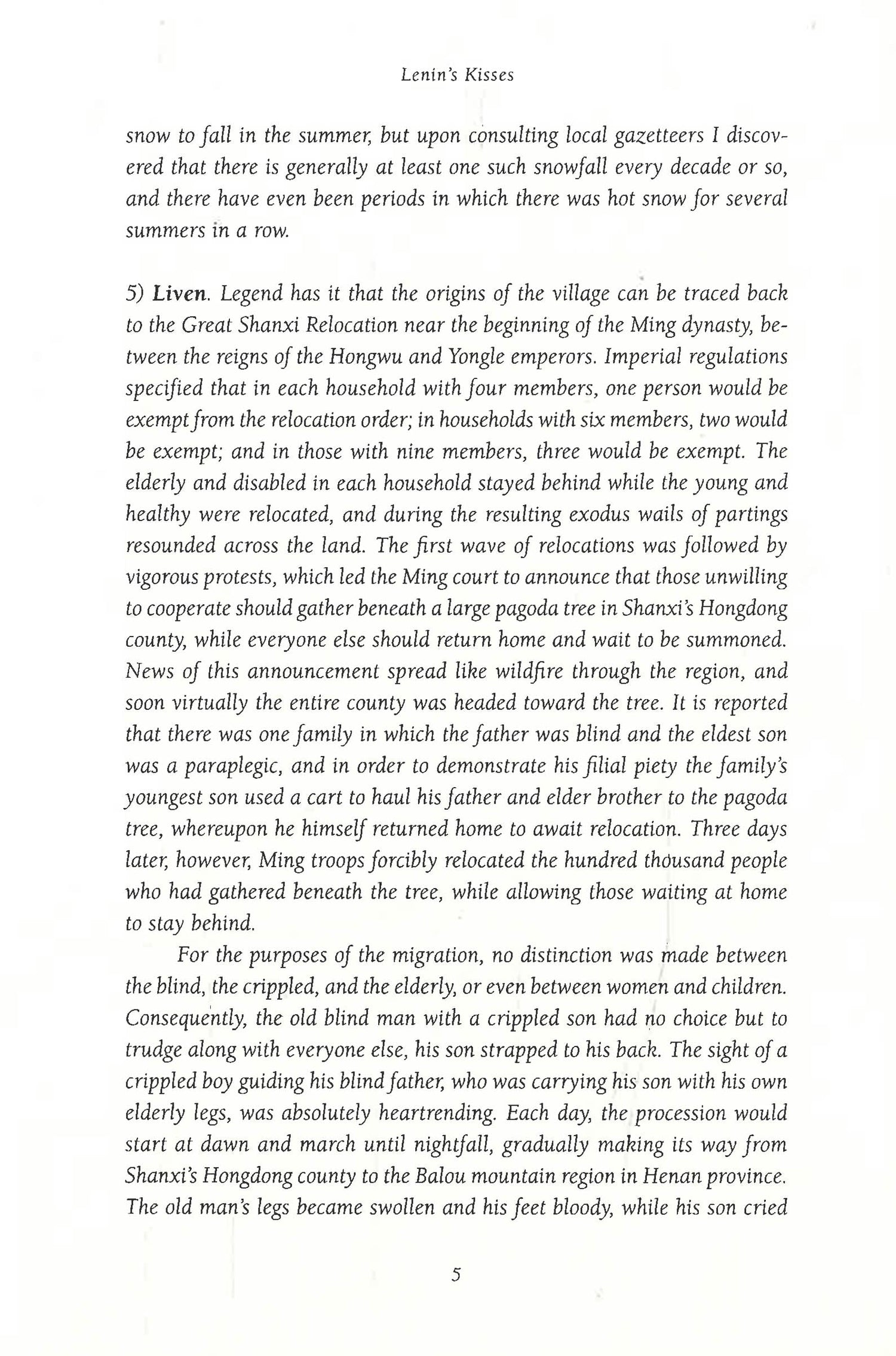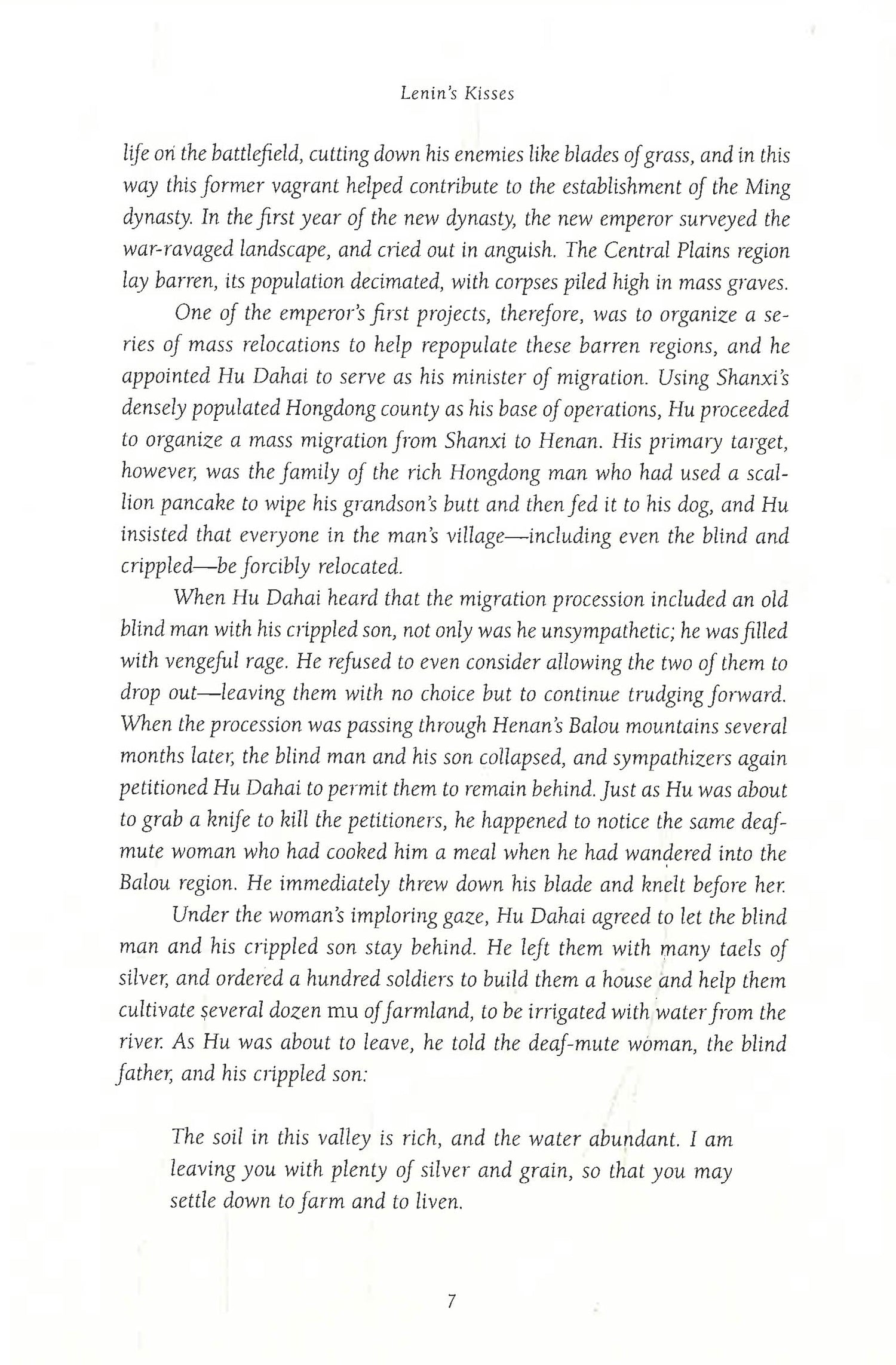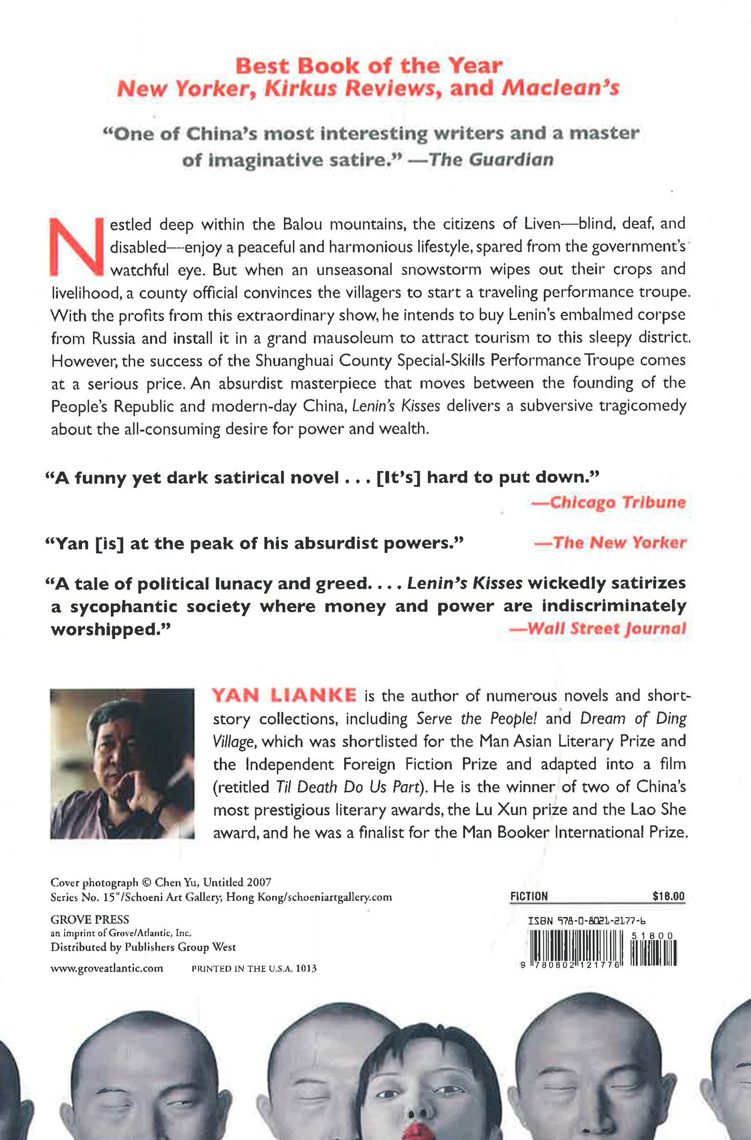 A mystifying climatic incongruity begins the award-winning novel Lenin's Kisses--an absurdist, tragicomic masterpiece set in modern day China. Nestled deep within the Balou mountains, spared from the government's watchful eye, the harmonious people of Liven had enough food and leisure to be fully content. But when their crops and livelihood are obliterated by a seven-day snowstorm in the middle of a sweltering summer, a county official arrives with a lucrative scheme both to raise money for the district and boost his career. The majority of the 197 villagers are disabled, and he convinces them to start a traveling performance troupe highlighting such acts as One-Eye's one-eyed needle threading. With the profits from this extraordinary show, he intends to buy Lenin's embalmed corpse from Russia and install it in a grand mausoleum to attract tourism, in the ultimate marriage of capitalism and communism. However, the success of the Shuanghuai County Special-Skills Performance Troupe comes at a serious price.