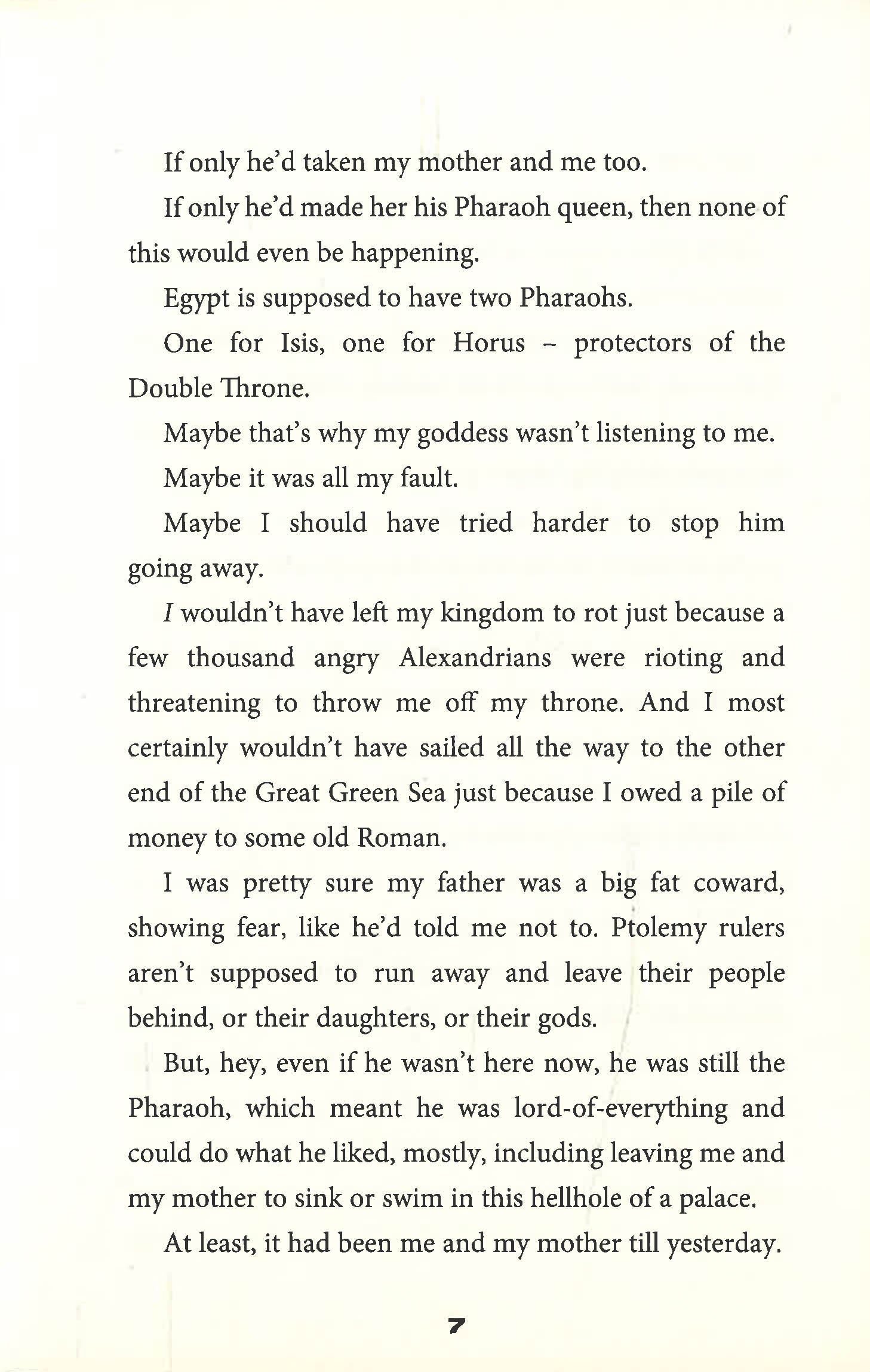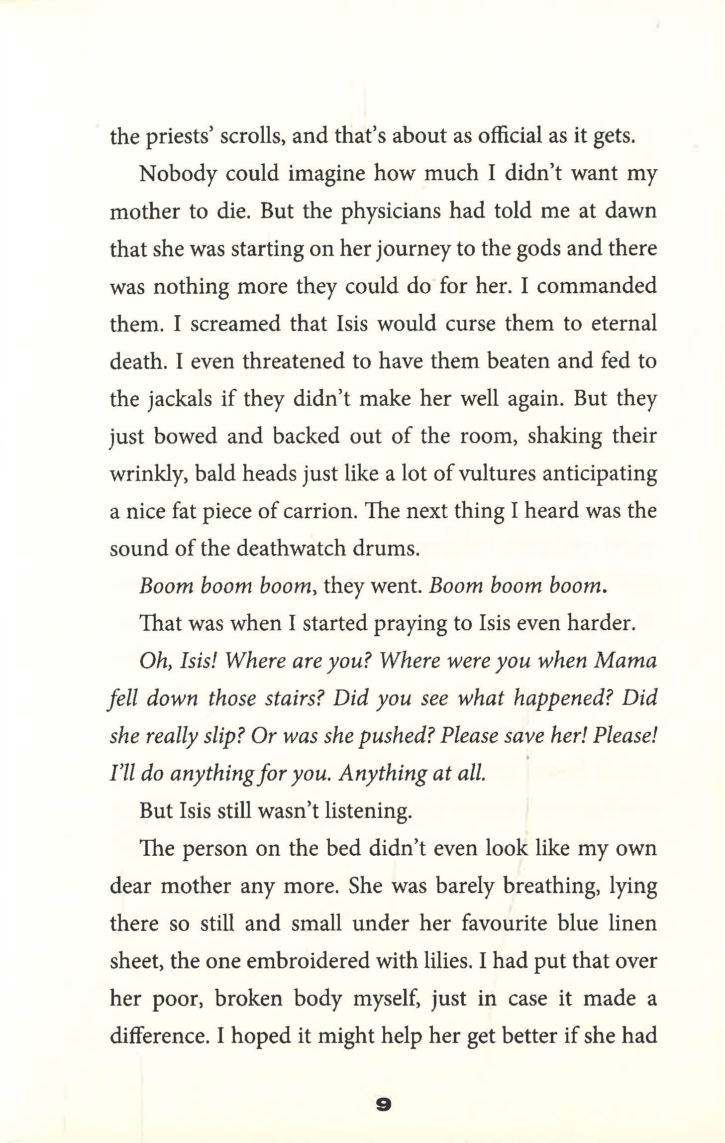 One throne. Three sisters. This is war. Her precious mother is dead - and it isn't an accident! The young Cleopatra - Pharaoh's illegitimate daughter - must flee the royal palace at Alexandria or die too. As her evil half-sisters usurp the throne, Cleo finds sanctuary at the sacred temple of Isis, where years later she becomes initiated into the secret Sisters of the Living Knot. But now Isis's power is failing, Egypt is in danger, and Cleo must prove her loyalty to her goddess by returning to the Alexandria she hates. She must seek out the hidden map which is the key to returning Isis's power - on pain of death. But will she be able to evade her horrible sisters? And will she find dreamy Khai, the uber-hot Librarian boy she met as she fled Alexandria years before? Cleo's powerful destiny is about to unfold... Gorgeous and evocative, this captivating new YA novel imagines the life of the teenage Cleopatra before she became the icon we think we know.