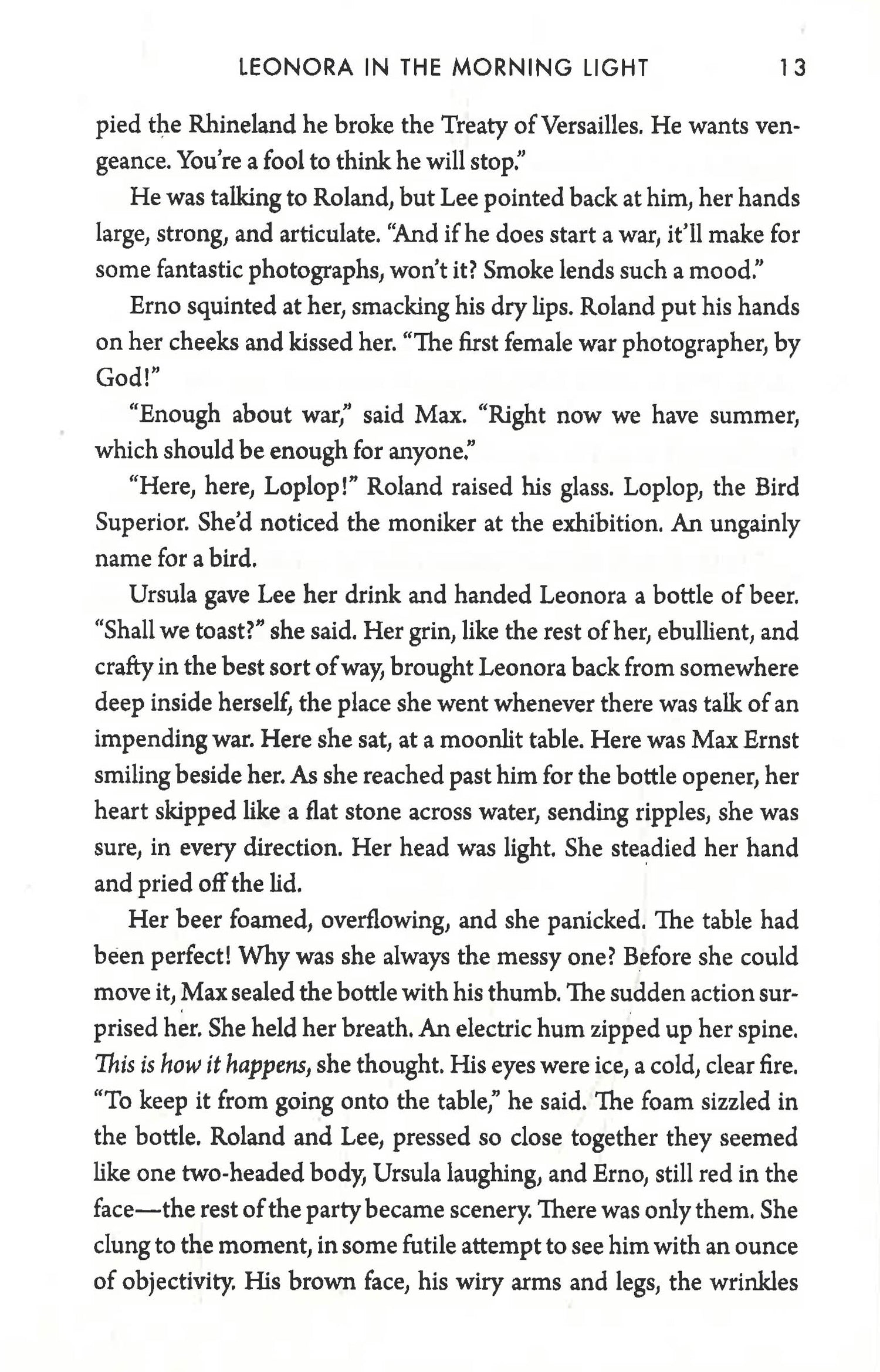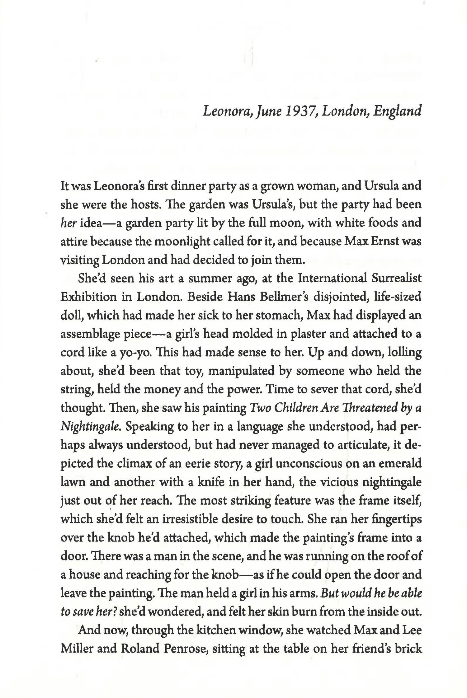 1937. Leonora Carrington is a twenty-year-old British socialite and painter when she meets Max Ernst, an older, married artist whose work has captivated Europe. She follows him to Paris, into the vibrant world of studios and cafes where rising visionaries of the Surrealist movement like Andre Breton, Pablo Picasso, Lee Miller, Man Ray, and Salvador Dali are challenging conventional approaches to art and life. Inspired by their freedom, Leonora begins to experiment with her own work, translating vivid stories of her youth onto canvas and gaining recognition under her own name. It is a bright and glorious age of enlightenment—until war looms over Europe and headlines emerge denouncing Max and his circle as “degenerates,” leading to his arrest and imprisonment. Left along as occupation spreads throughout the countryside, Leonora battles terrifying circumstances to survive, reawakening past demons that threaten to consume her.