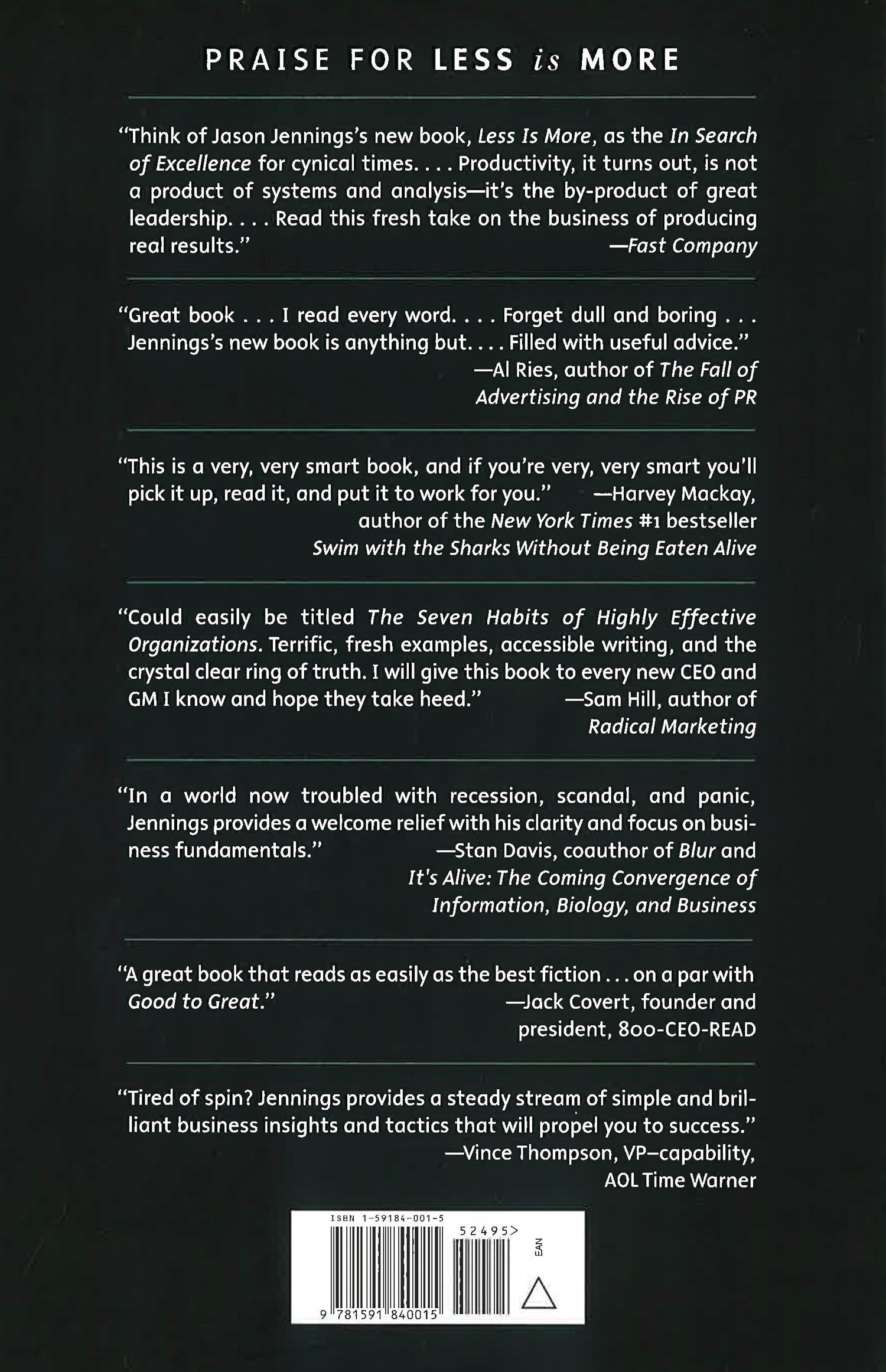 From the author of the bestselling It's Not the Big That Eat the Small, It's the Fast That Eat the Slow comes a vital new guide to increasing business productivity without adding employees or other overhead costsManagers and CEOs are always looking for ways to keep productivity high, and recent economic shakiness has only reinforced their need. Now Jason Jennings, a bestselling author and international business consultant, offers a groundbreaking look at how to boost productivity and your bottom line.In Less Is More, Jennings shares tested and successful programs from the leading giants in industry and presents new trends that businesses of all sizes will be able to implement. Inside, you'll learn how to: increase sales 300 percent without increasing head countbecome 10 times more efficientkeep track of every pennyuse technology and automation in your favorWritten in the same breezy, informative style of Jennings's previous book, Less Is More is sure to join its predecessor on bestseller lists nationwide.