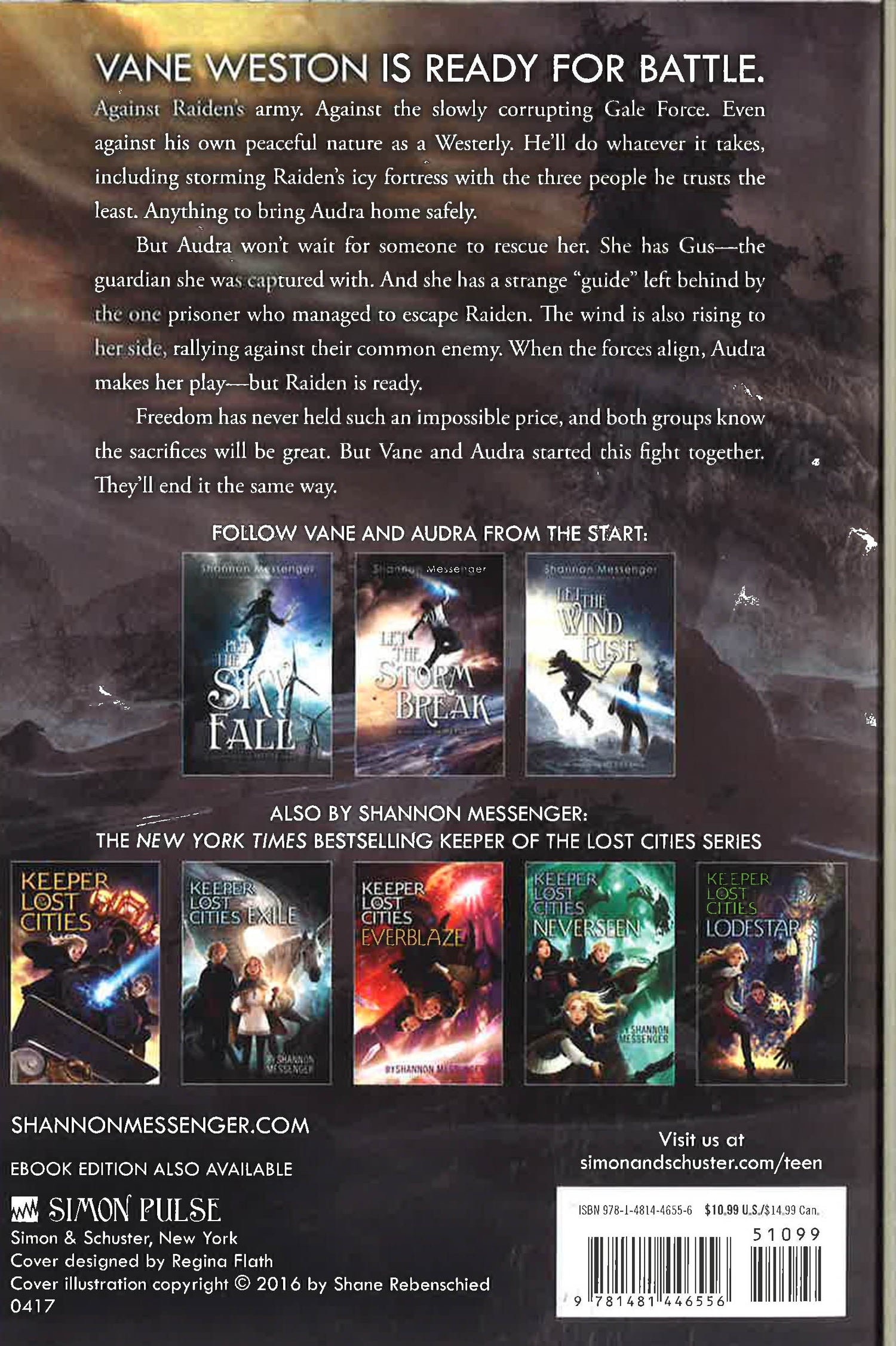The breathtaking action and romance build to a climax in this thrilling conclusion to the Sky Fall trilogy from the New York Times and USA TODAY bestselling author of the Keeper of the Lost Cities series. Vane Weston is ready for battle. Against Raiden's army. Against the slowly corrupting Gale Force. Even against his own peaceful nature as a Westerly. He'll do whatever it takes, including storming Raiden's icy fortress with the three people he trusts the least. Anything to bring Audra home safely. But Audra won't wait for someone to rescue her. She has Gus--the guardian she was captured with. And she has a strange "guide" left behind by the one prisoner who managed to escape Raiden. The wind is also rising to her side, rallying against their common enemy. When the forces align, Audra makes her play--but Raiden is ready. Freedom has never held such an impossible price, and both groups know the sacrifices will be great. But Vane and Audra started this fight together. They'll end it the same way.