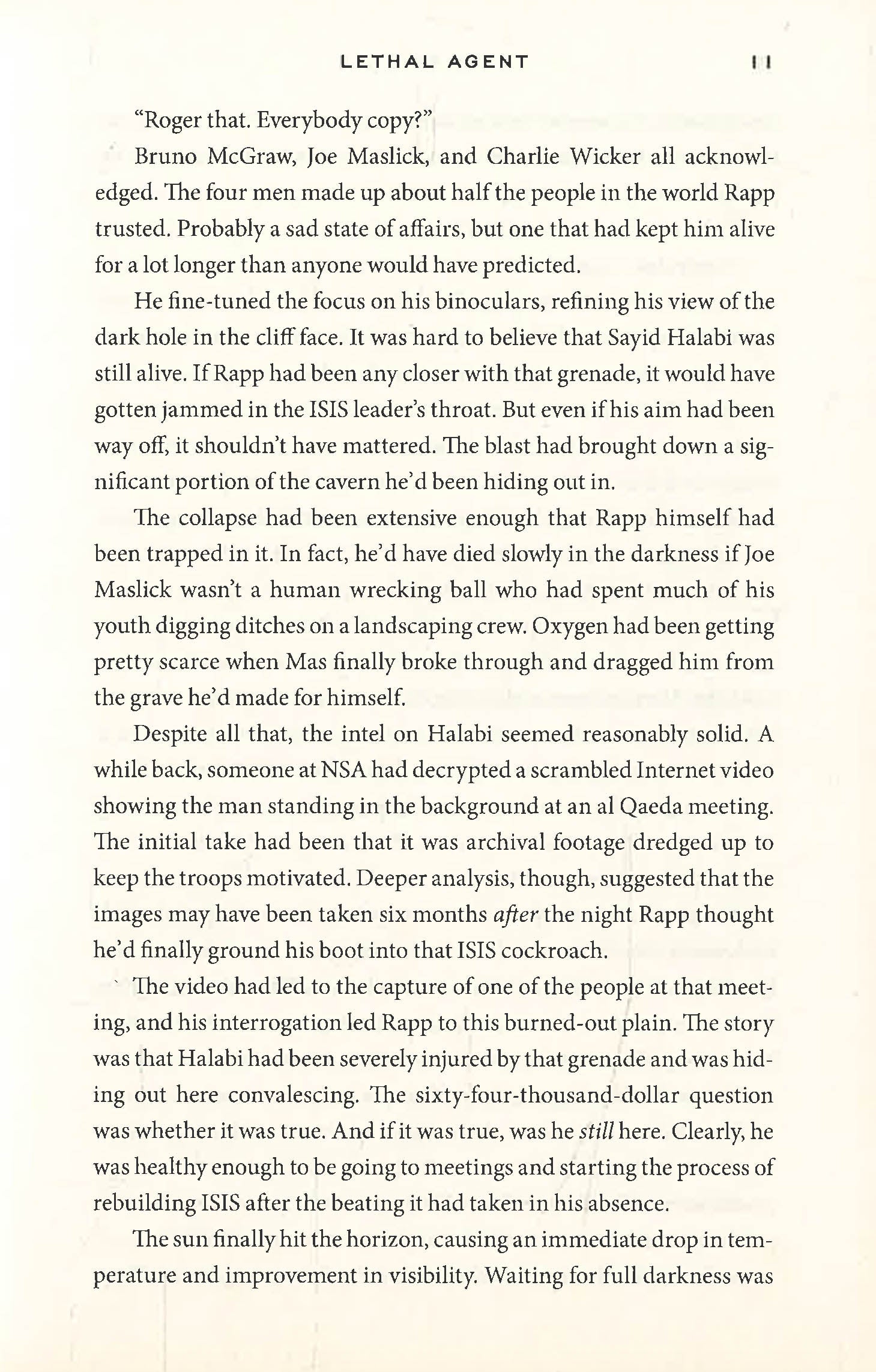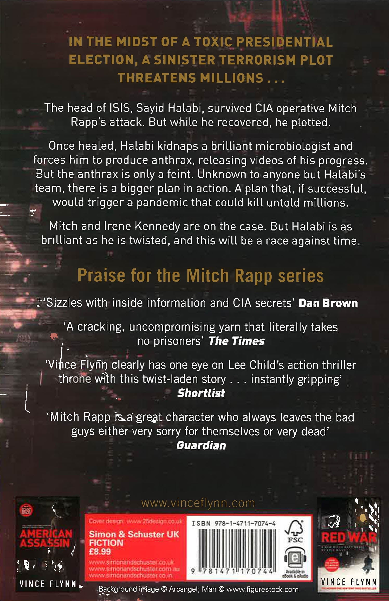 The head of ISIS, Sayid Halabi, survived Mitch Rapp’s attack on him, but while he convalesced, he plotted. Once healed, Halabi kidnaps a brilliant Yemeni microbiologist and forces him to produce anthrax. ISIS releases videos of his progress and uses them to stir up hysteria in the States in the midst of an extremely divisive presidential election.