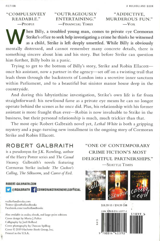 Trying to get to the bottom of Billy's story, Strike and Robin Ellacott -- once his assistant, now a partner in the agency -- set off on a twisting trail that leads them through the backstreets of London, into a secretive inner sanctum within Parliament, and to a beautiful but sinister manor house deep in the countryside. And during this labyrinthine investigation, Strike's own life is far from straightforward. His newfound fame as a private eye means he can no longer operate behind the scenes as he once did. Plus, his relationship with his former assistant is more fraught than it ever has been; Robin is now invaluable to Strike in the business, but their personal relationship is much, much trickier than that. The most epic Robert Galbraith novel yet, Lethal White is "addictive, murderous fun" for British mystery lovers and crime fiction fans alike (Vox).