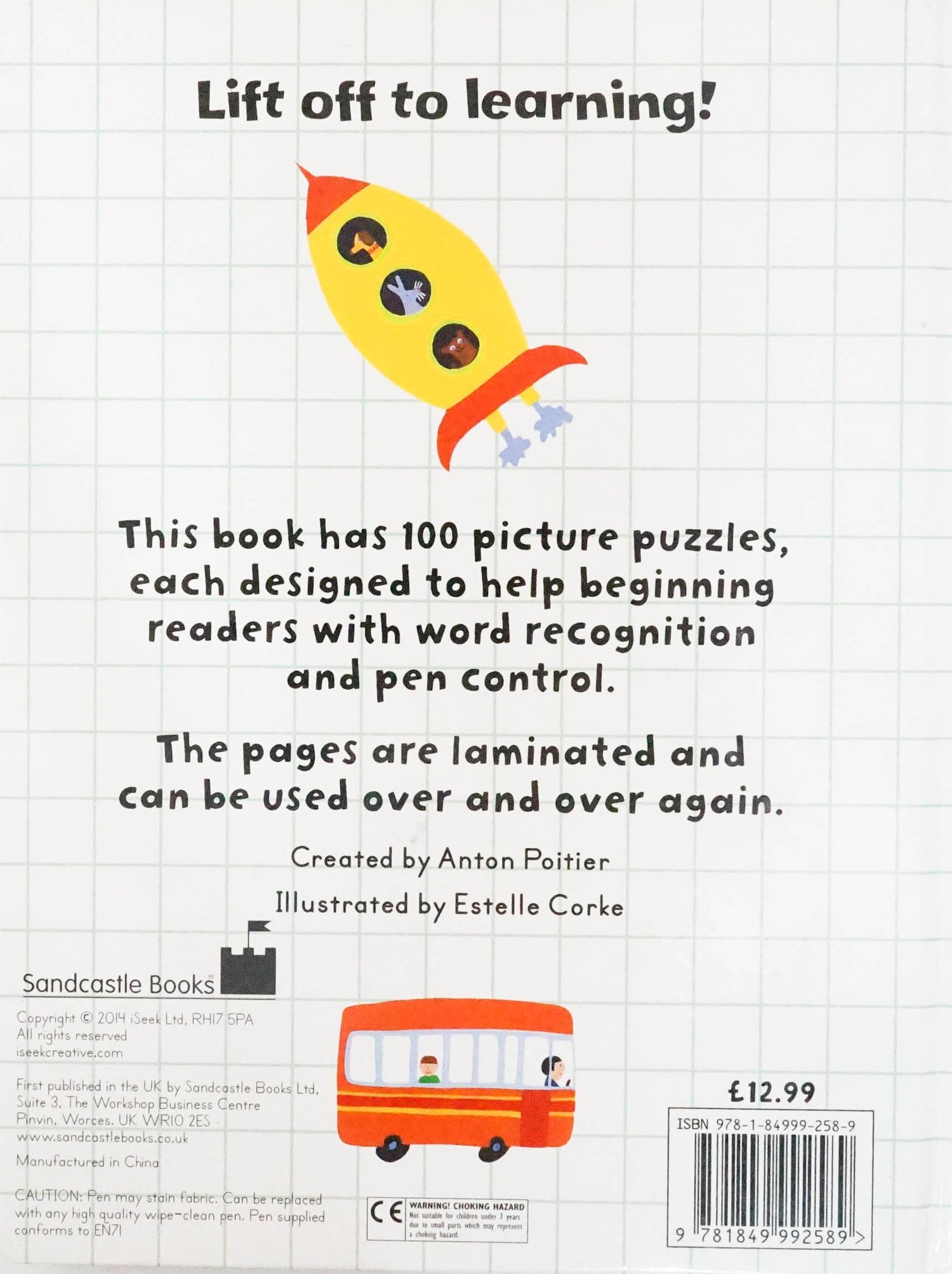 This book has 100 picture puzzles, each designed to help beginning readers with word recognition and pen control. The pages are laminated and can be used over and over again.