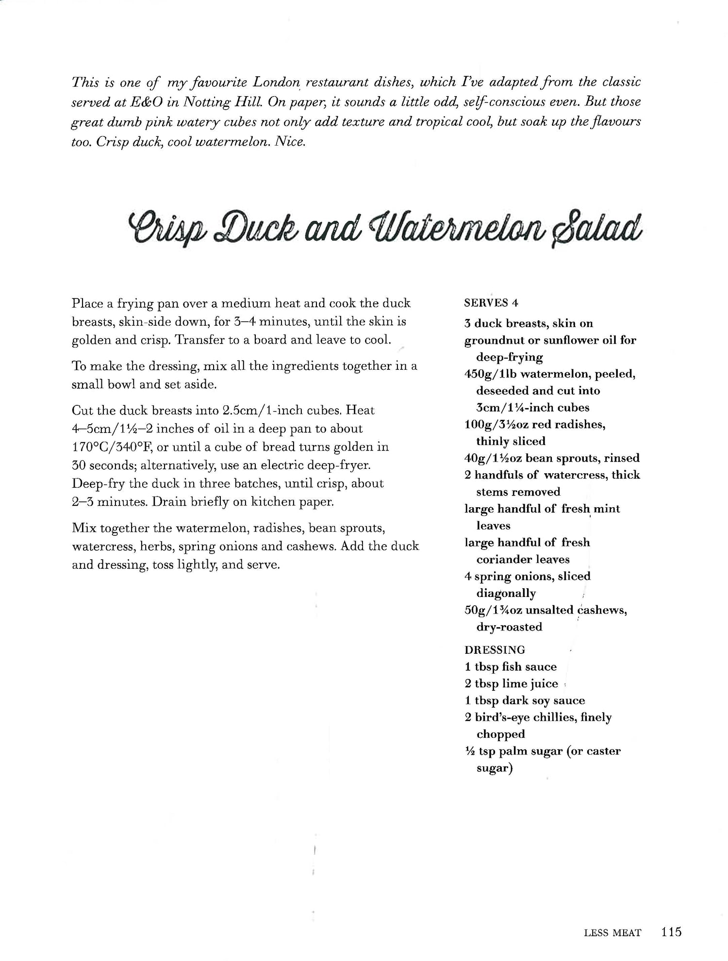 In the Less Meat chapter, meat shares the limelight with other ingredients, and in Meat as Seasoning, scraps of beef, lamb, pork and chicken are eked out to give depth to a range of dishes. There are 120 recipes in total, ranging from meat feasts such as roast beef through to game stock and everything in between.
