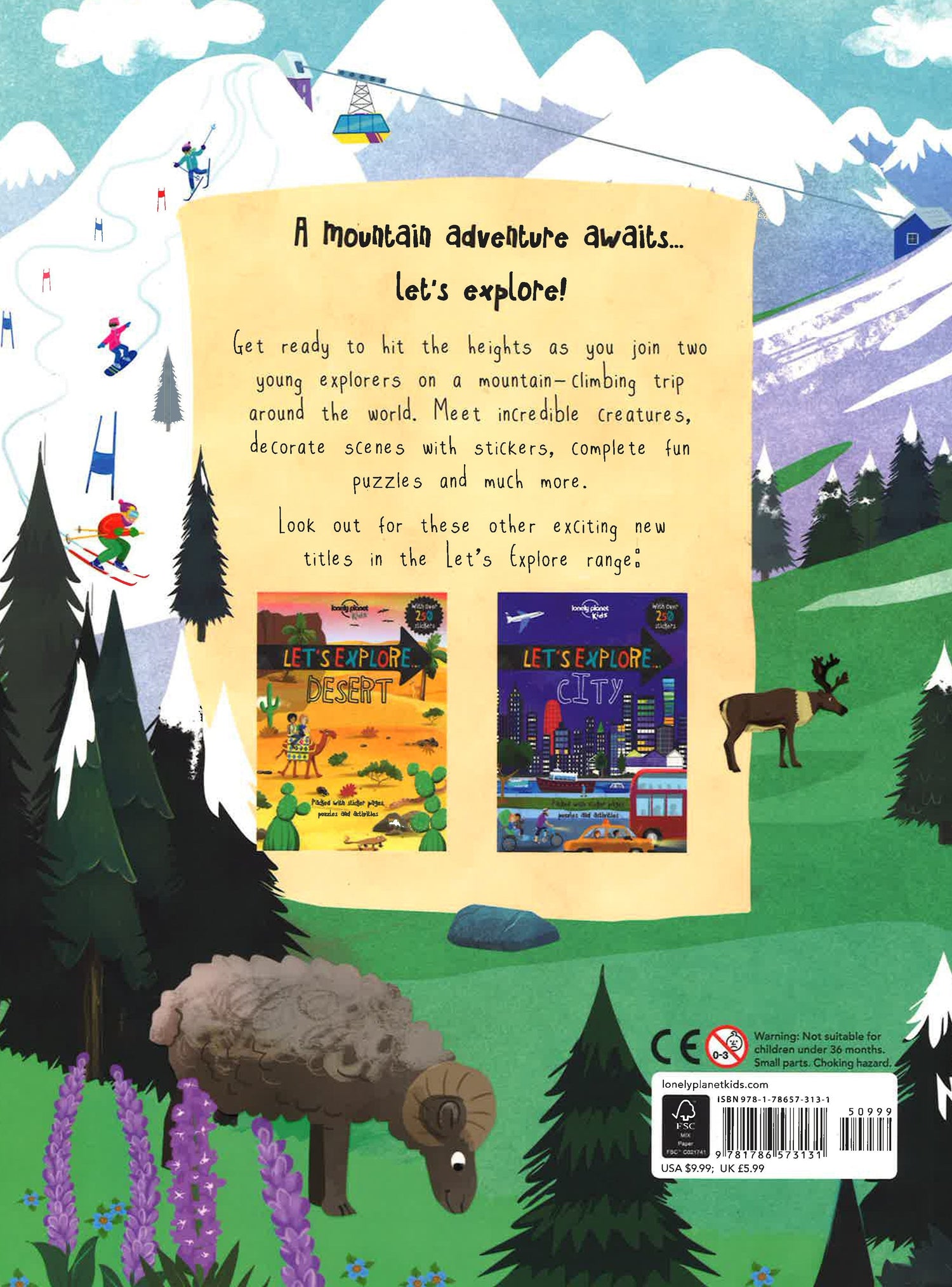 Hit the heights with Marco and Amelia as they travel to some of the world's most incredible mountains. This sticker activity book is packed with puzzles to complete, stickers to add, pages to colour and loads of fascinating facts. Take to the ski slopes in the Alps, tackle the tallest peak in the world, find your way through an Atlas Mountain maze, go wildlife spotting in the Rockies and lots more. Gorgeously illustrated and featuring the Lonely Planet Kids explorers - Marco and Amelia - this is the perfect gift for any curious child aged 5+. A mountain adventure awaits? let's explore! Also available: Let's Explore... Jungle Let's Explore... Ocean Let's Explore... Safari Let's Explore... Desert Let's Explore... City About Lonely Planet Kids: From the world's leading travel publisher comes Lonely Planet Kids, a children's imprint that brings the world to life for young explorers everywhere. With a range of beautiful books for children aged 5-12, we're kickstarting the travel bug and showing kids just how amazing our planet can be. From bright and bold sticker activity books, to beautiful gift titles bursting at the seams with amazing facts, we aim to inspire and delight curious kids, showing them the rich diversity of people, places and cultures that surrounds us. We pledge to share our enthusiasm and love of the world, our sense of humour and continual fascination for what it is that makes the world we live in the diverse and magnificent place it is. It's going to be a big adventure - come explore!