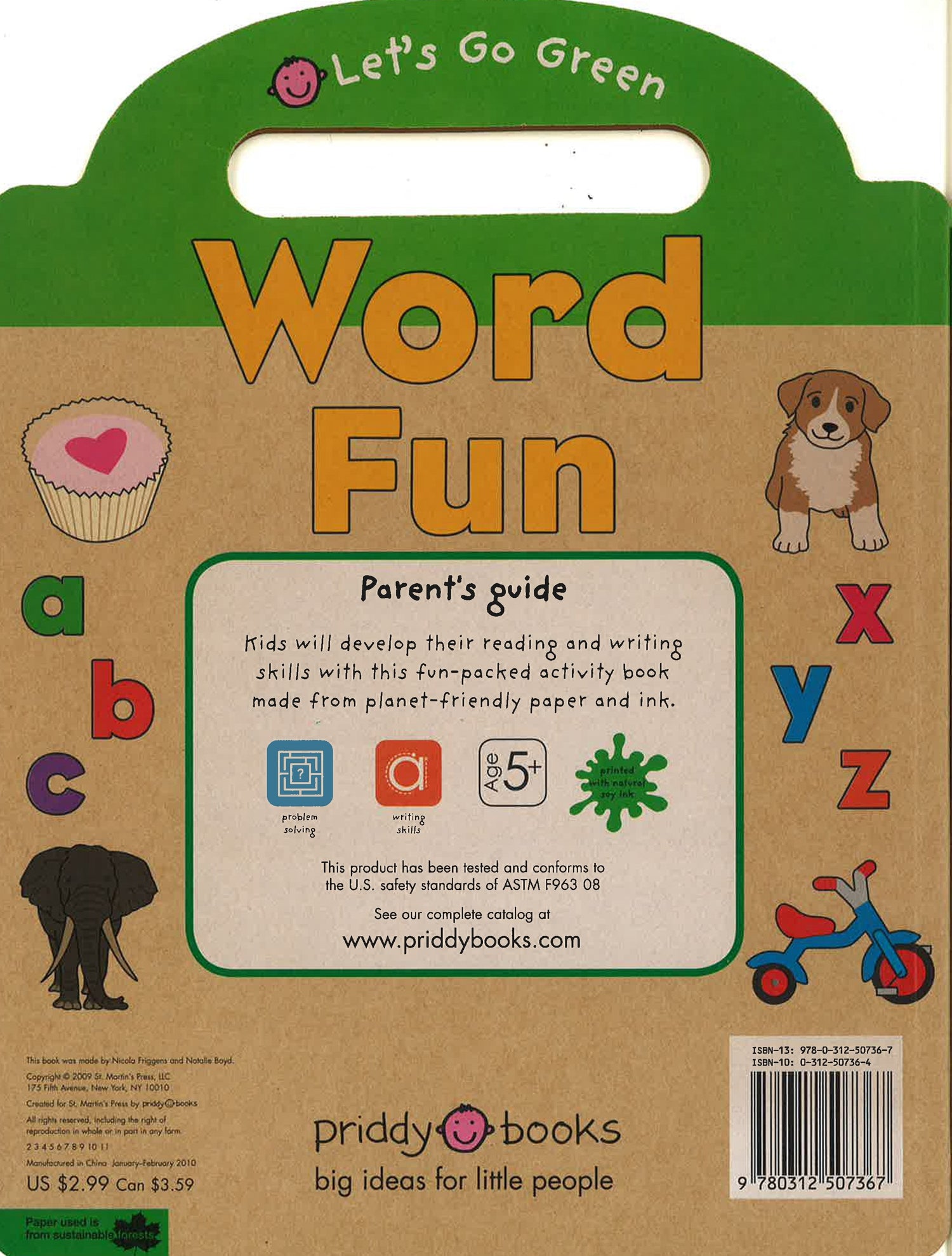 New series planet-friendly puzzle and activity books for children aged five and over . Made with recycled craft paper, printed with natural soy ink . Each title features puzzles and activities to encourage learning and help develop key first skills . Die-cut with a carry handle for little hands to hold.