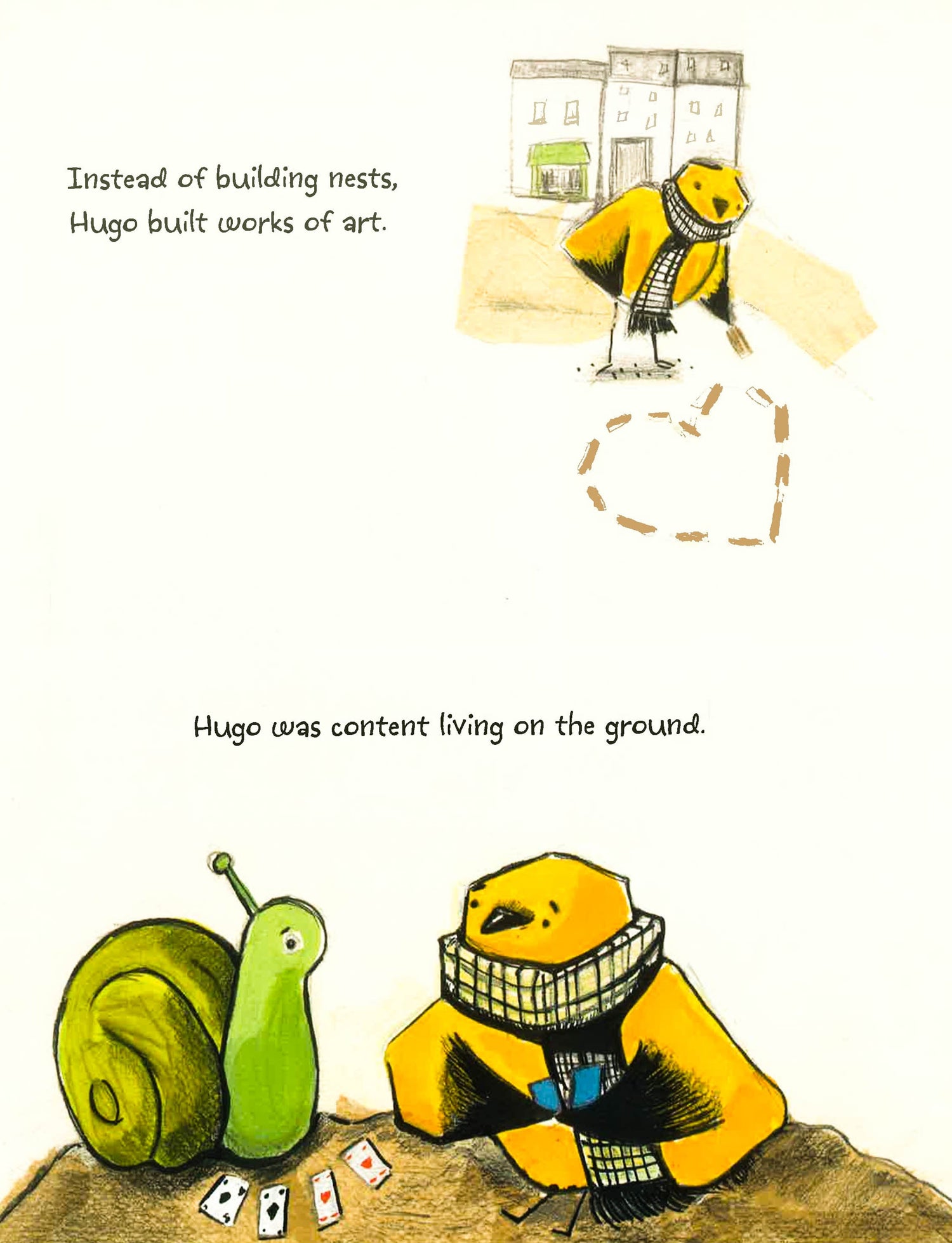 Hugo is a dapper little bird who adores the Eiffel Tower -- or at least his view of it from down here. Hugo, you see, has never left the ground. So when he meets another bird, the determined Lulu, who invites him to fly with her to the top of the tower, Hugo stalls, persuading Lulu to see, on foot, every inch of the park in which he lives instead. Will a nighttime flying lesson from Bernard the Owl, some sweet and sensible encouragement from Lulu, and some extra pluck from Hugo himself finally give this bird the courage he needs to spread his wings and fly?