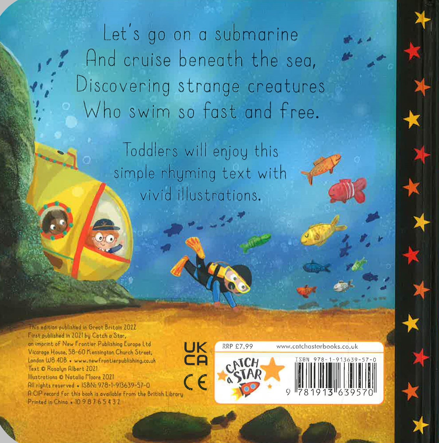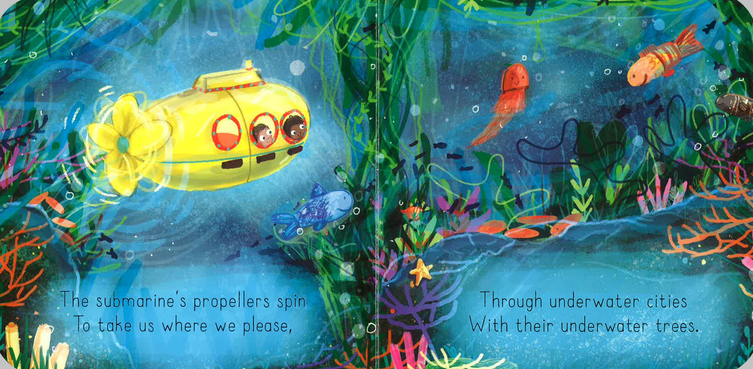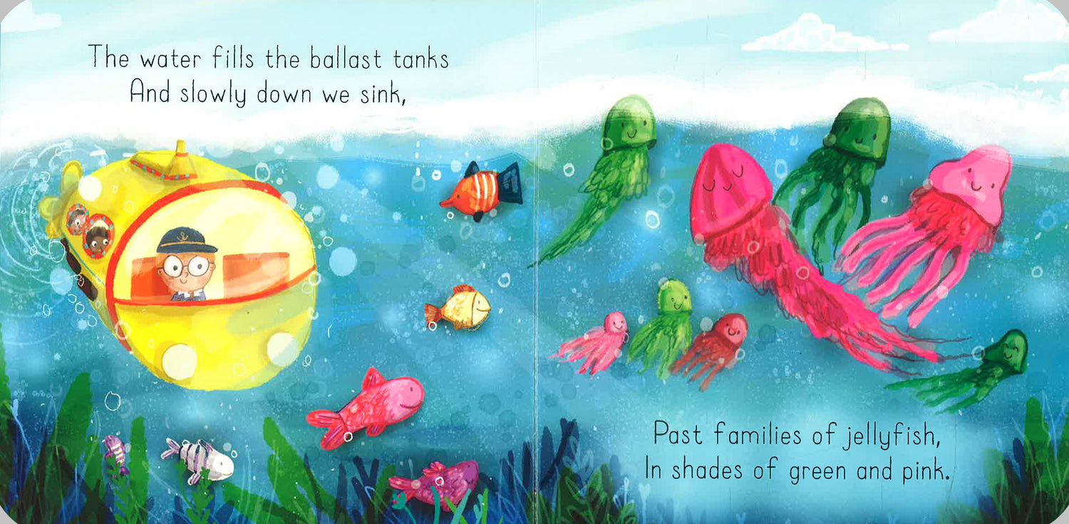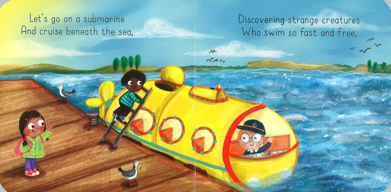 Let's go on a submarine And cruise beneath the sea. Discovering strange creatures Who swim so fast and free.