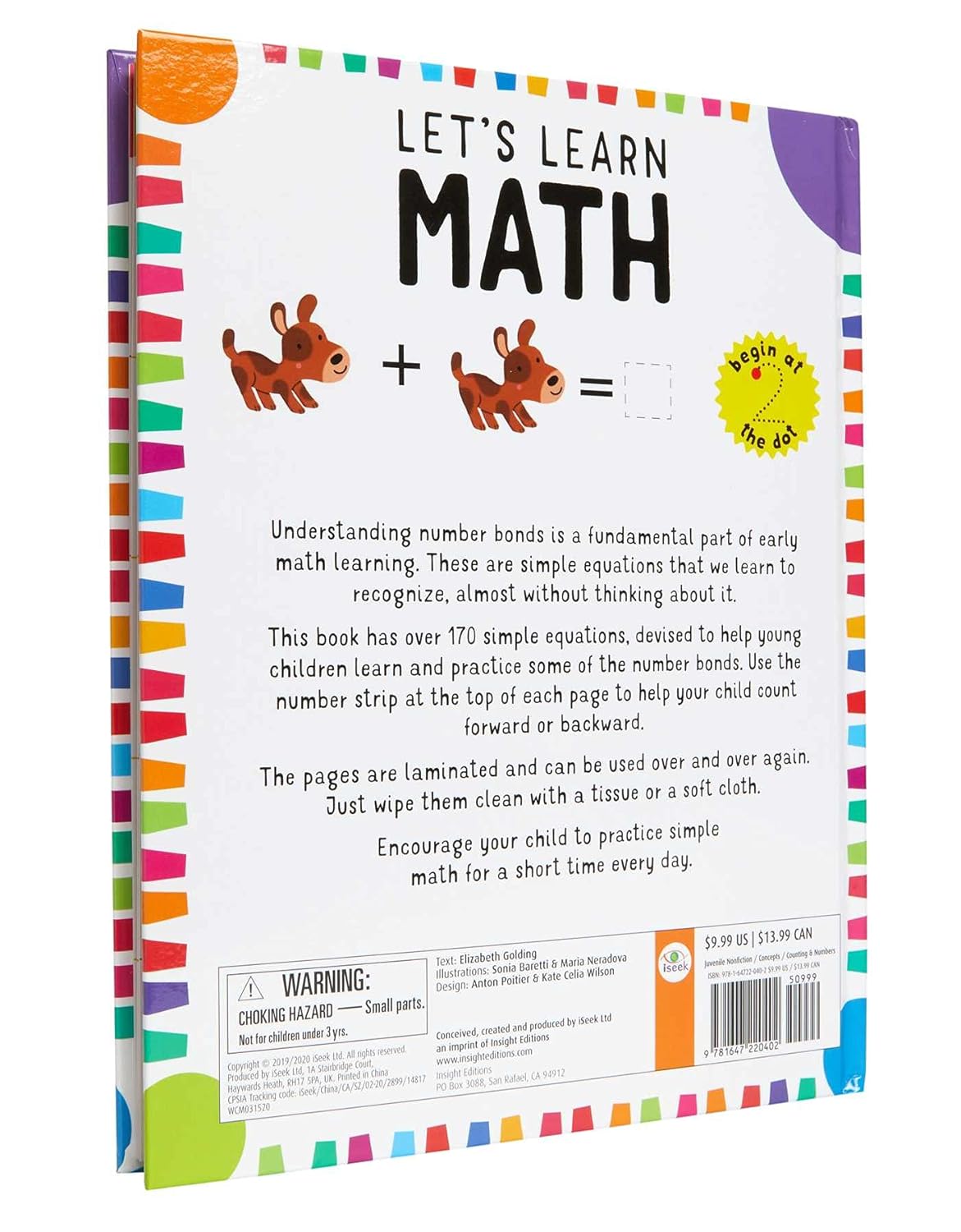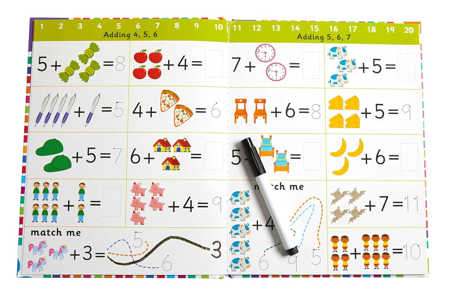 Learning early math skills has never been more fun! With Let’s Learn: First Math Skills, kids will be introduced to early math principles including counting, addition and subtraction, and practice pen control and number forms over and over again. Using the included pen on sturdy specially-coated pages, young learners can trace over the dotted lines of numbers and write their answers to math problems. Simply wipe off with a tissue or soft cloth to practice again and again and try again when mistakes are made. The pen fits securely on the book’s cover for easy take-and-go learning anywhere, anytime.