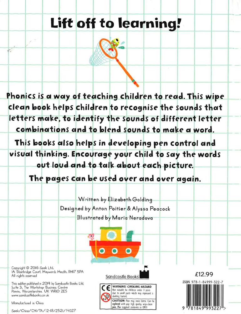 Phonics is a way of teaching children to read. This wipe clean book helps children to recognise the sounds that letters make, to identify the sounds of different letter combinations and to blend sounds to make a word. This book also helps in developing pen control and visual thinking. Encourage your child to say the words out loud and to talk about each picture. The pages can be used over and over again.