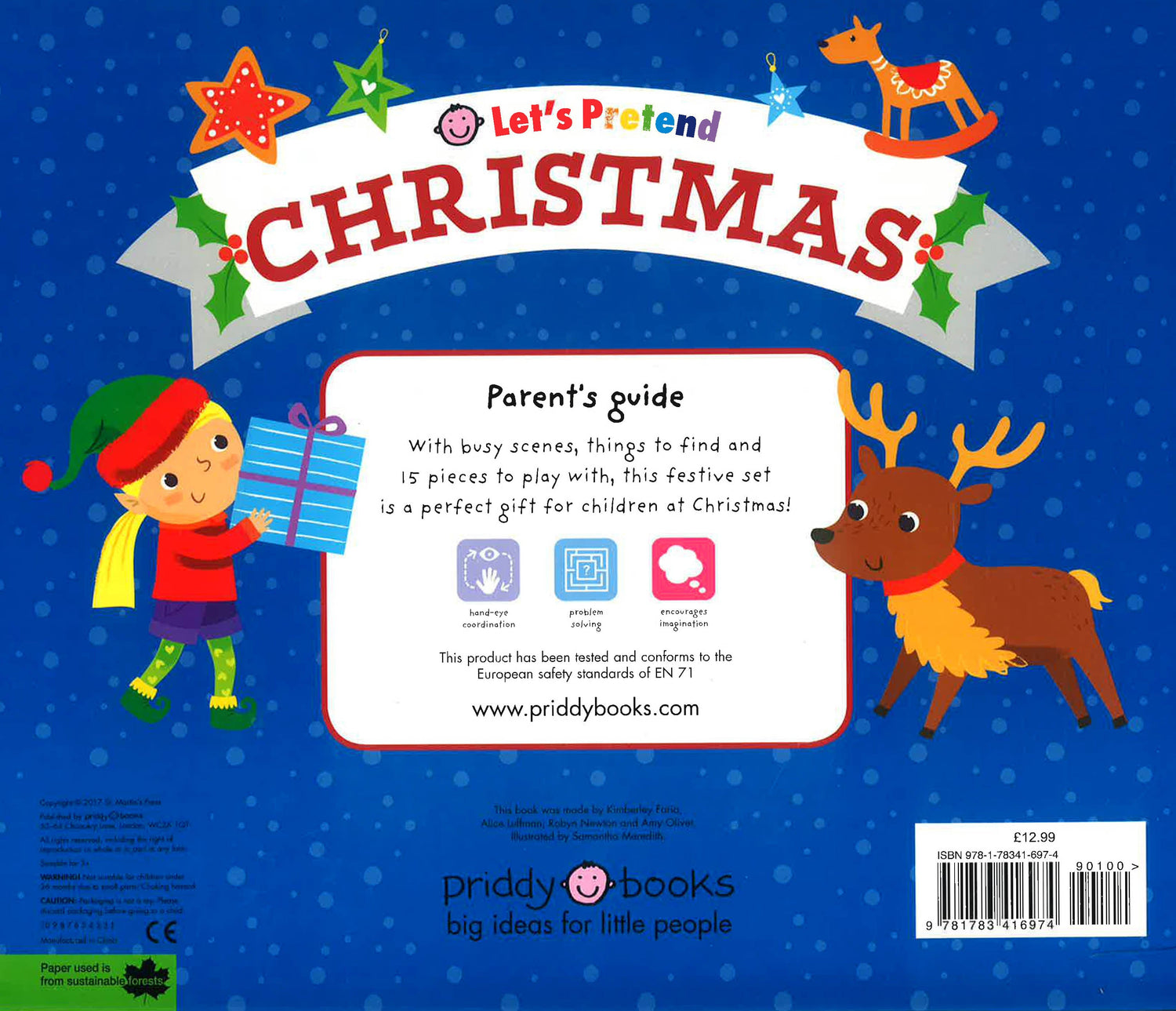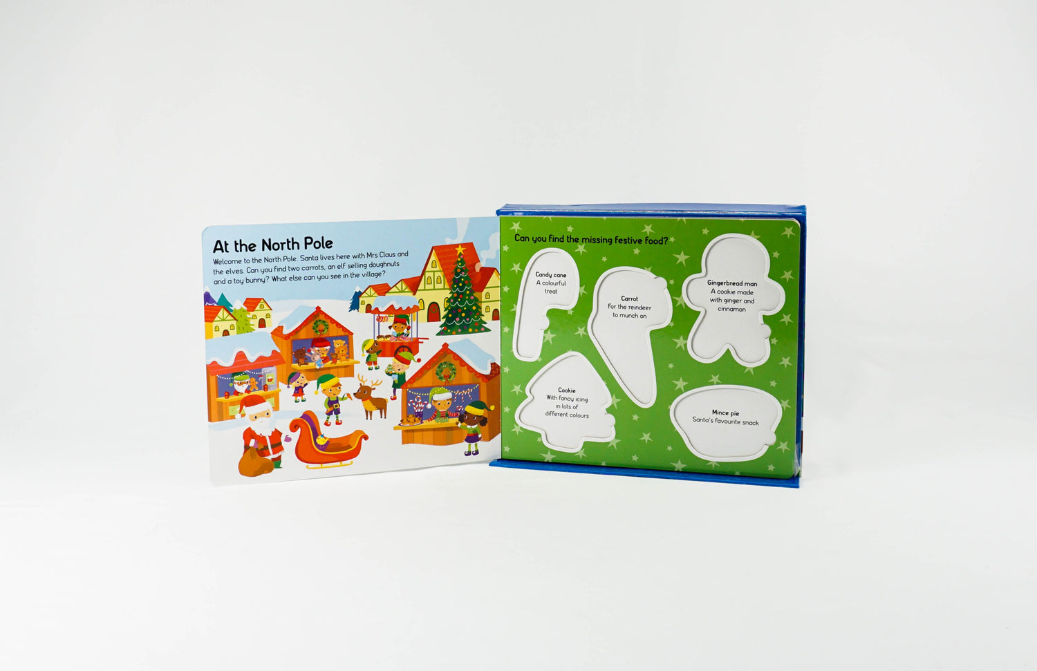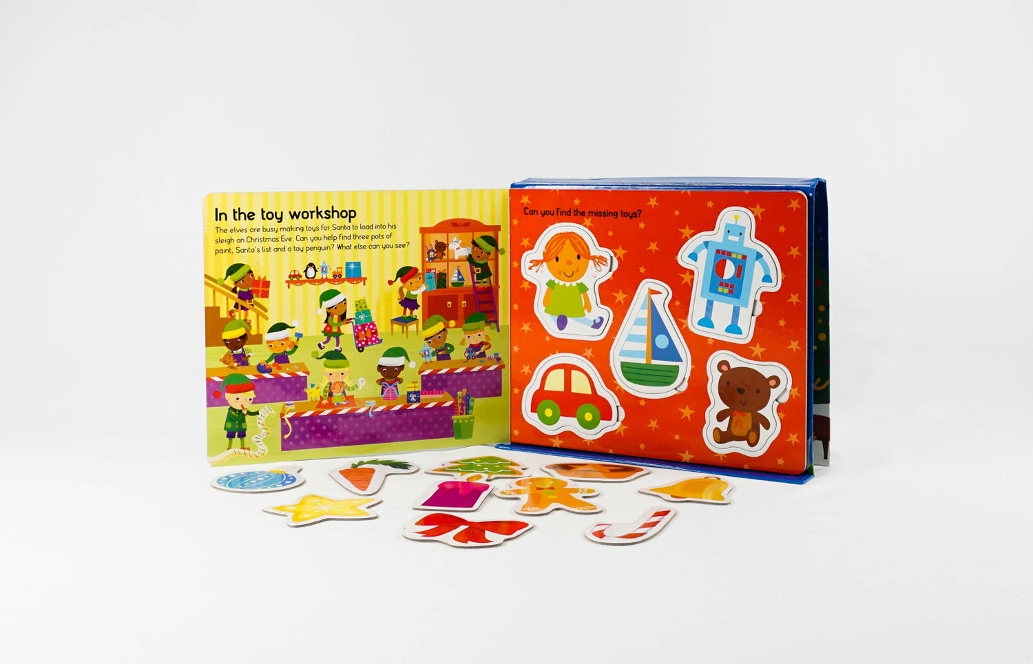 Enjoy Christmas creative and imaginative play with this themed set. Each set includes a board book with busy scenes full of objects to see and find, plus 15 chunky puzzle pieces to place in the book pages. All packaged in a presentation box. Encourages development of vocabulary and hand-eye coordination skills.