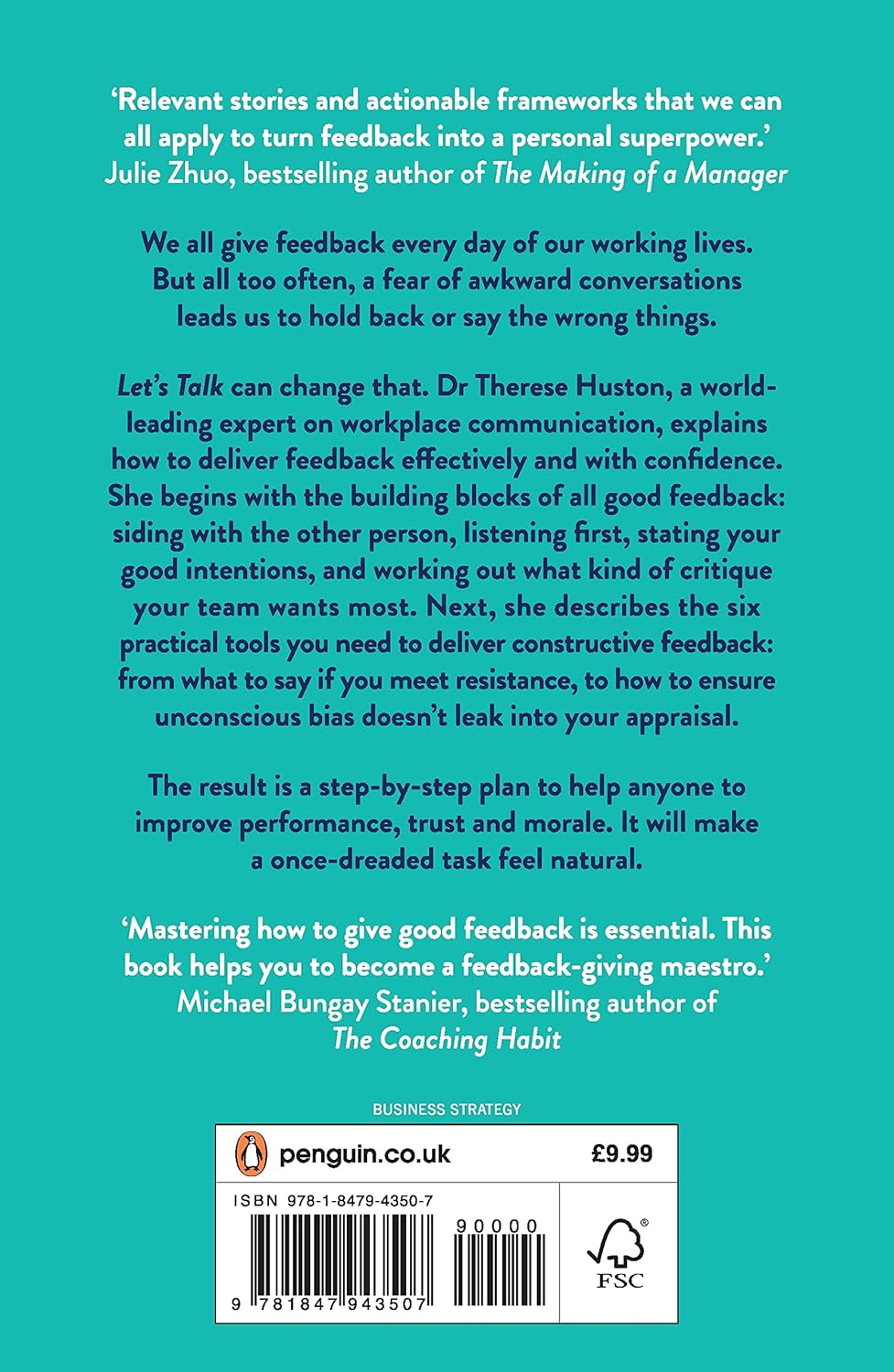 Let's Talk can change that. Dr Therese Huston, a world-leading expert on workplace communication, explains how to deliver feedback effectively and with confidence. She begins with the building blocks of all good feedback: siding with the other person, listening first, stating your good intentions, and working out what kind of critique your team wants most. Next, she describes the six practical tools you need to deliver constructive feedback: from what to say if you meet resistance, to how to ensure unconscious bias doesn't leak into your appraisal.