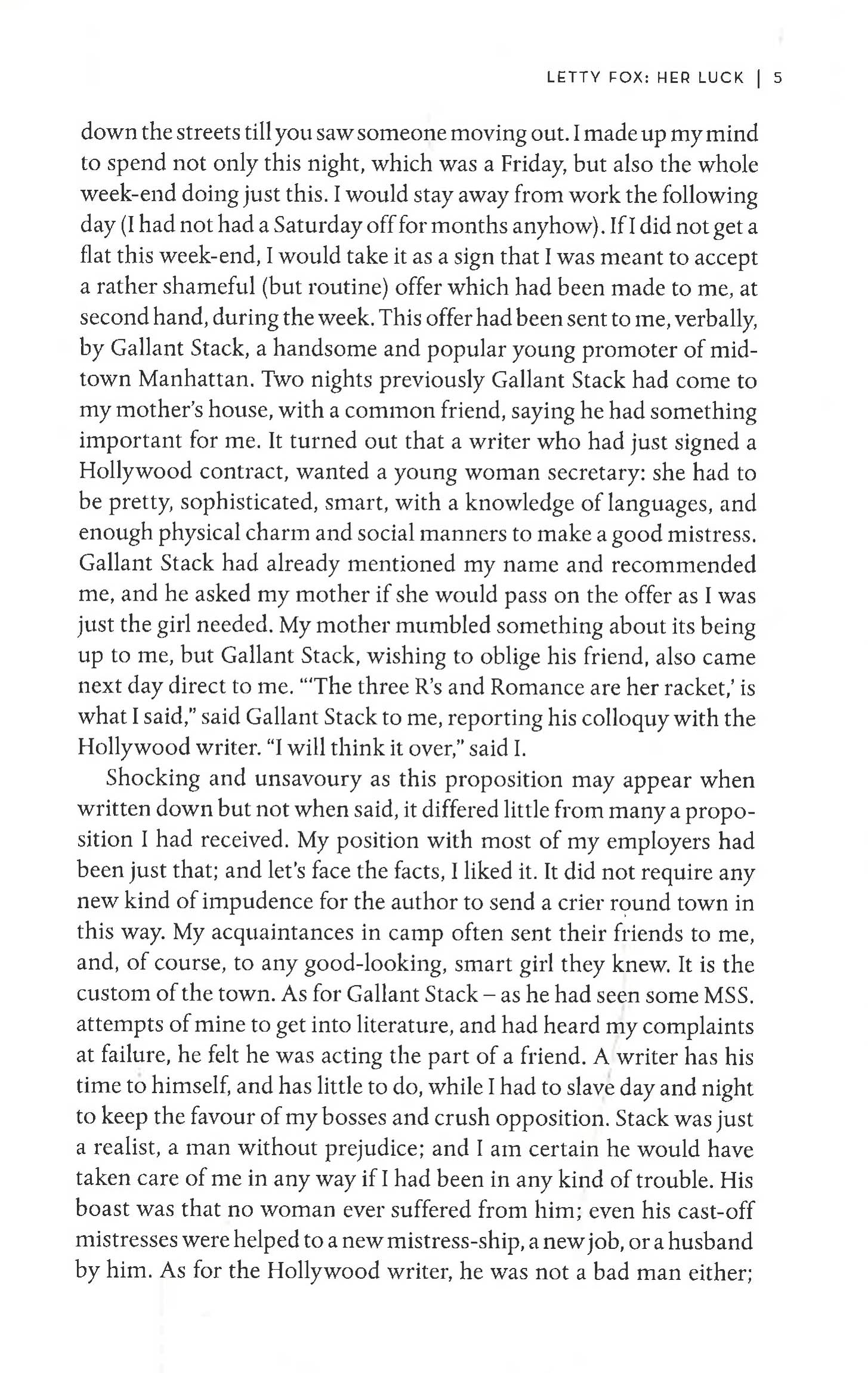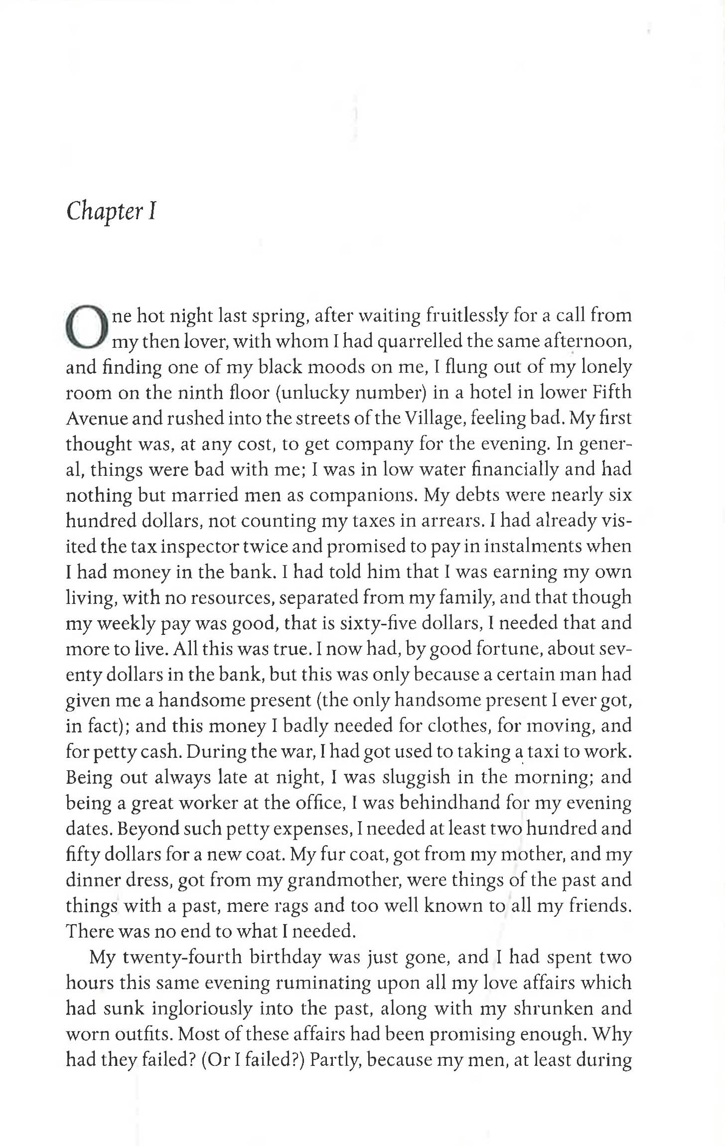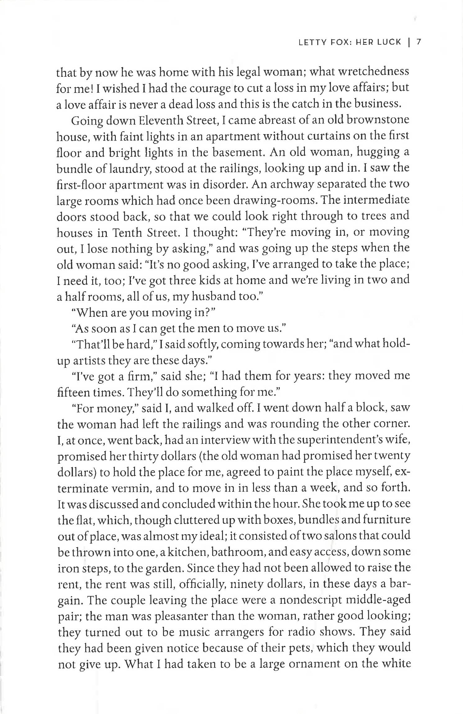 One hot night last spring, after waiting fruitlessly for a call from my then lover, with whom I had quarrelled the same afternoon, and finding one of my black moods on me, I flung out of my lonely room on the ninth floor (unlucky number) in a hotel in lower Fifth Avenue and rushed into the streets of the Village, feeling bad. Letty Fox is hunting for a husband. Her picaresque adventures are brilliantly described in this imaginative portrayal of a woman who might have been independent, but chose otherwise.