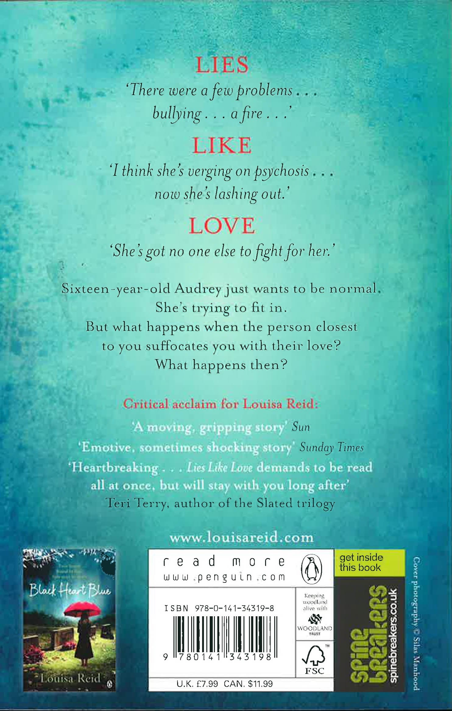 A BRILLIANT TWIST' Sunday Express Lies Like Love is the haunting and heart-breaking new novel from Louisa Reid, critically acclaimed author of Black Heart Blue. LIES 'There were a few problems ...bullying ...a fire ...' LIKE 'I think she's verging on psychosis ...now she's lashing out.' LOVE 'She's got no one else to fight for her.' Sixteen year-old Audrey just wants to be normal. She's trying to fit in. But what happens when the person closest to you suffocates you with their love? What happens then? Praise for Louisa Reid: 'Absolutely wonderful' Guardian 'Emotive, sometimes shocking story' Sunday Times 'A moving, gripping story' Sun '[Lies Like Love] ...chillingly unravels a dysfunctional relationship that threatens to destroy the love it feeds on. Reid evokes the uncertainty and joy of teenage romance with all its passion and pain and brilliantly controls the increasingly disturbing truth ...' Daily Mail 'Heartbreaking ...Demands to be read all at once, but will stay with you long after' Teri Terry, author of the Slated trilogy 'Stunning, shocking, sad and incredibly touching ...You will read it in one sitting then want to share the book with someone else' LoveReading 'We read this in one sitting.