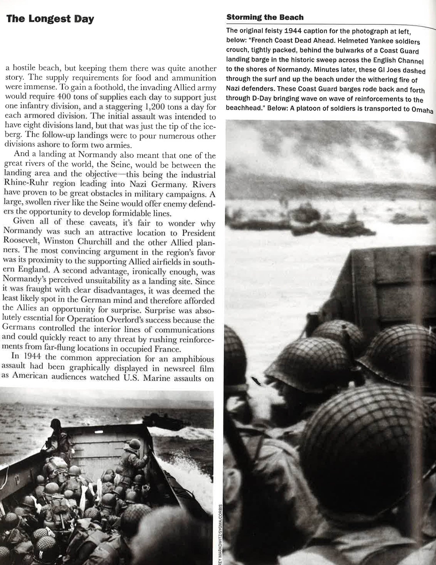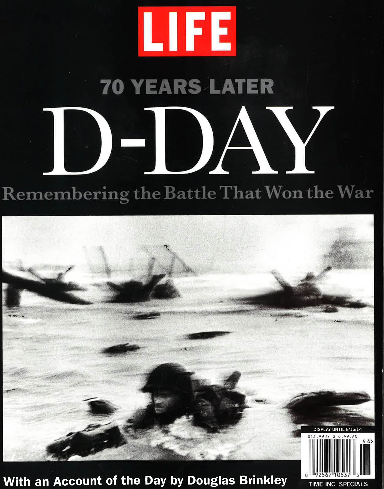 Probably the most famous combat photographs ever made were those taken on the beach in Normandy during the D-Day invasions by Robert Capa, shooting for LIFE and going in with the first wave. The saga of those images has been told before and will be again in this commemorative book: How Capa got out alive (he would later be killed while covering war in Southeast Asia), how he got his film back to London for transfer to New York, how most of his images were ruined and the 11 frames that survived had taken on a grainy quality that seemed to reflect the shaking beach under German bombardment, and even how Steven Spielberg used that look to inform the first half-hour of his classic film Saving Private Ryan. Armed with two cameras, LIFE's Capa volunteered to hit the French coast, code-named Omaha Beach, with the first wave of 1st Division soldiers, and later remembered (in the kind of first-hand testimony that will fill this book) bullets tearing "holes in the water around him," and then what he saw as an idyllic shoreline becoming "the ugliest beach in the world."