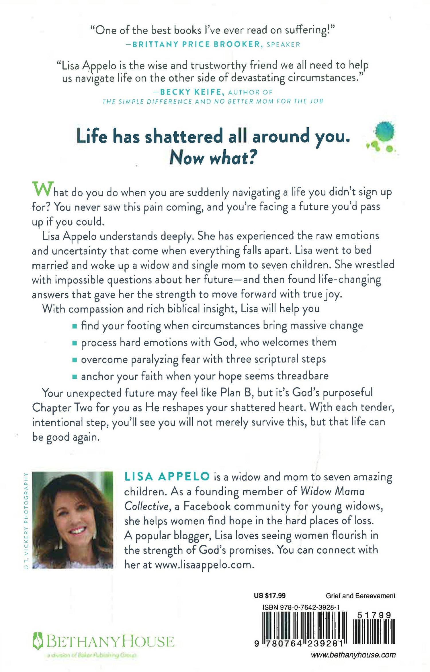 With compassion and rich biblical insight, Lisa will help you * find your footing when circumstances bring massive change; * process hard emotions with God, who welcomes them; * overcome paralyzing fear with three scriptural steps; and * anchor your faith when your hope seems threadbare. Your unexpected future may feel like Plan B, but it's God's purposeful Chapter Two for you as He reshapes your shattered heart. With each tender, intentional step, you'll see you will not merely survive this, but that life can be good again.