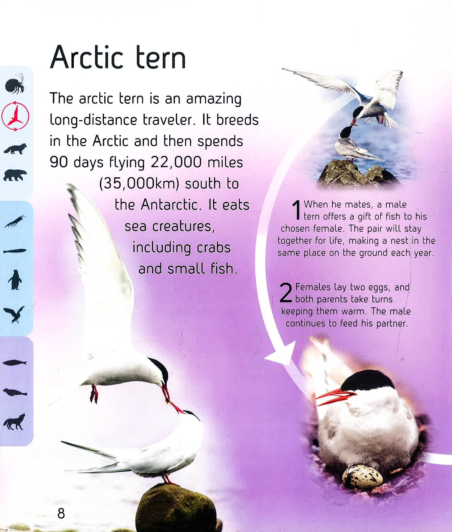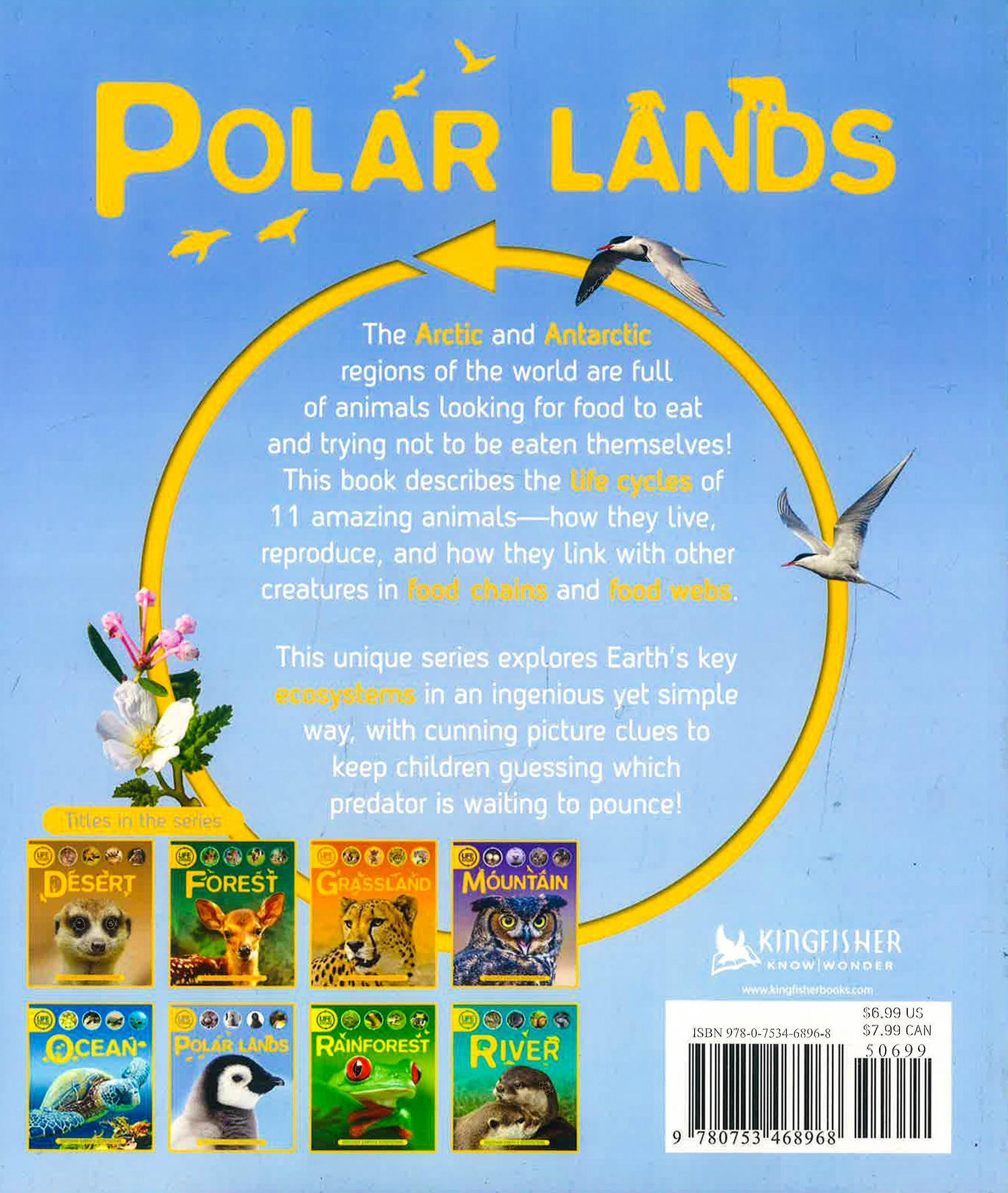 Although they are deceptively stark, the world's Polar Regions support a surprisingly diverse range of wildlife. This book explores how ten of these creatures from both poles--including the arctic fox, the polar bear, the ringed seal, and the arctic tern--are all interrelated in three polar food chains. Along with a clear explanation of each lifecycle, the book highlights three key facts about each animal, and color-codes the food-chains for easy navigation. The beautiful photography, accessible design, and age appropriate writing make this the perfect introduction to understanding the delicate balance of this extreme and environmentally sensitive habitat.