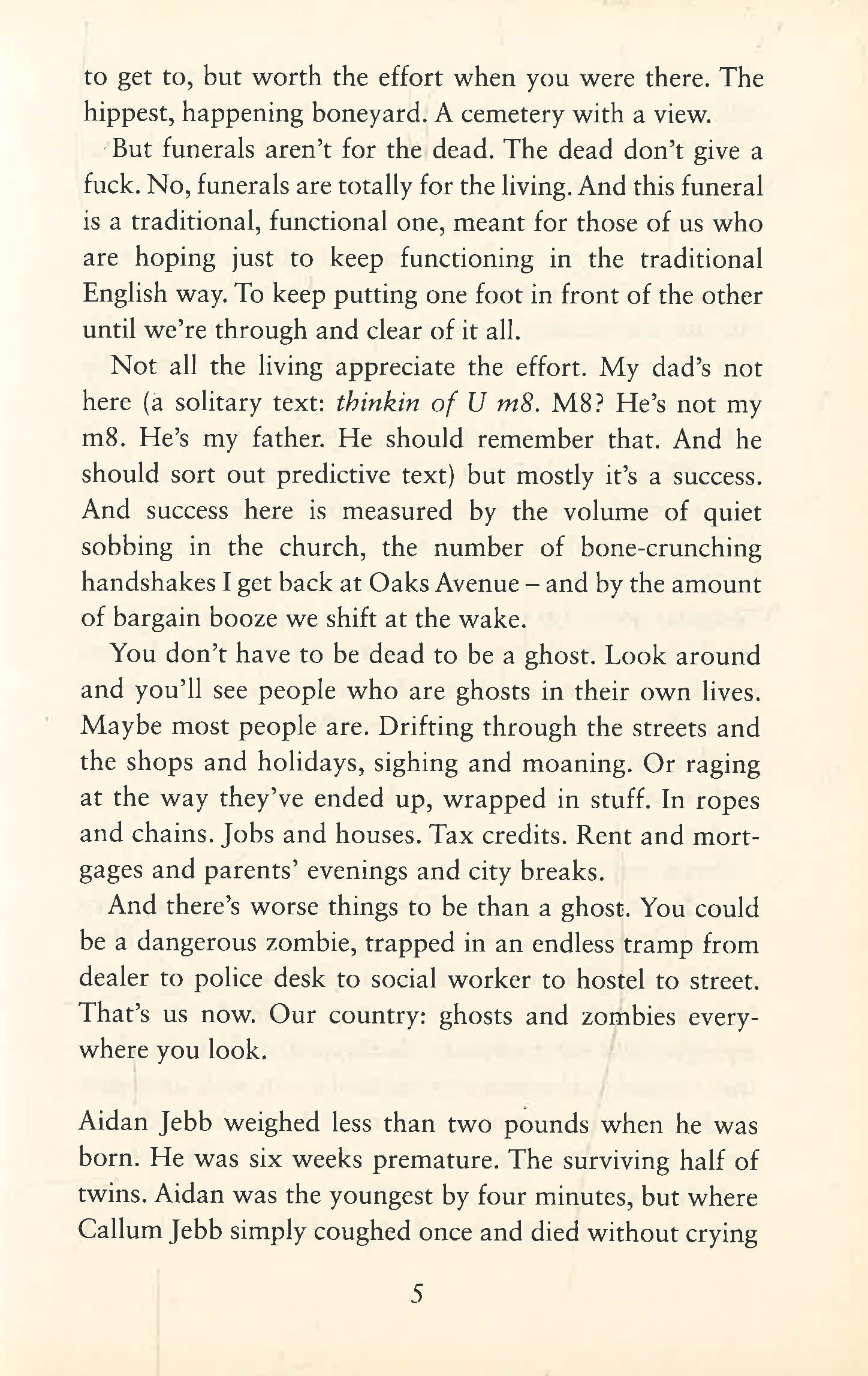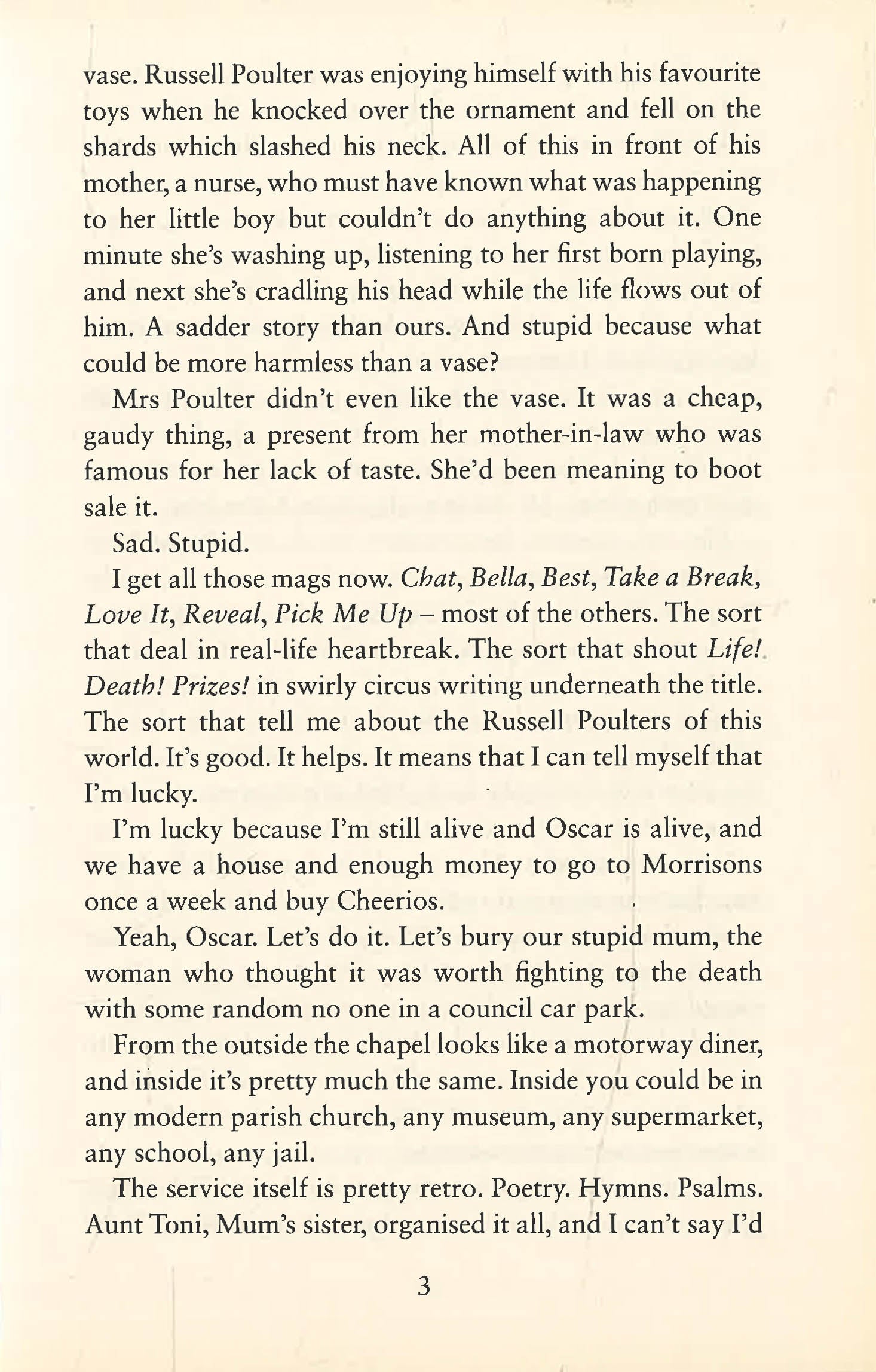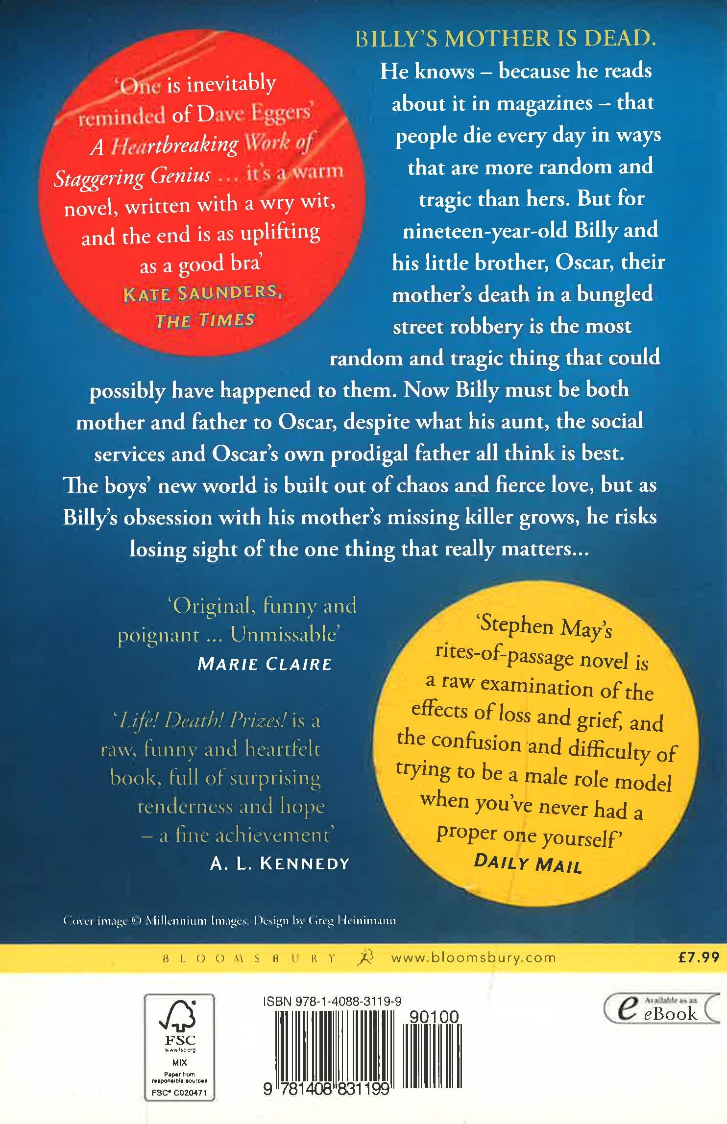 Shortlisted for the 2012 COSTA Novel Award Billy's Mum is dead. He knows - because he reads about it in magazines - that people die every day in ways that are more random and tragic and stupid than hers, but for nineteen-year-old Billy and his little brother, Oscar, their mother's death in a bungled street robbery is the most random and tragic and stupid thing that could possibly have happened to them. Now Billy must be both mother and father to Oscar, and despite what his well-meaning aunt, the PTA mothers, the social services and Oscar's own prodigal father all think, he knows he is more than up to the job, thank you very much. The boys' new world, where bedtimes are arbitrary, tidiness is optional and healthy home-cooked meals pile up uneaten in the freezer, is built out of chaos and fierce love, but it's also a world that teeters perilously on its axis. And as Billy's obsession with his mother's missing killer grows, he risks losing sight of the one thing that really matters... Funny, bittersweet and unforgettable, Life! Death! Prizes! is a story of grief, resilience and brotherly love.