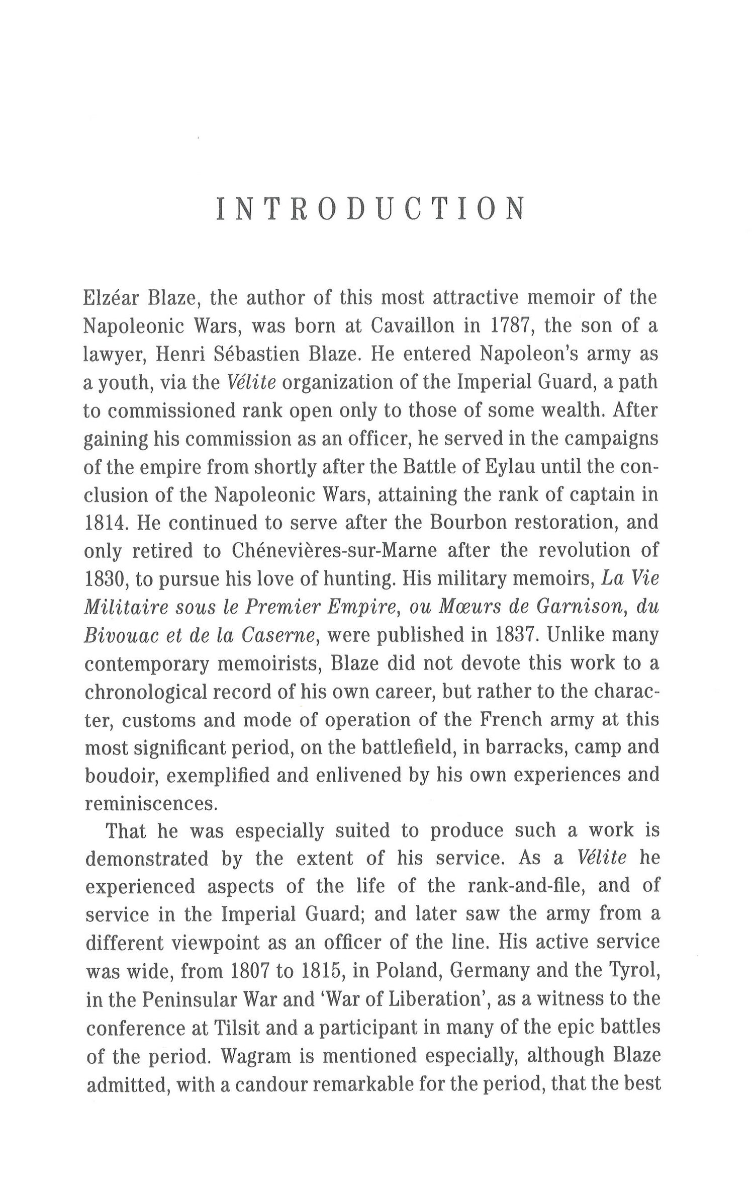 'Blaze was an acute observer of human nature ...these memoirs have great charm, enhanced by the author's honesty and readiness to admit his true feelings ...another fine addition to their outstanding Napoleonic Library.' British Army Review Blaze's memoirs are one of the most fascinating recollections of the Napoleonic Wars ever to be published. Written by an officer of wide experience and colourful style, the memoirs present an outstanding picture of the First Empire, providing an officer's perspective view of the character, customs and mode of operation of the French army. Its value is enriched and enlivened by anecdotes from the author's own experiences. Blaze entered the army as a youth, via the Imperial Guard elite organisation, a path only open to those of some wealth. After gaining his commission as an officer, he served in the campaigns from Poland in 1807 to the fall of France in 1814. The wide range and extent of his service made Blaze perfectly suited to produce a record of Napoleon's army during this climactic period.