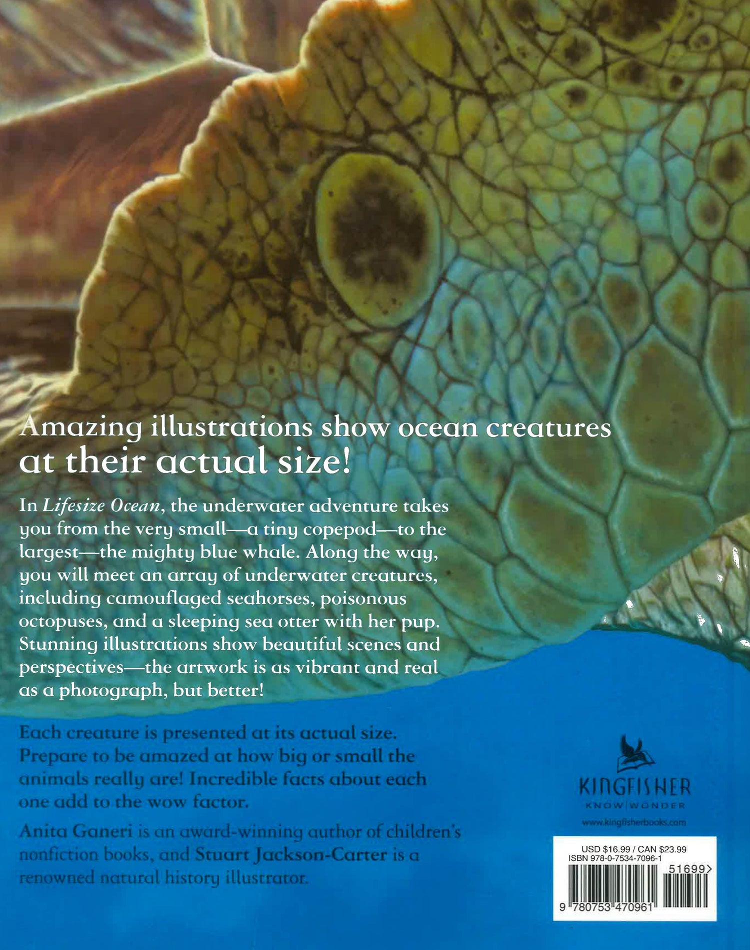 Lifesize Ocean offers young readers a unique opportunity to see a variety of sea animals at their actual size. This enchanting, underwater adventure starts off with the smallest of sea creaturestiny copepods, and ends with the largest the blue whale. Along the journey children come face-to-face with an amazing array of underwater creatures including the golf ball-sized blue-ringed octopus and the majestic green sea turtle. This book and its incredible life-like artwork must be seen to be believed.