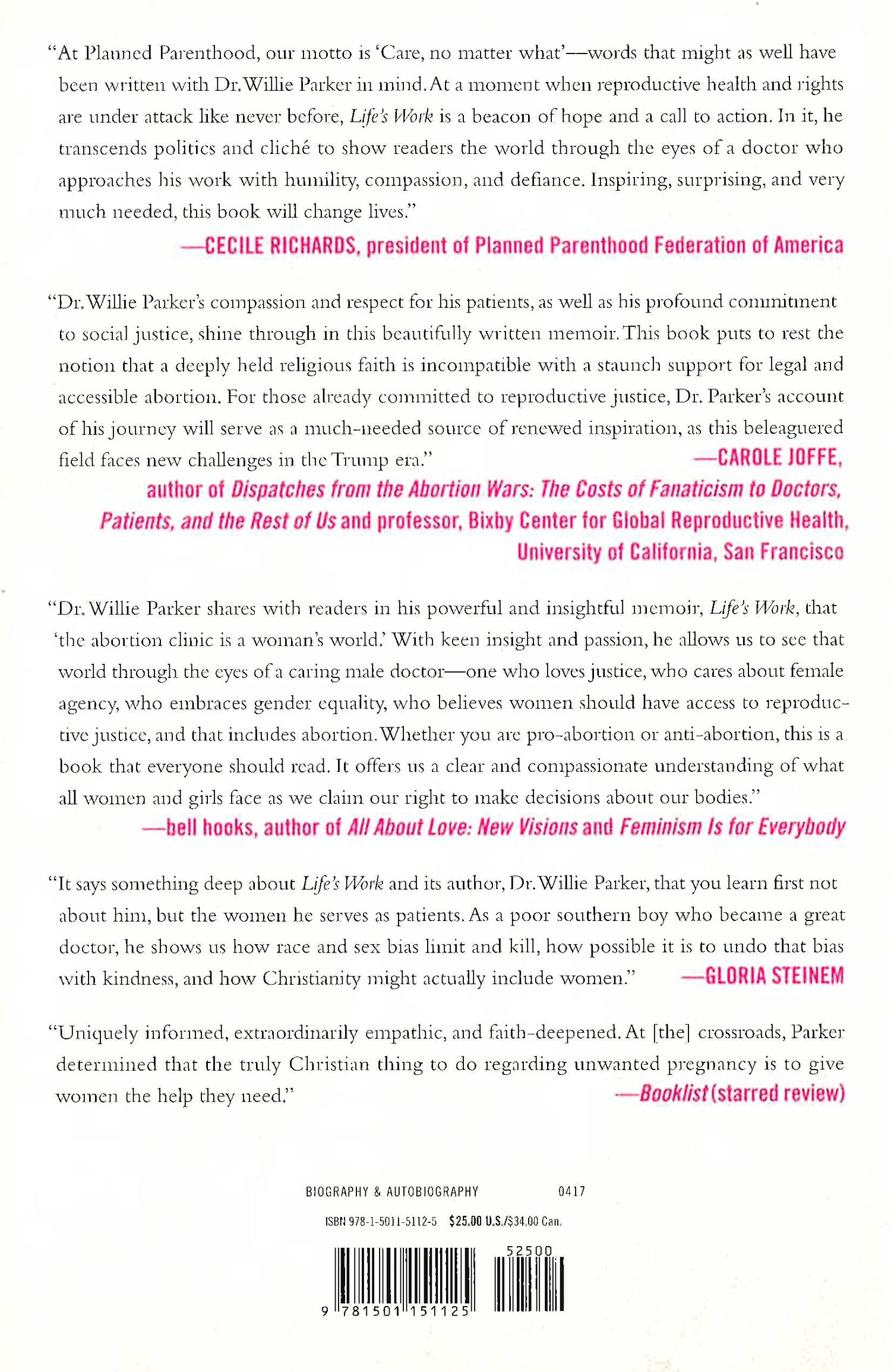 In Life’s Work, an outspoken, Christian reproductive justice advocate and abortion provider (one of the few doctors to provide such services to women in Mississippi and Alabama) pulls from his personal and professional journeys as well as the scientific training he received as a doctor to reveal how he came to believe, unequivocally, that helping women in need, without judgment, is precisely the Christian thing to do.Dr. Willie Parker grew up in the Deep South, lived in a Christian household, and converted to an even more fundamentalist form of Christianity as a young man. But upon reading an interpretation of the Good Samaritan in a sermon by Dr. Martin Luther King, Jr., he realized that in order to be a true Christian, he must show compassion for all women regardless of their needs. In 2009, he stopped practicing obstetrics to focus entirely on providing safe abortions for the women who need help the most - often women in poverty and women of color - and in the hot bed of the pro-choice debate: the South. He soon thereafter traded in his private practice and his penthouse apartment in Hawaii for the life of an itinerant abortion provider, focusing most recently on women in the Deep South.In Life’s Work, Dr. Willie Parker tells a deeply personal and thought-provoking narrative that illuminates the complex societal, political, religious, and personal realities of abortion in the United States from the unique perspective of someone who performs them and defends the right to do so every day. He also looks at how a new wave of anti-abortion activism, aimed at making incremental changes in laws and regulations state by state, are slowly chipping away at the rights of women to control their own lives. In revealing his daily battle against mandatory waiting periods and bogus rules governing the width of hallways, Dr. Parker uncovers the growing number of strings attached to the right to choose and makes a powerful Christian case for championing reproductive rights.