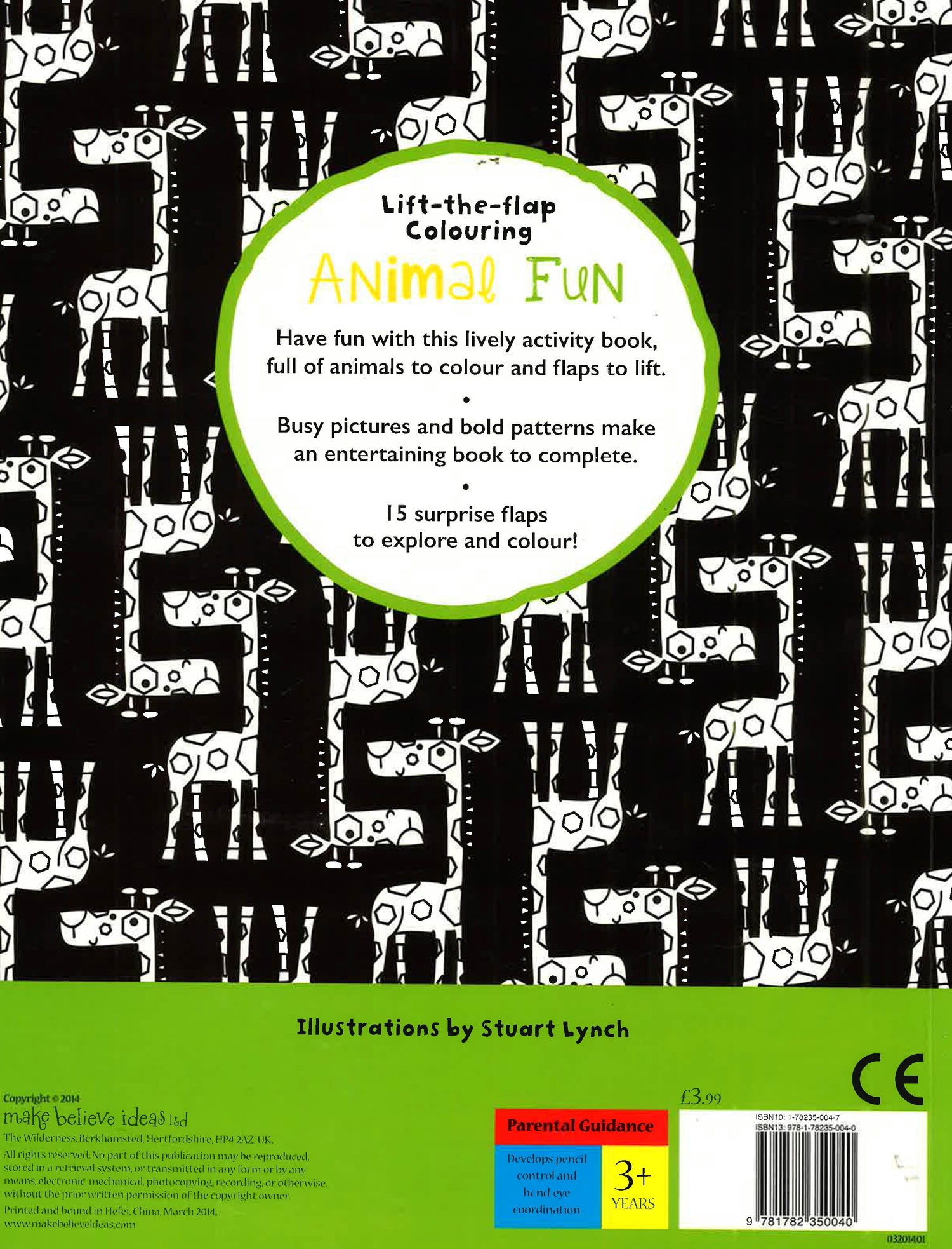 Have fun with this lively activity book , full of animals to colour and flap ti lift. Busy pictures and bold patterns make an entertaining book to complete. 15 surprise flaps to explore and colour