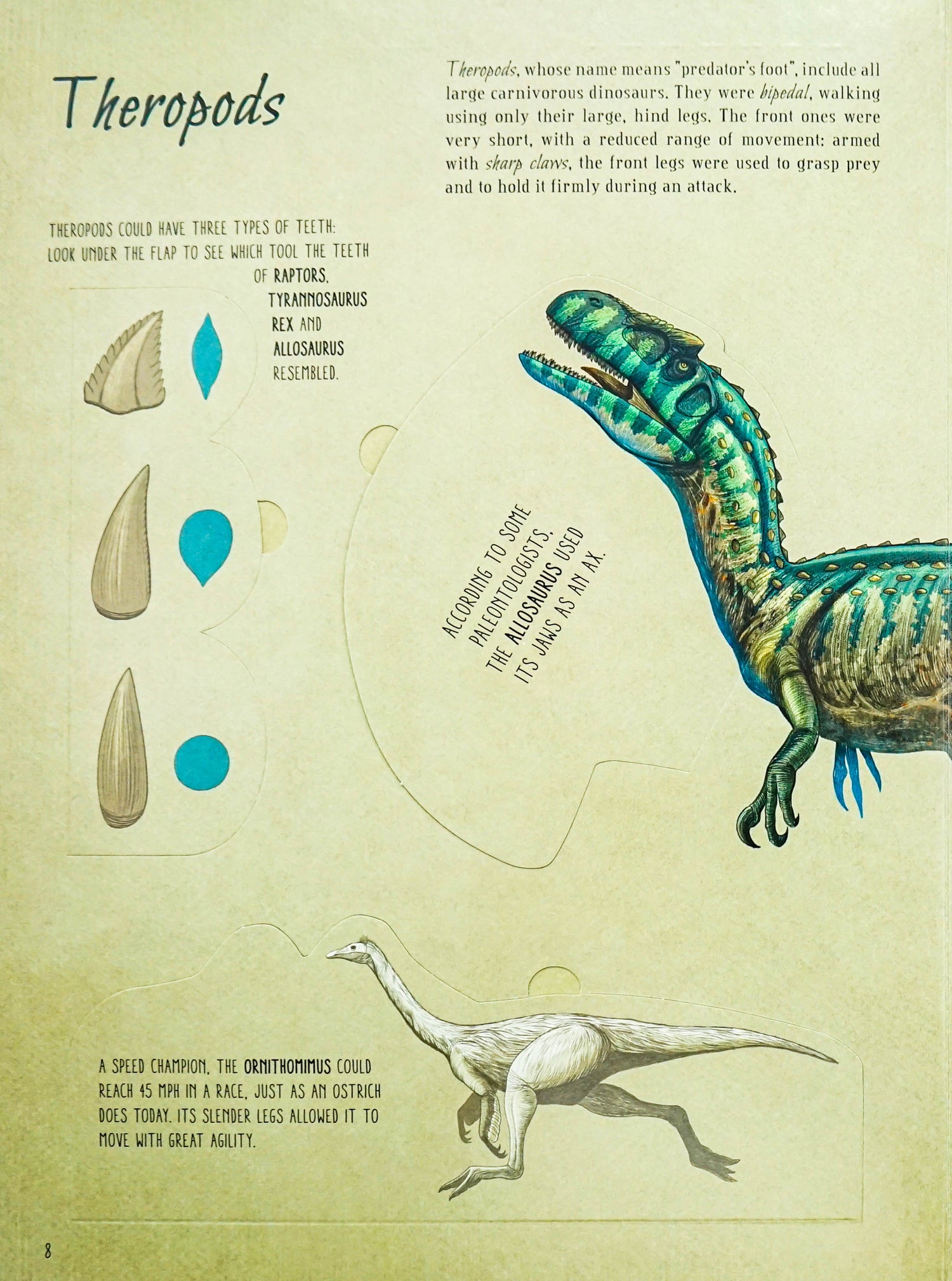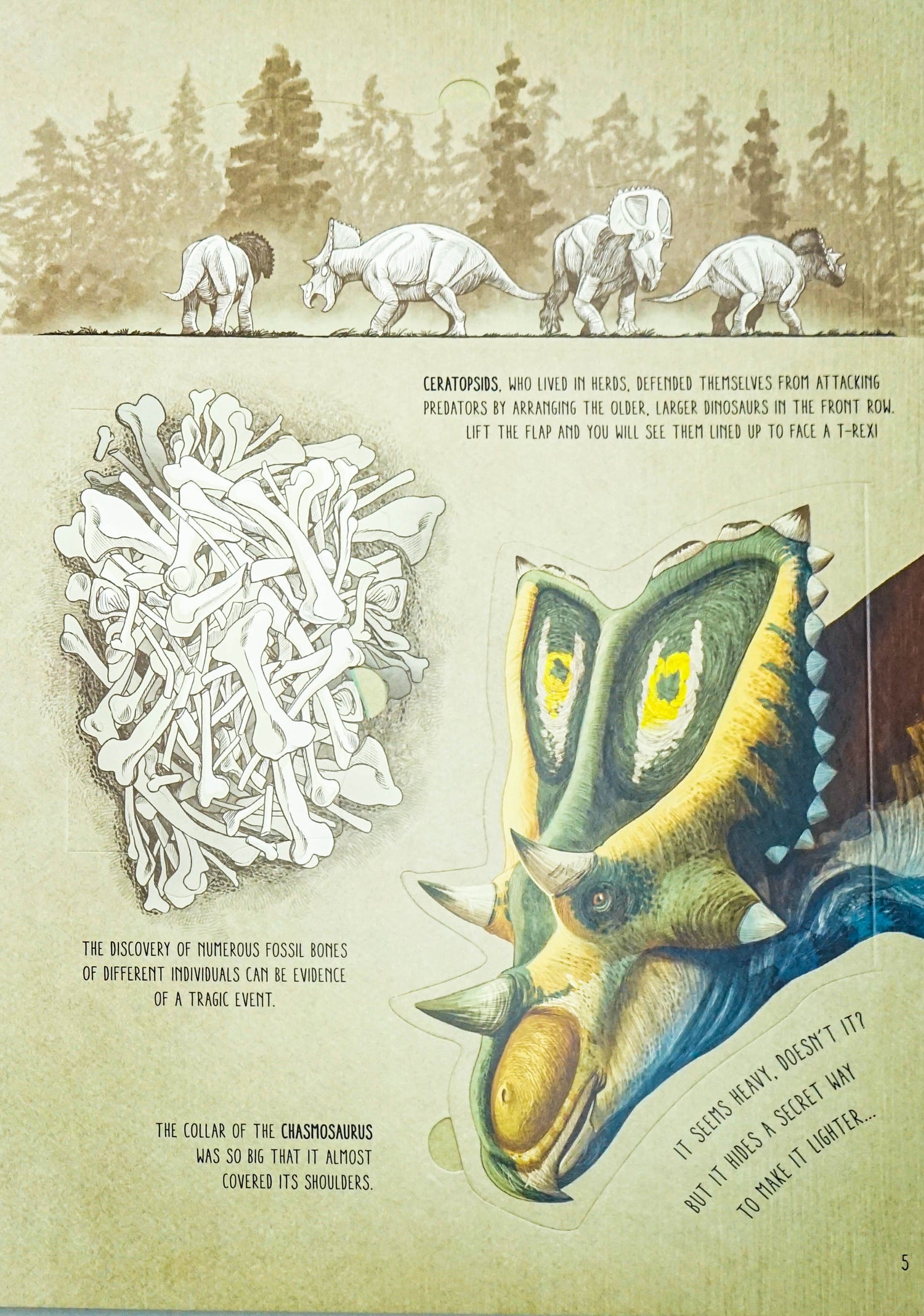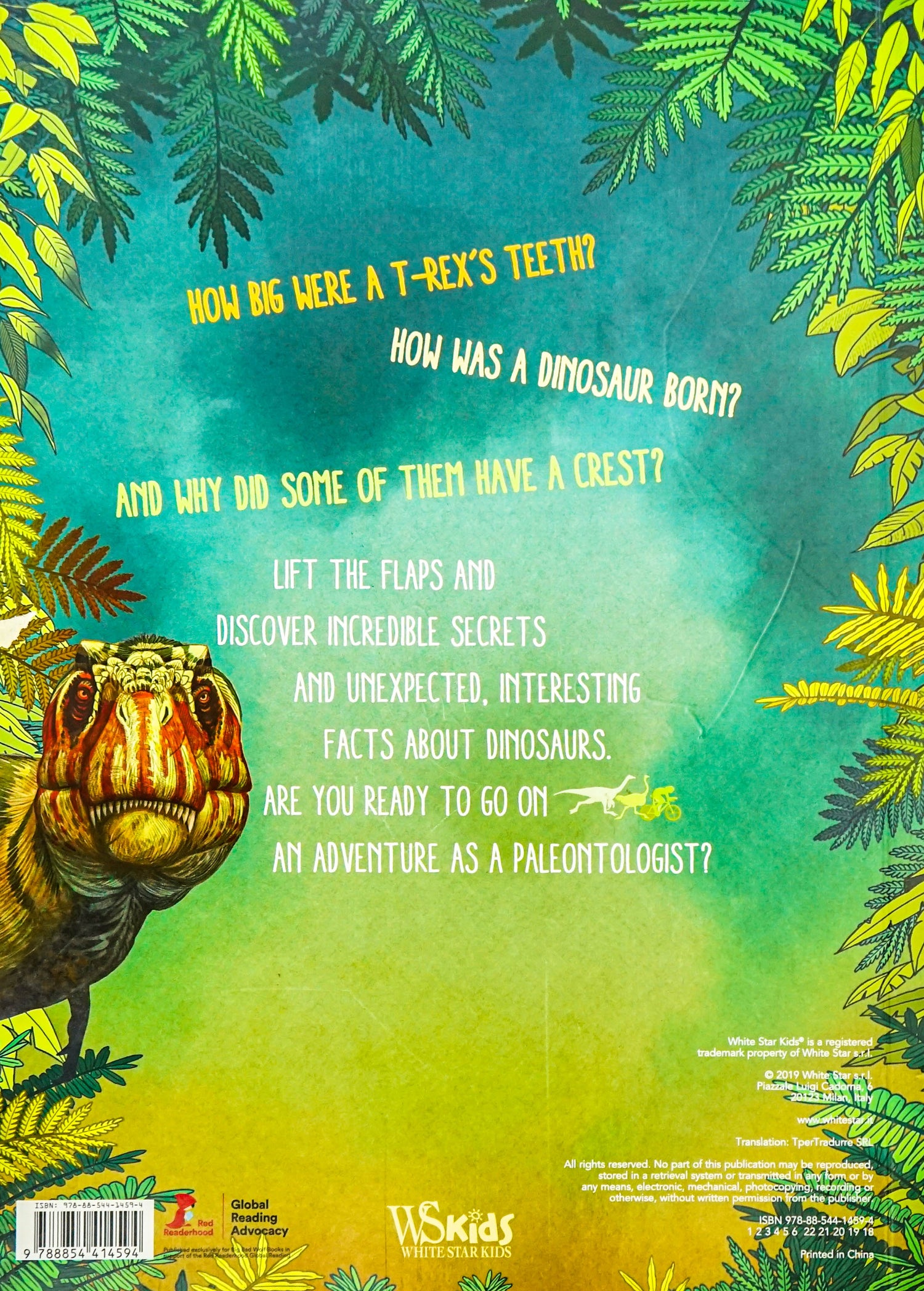 We all love dinosaurs. Now, lift the flaps to find out more about them—their skin, bones, teeth, and other legendary characteristics. Examine some of the most popular species, including the T-rex and Triceratops, along with the Parasaurolophus, whose crest had acoustic powers, and the Maiasaura, the “good mother.” Every dinosaur appears next to a picture of a human, in order to reveal its relative size.
