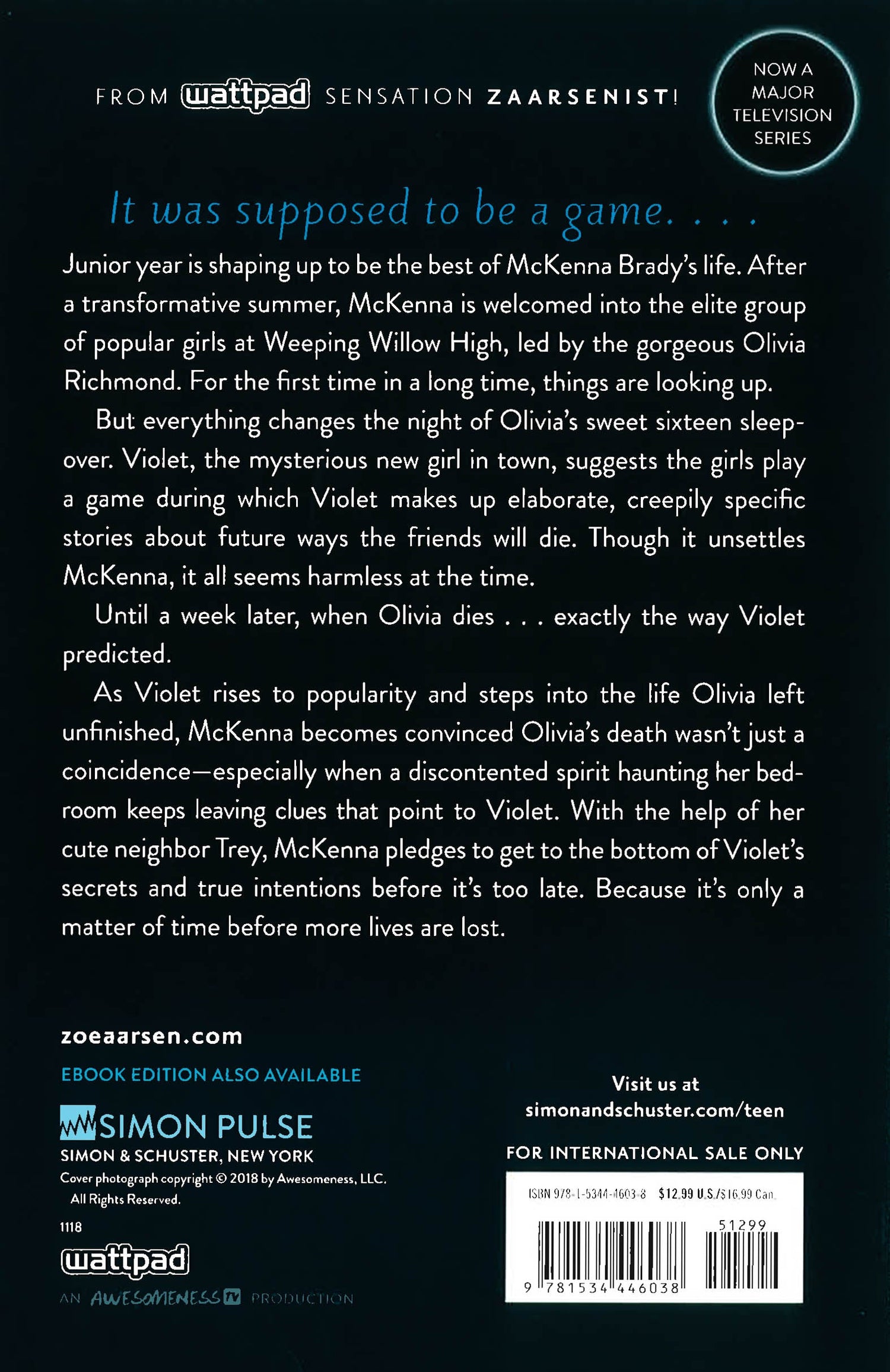 Riverdale meets Final Destination in this fast-paced and deliciously creepy novel about an innocent game that turns deadly at a high school sleepover.It was supposed to be a game... Junior year is shaping up to be the best of McKenna Brady's life. After a transformative summer, McKenna is welcomed into the elite group of popular girls at Weeping Willow High, led by the gorgeous Olivia Richmond. For the first time in a long time, things are looking up. But everything changes the night of Olivia's Sweet Sixteen sleepover. Violet, the mysterious new girl in town, suggests the girls play a game during which Violet makes up elaborate, creepily specific stories about the violent ways the friends will die. Though it unsettles McKenna, it all seems harmless at the time. Until a week later, when Olivia dies...exactly as Violet predicted. As Violet rises to popularity and steps into the life Olivia left unfinished, McKenna becomes convinced Olivia's death wasn't just a coincidence, especially when a ghost haunting her bedroom keeps leaving clues that point to Violet. With the help of her cute neighbor, Trey, McKenna pledges to get to the bottom of Violet's secrets and true intentions before it's too late. Because it's only a matter of time before more lives are lost.