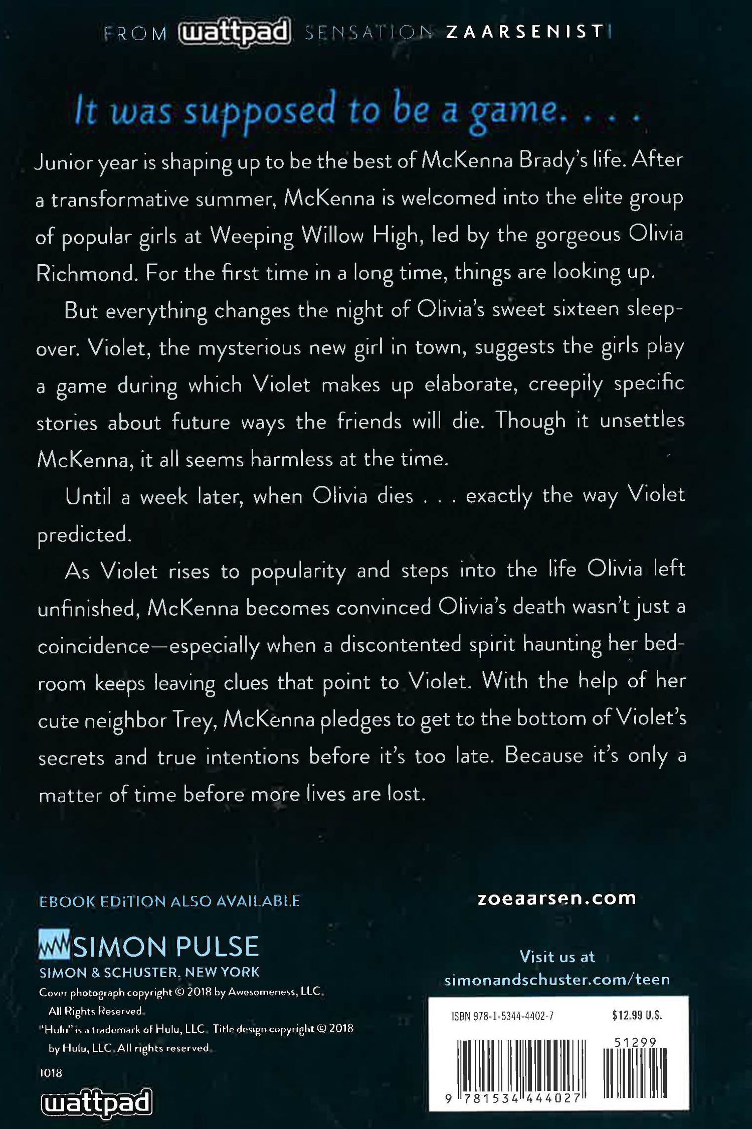 Junior year is shaping up to be the best of McKenna Brady’s life. After a transformative summer, McKenna is welcomed into the elite group of popular girls at Weeping Willow High, led by the gorgeous Olivia Richmond. For the first time in a long time, things are looking up.But everything changes the night of Olivia’s Sweet Sixteen sleepover. Violet, the mysterious new girl in town, suggests the girls play a game during which Violet makes up elaborate, creepily specific stories about the violent ways the friends will die. Though it unsettles McKenna, it all seems harmless at the time.Until a week later, when Olivia dies . . . exactly as Violet predicted.As Violet rises to popularity and steps into the life Olivia left unfinished, McKenna becomes convinced Olivia’s death wasn’t just a coincidence, especially when a ghost haunting her bedroom keeps leaving clues that point to Violet. With the help of her cute neighbor, Trey, McKenna pledges to get to the bottom of Violet’s secrets and true intentions before it’s too late. Because it’s only a matter of time before more lives are lost.
