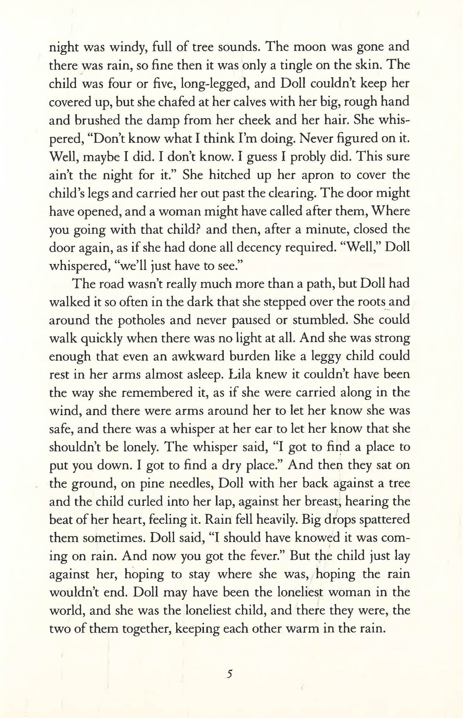 Neglected as a toddler, Lila was rescued by Doll, a canny young drifter, and brought up by her in a hardscrabble childhood. Together they crafted a life on the run, living hand to mouth with nothing but their sisterly bond and a ragged blade to protect them. Despite bouts of petty violence and moments of desperation, their shared life was laced with moments of joy and love. When Lila arrives in Gilead, she struggles to reconcile the life of her makeshift family and their days of hardship with the gentle Christian worldview of her husband which paradoxically judges those she loves.