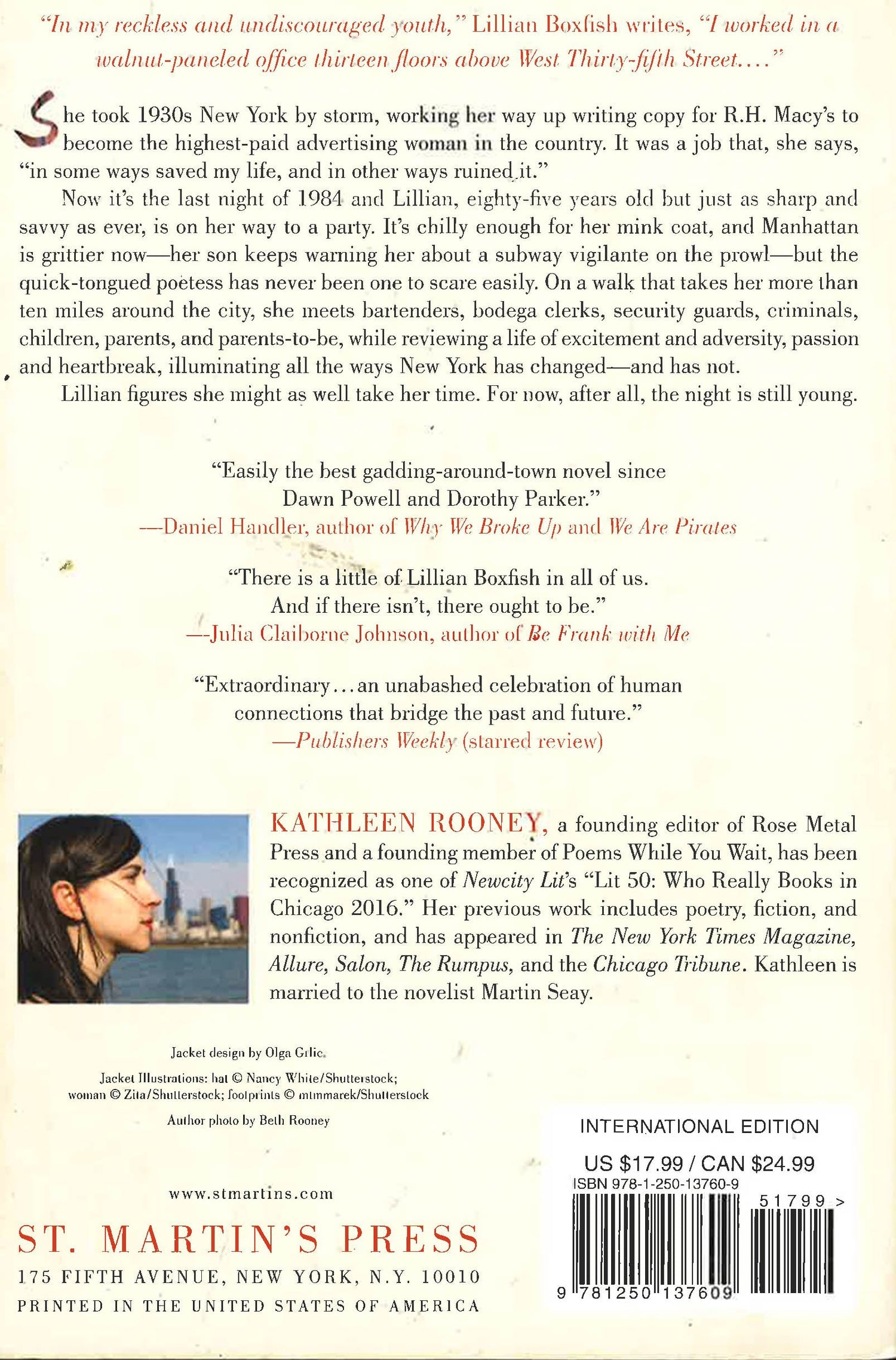 It's the last day of 1984, and 85-year-old Lillian Boxfish is about to take a walk. As she crosses the unsafe landscape of a run-down Manhattan, a city anxious after an attack by a still-at-large subway vigilante, she encounters bartenders, bodega clerks, chauffeurs, security guards, bohemians, criminals, children, parents, and parents-to-be-in surprising moments of generosity and grace. As she strolls, she recalls a long and eventful life that included a brief reign as the highest-paid advertising woman in America, cut short by marriage, motherhood, divorce, and a breakdown. A love letter to city life no matter how shiny or sleazy, Lillian Boxfish Takes a Walk by Kathleen Rooney paints a portrait of a remarkable woman across the canvas of a changing America: from the Jazz Age to the onset of the AIDS epidemic, from the Great Depression to the birth of hip-hop.