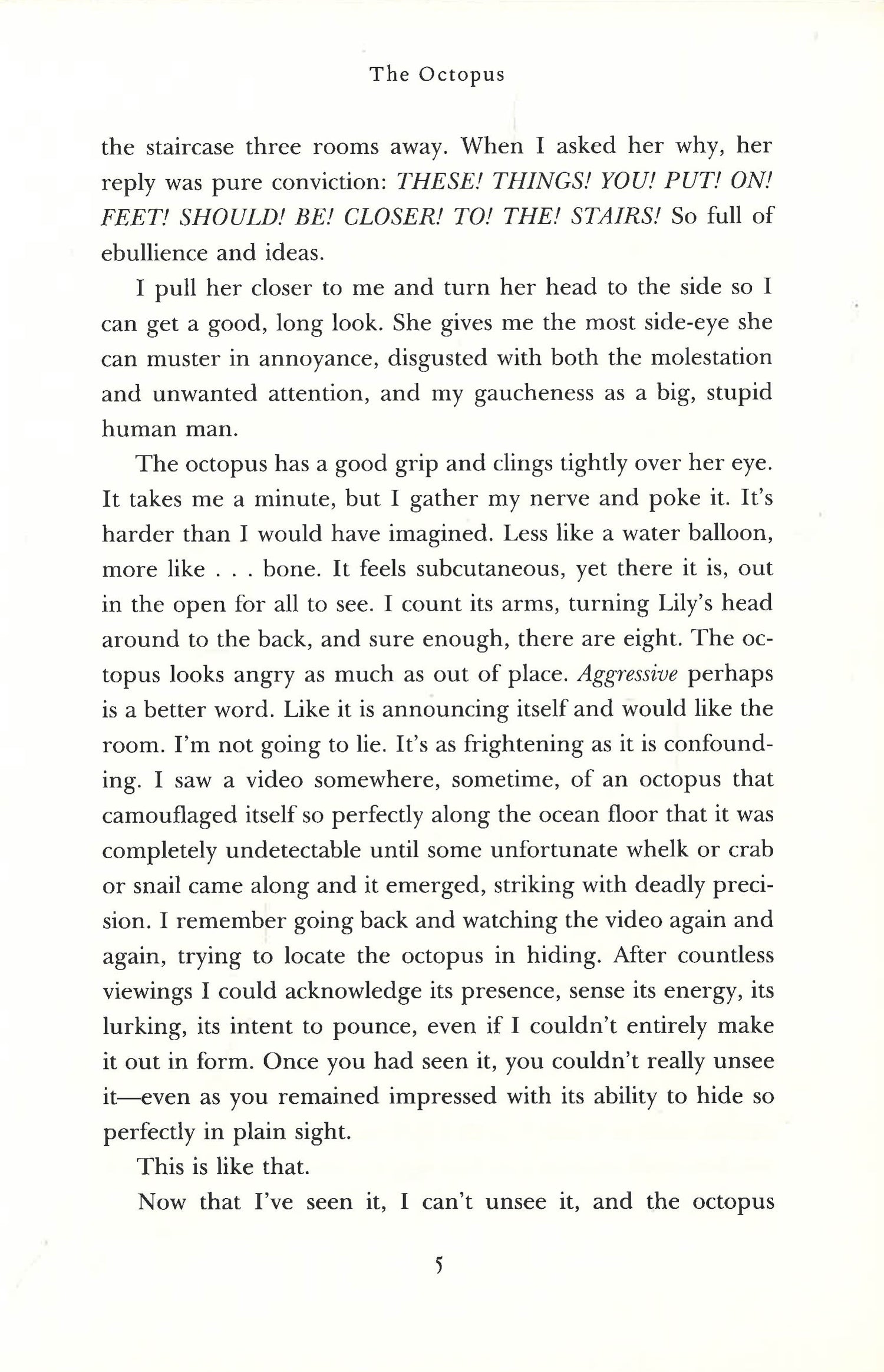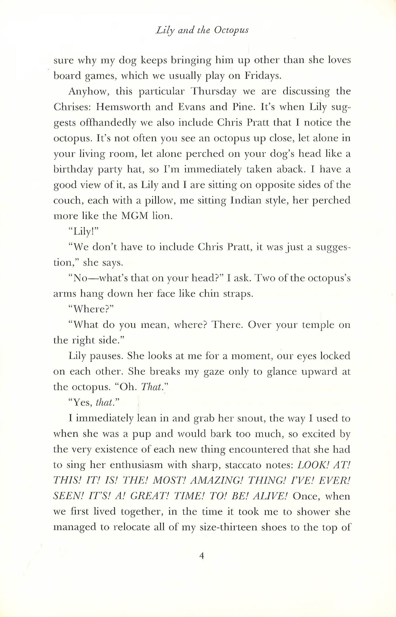 A revelatory literary novel reminiscent of The Life of Pi and The Art of Racing in the Rain, a struggling writer finds himself unable to open up to the possibility of love - except through the companionship of his aging dachshund Lily. But with the unexpected arrival of a small octopus that affixes itself to Lily's head, it soon becomes clear the invader is strangling the life from his dog and threatening the bond with his one true friend.