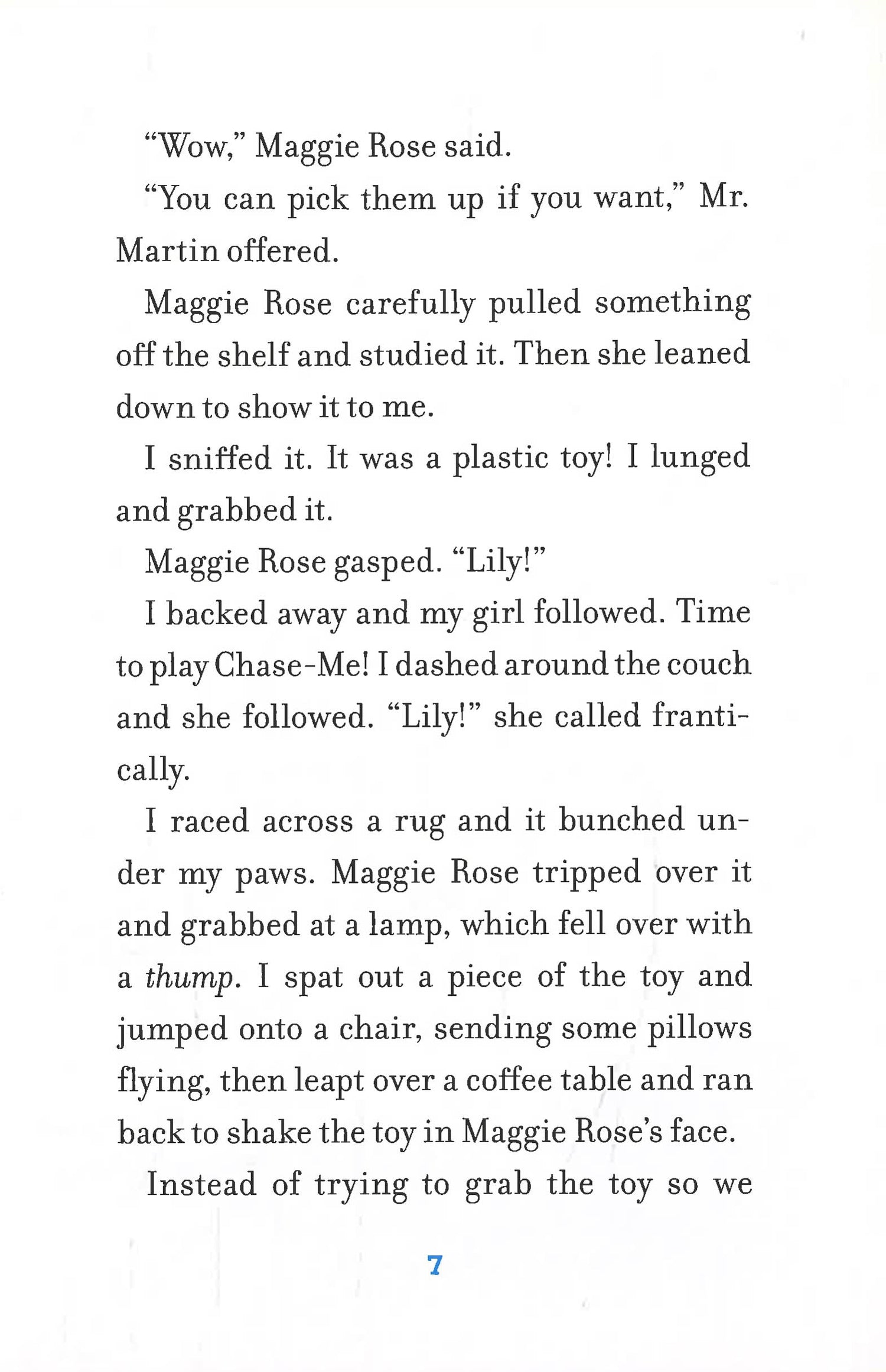 Lily lives with her girl, Maggie Rose. Once a stray, Lily was rescued by the kind people at the animal shelter run by Maggie Rose's mom. Now she has a very important purpose: to rescue other animals in trouble.