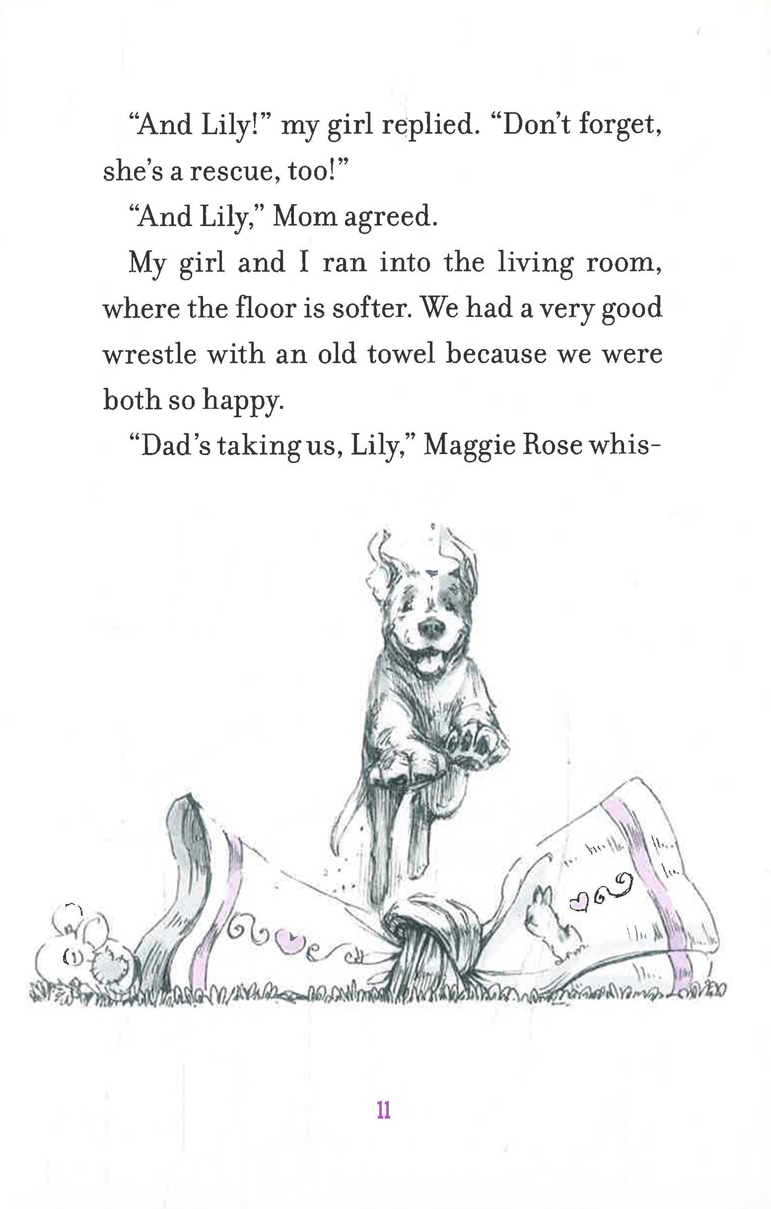 Lily lives with her girl, Maggie Rose. Once a stray, Lily was rescued by the kind people at the animal shelter run by Maggie Rose's mom. Now she has a very important purpose: to rescue other animals in trouble.
